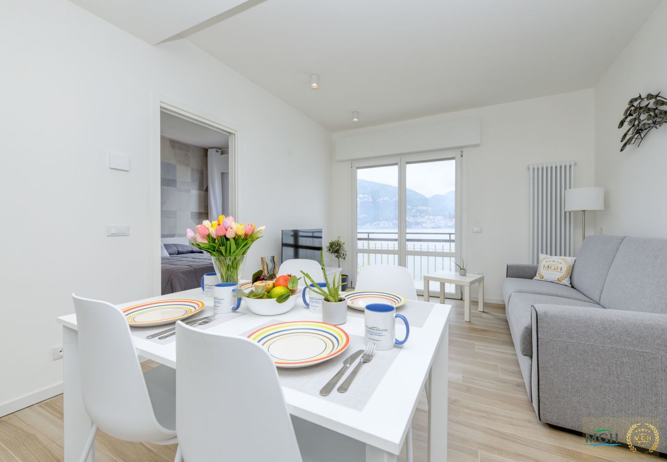La camera matrimoniale, spaziosa e luminosa, regala una magnifica vista sul lago, creando fin dal risveglio una sensazione di calma e meraviglia. Accanto, una piccola ma comoda cameretta con letto singolo offre uno spazio intimo e perfetto per i più piccoli. Il bagno, moderno e ben attrezzato, dispone di una comoda doccia, asciugacapelli e tutti gli accessori necessari per una vacanza senza pensieri.