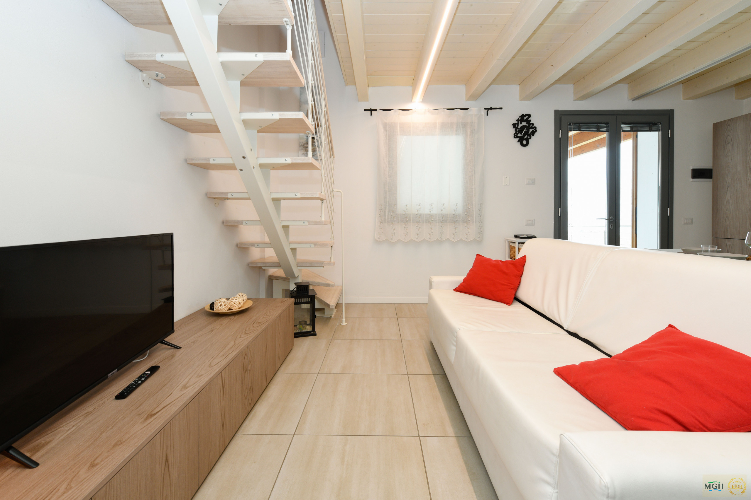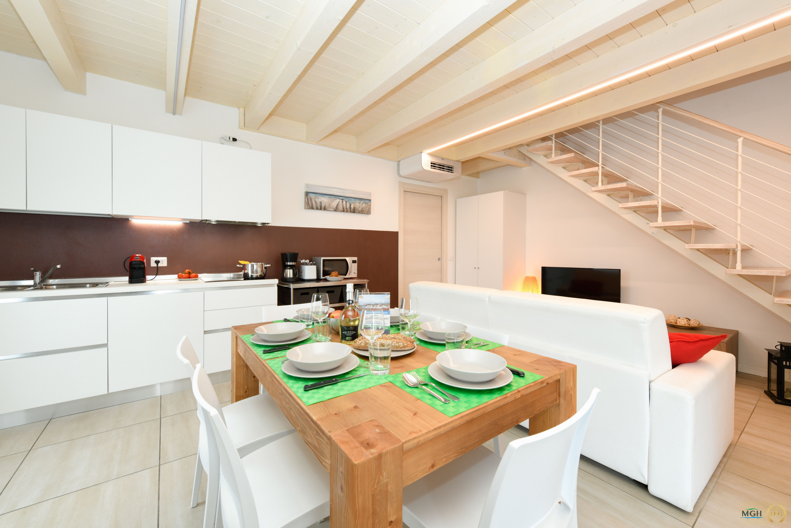 La zona giorno, ampia e luminosa, include una cucina completamente attrezzata con lavastoviglie, un accogliente soggiorno con divano e TV e un balconcino privato con affaccio sul lago, perfetto per un aperitivo al tramonto.