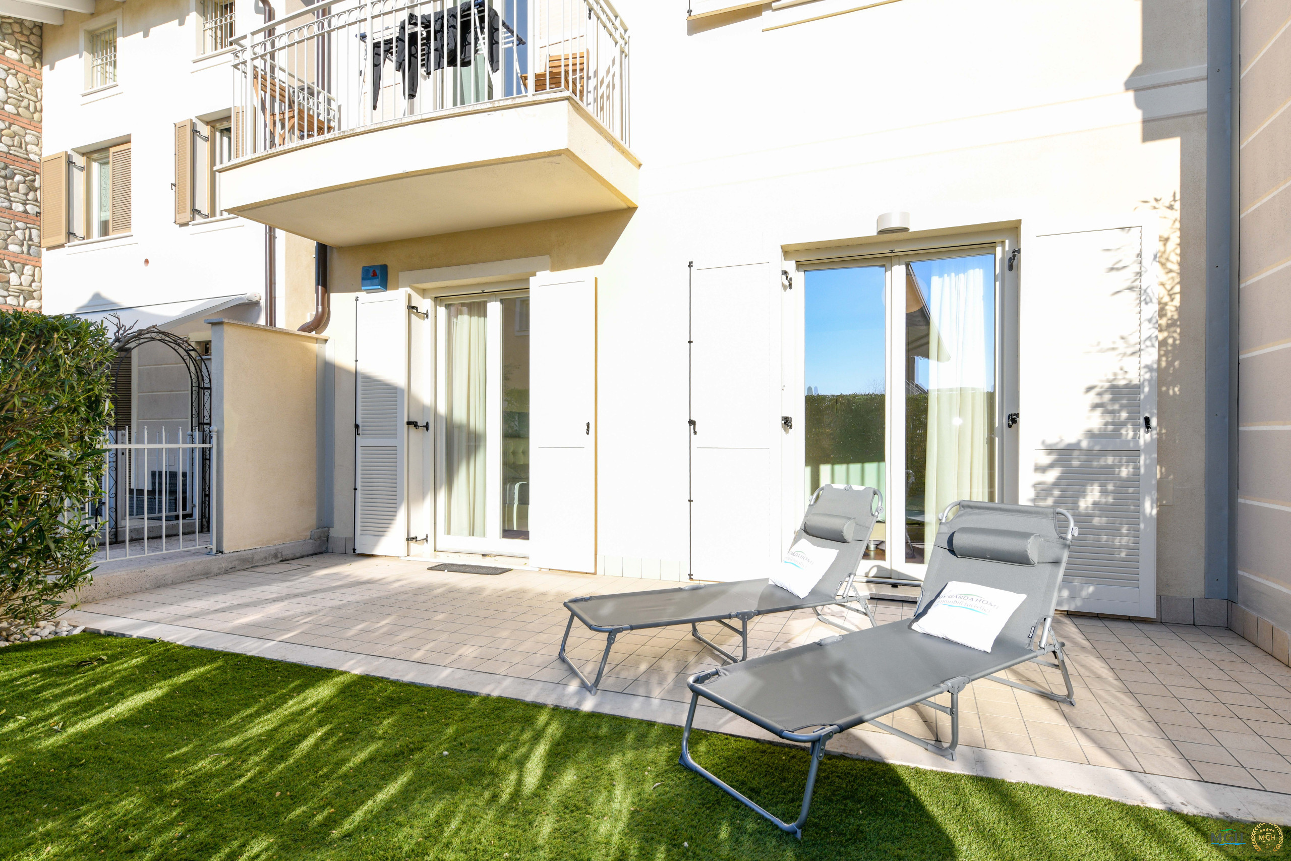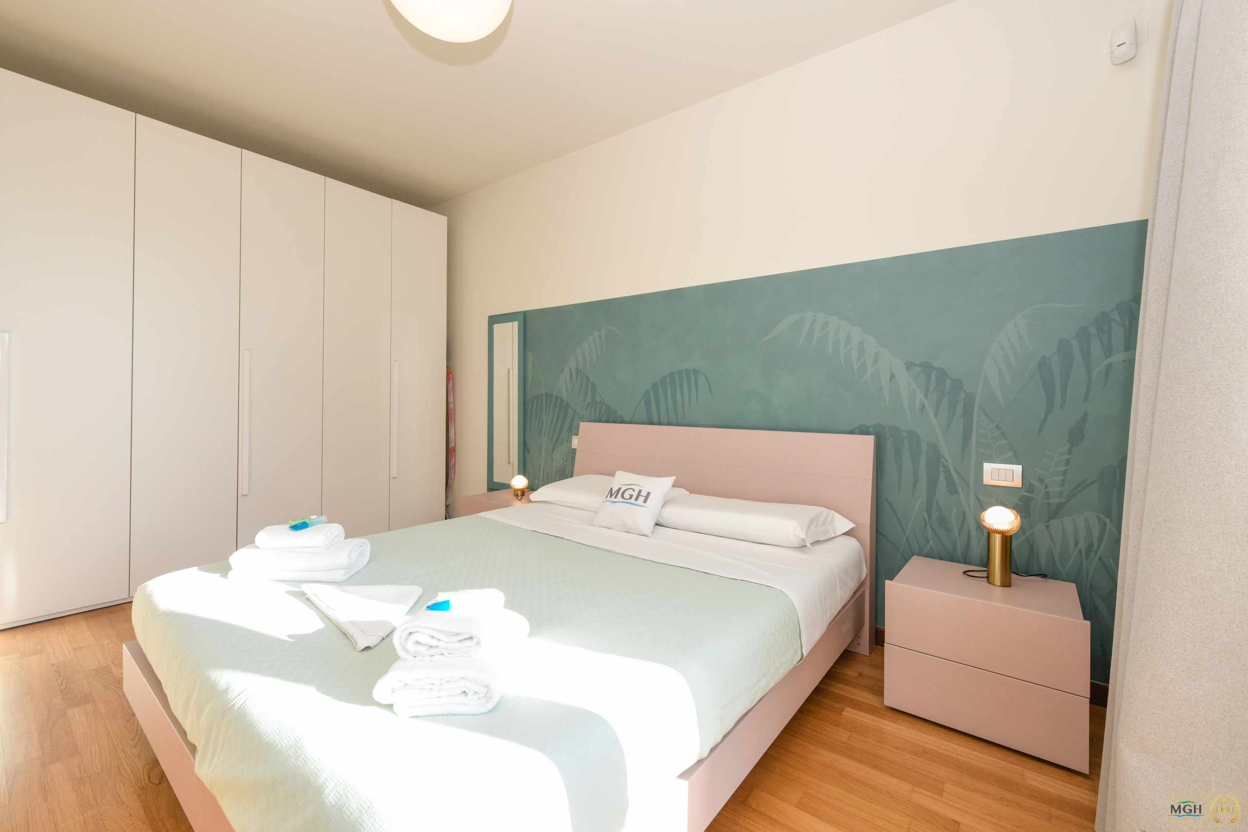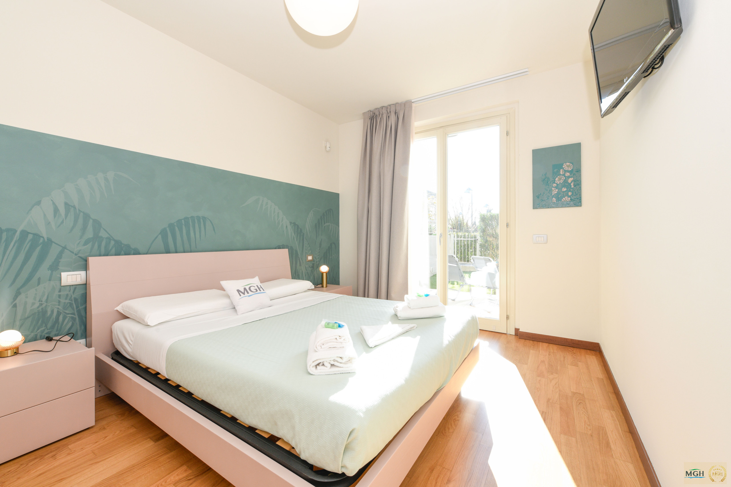 L’appartamento si sviluppa su un unico livello a piano terra ed è pensato per offrire comfort e funzionalità. Dispone di due luminose camere matrimoniali, arredate in stile moderno, entrambe con accesso diretto al giardino sul retro, perfetto per momenti di tranquillità all’aria aperta.
