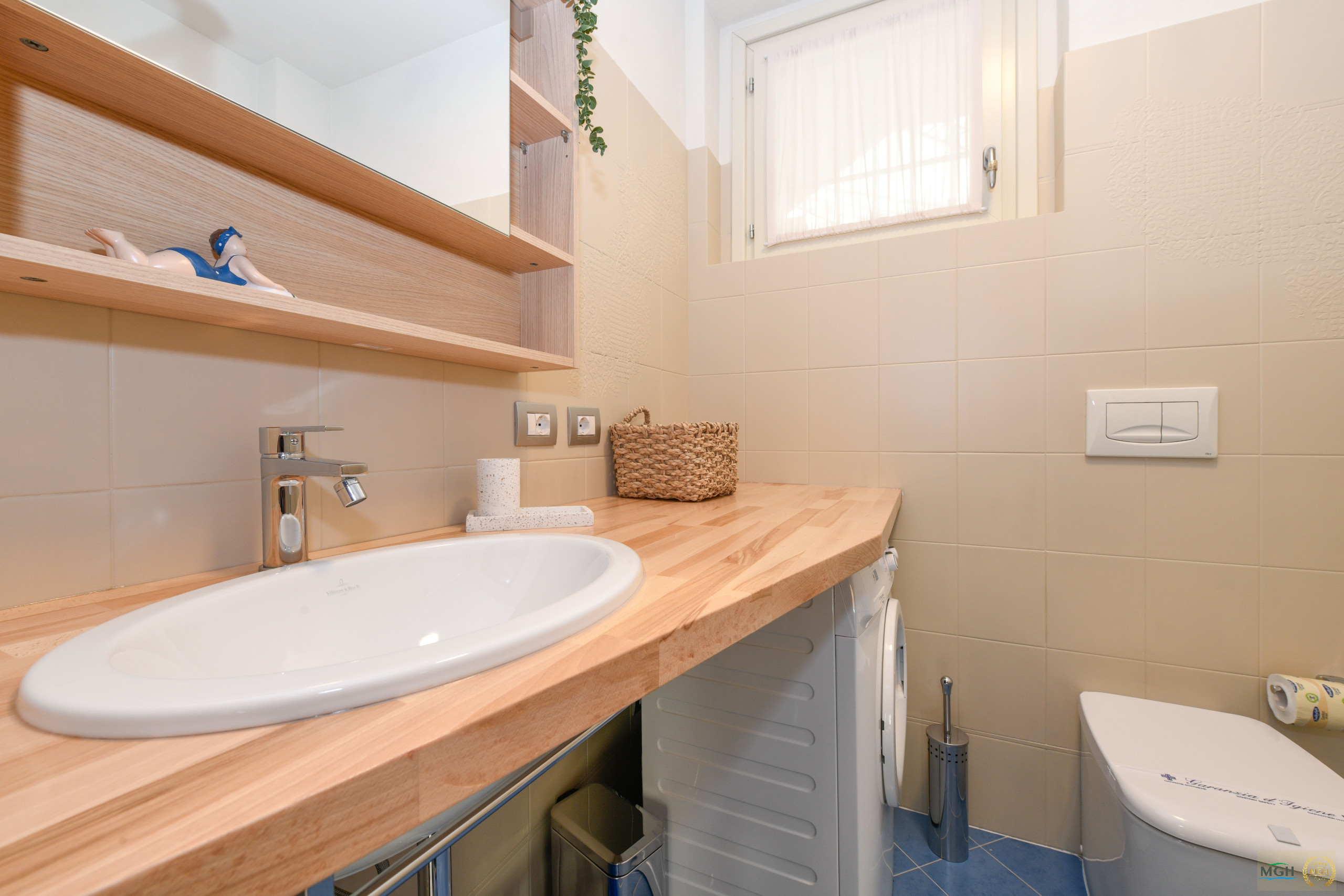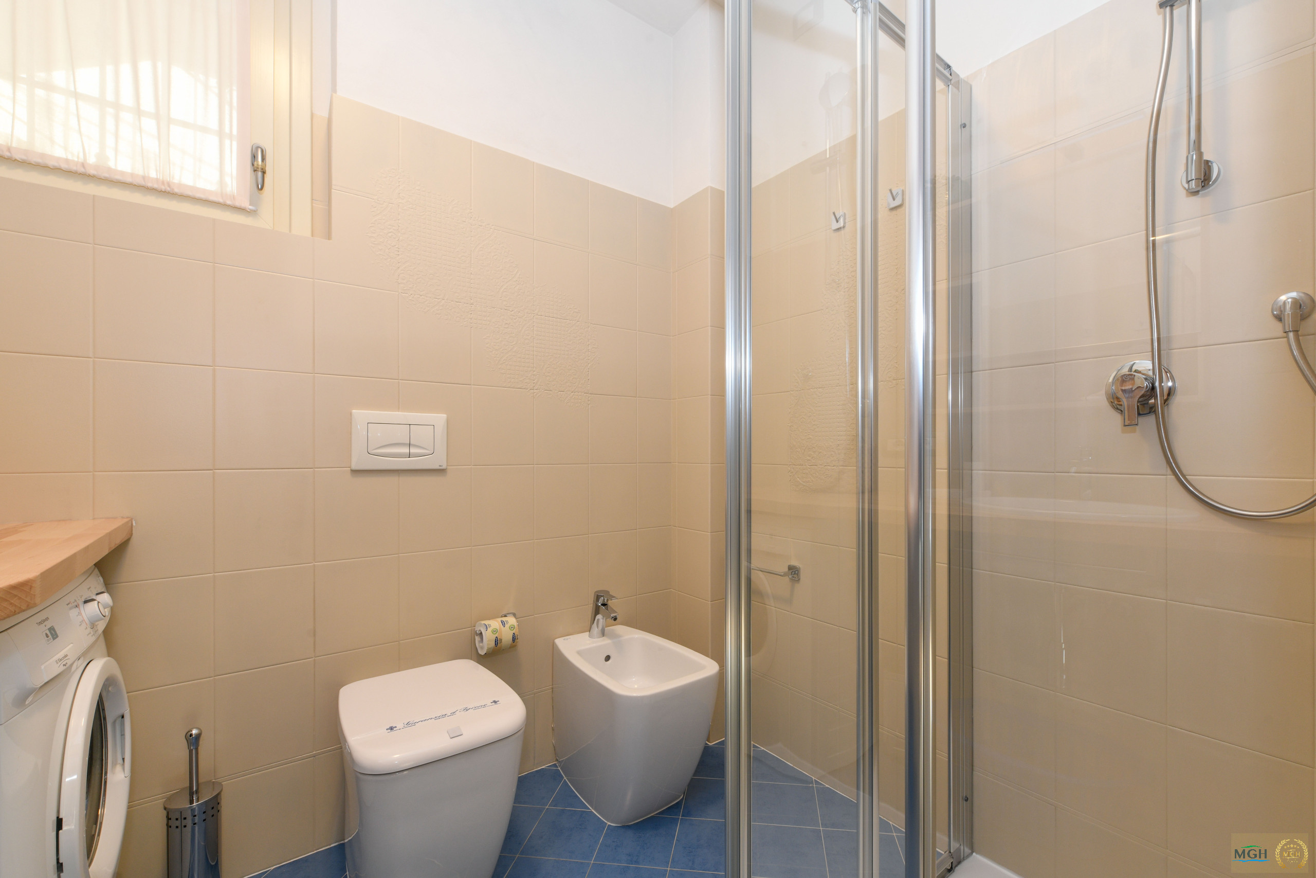Il bagno, moderno e funzionale, è dotato di doccia, asciugacapelli, lavatrice e tutti gli accessori necessari per un soggiorno senza pensieri.