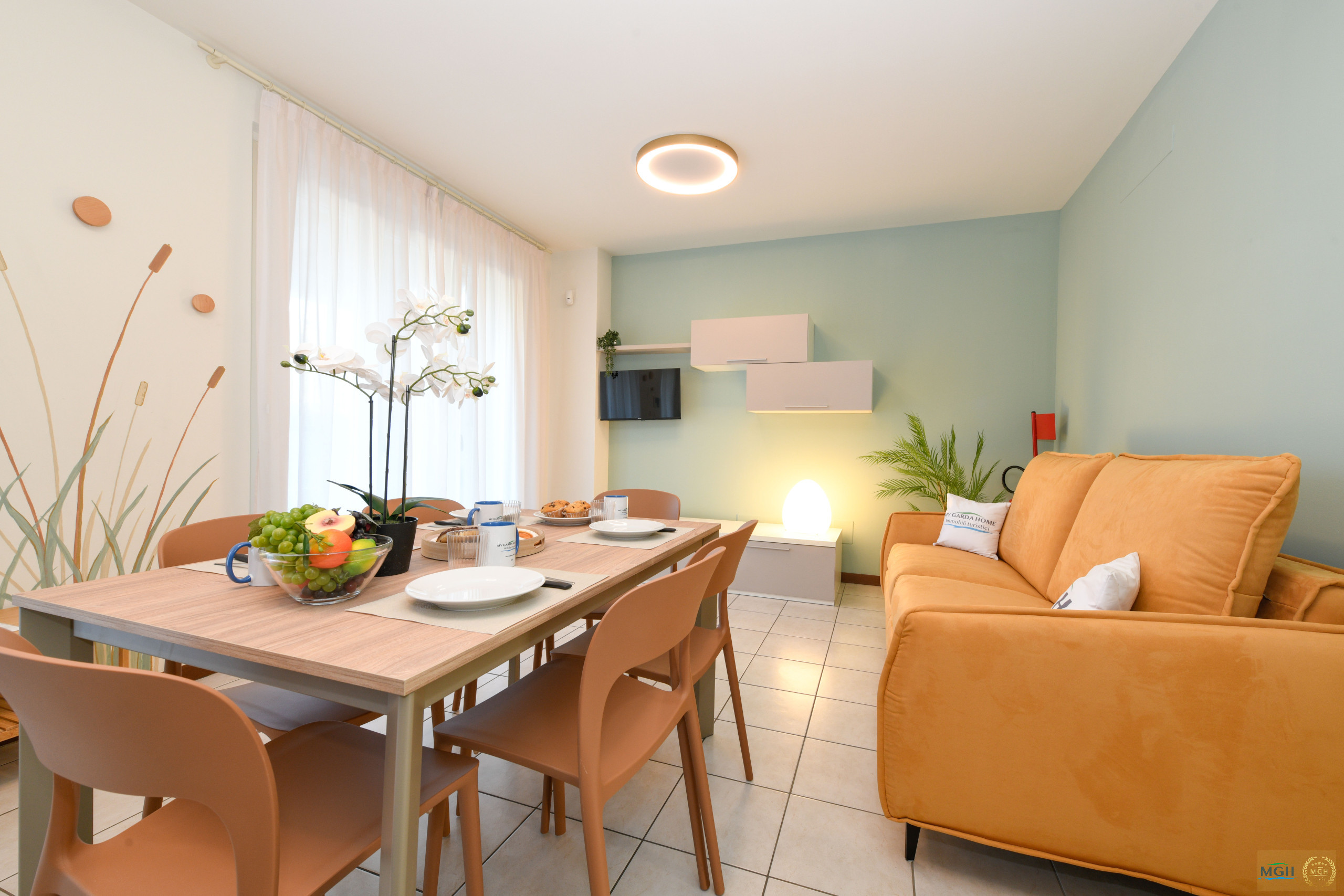 La zona giorno è ampia e accogliente, con un grande divano letto, TV a schermo piatto e una cucina a vista completamente attrezzata con frigorifero, congelatore, piano a induzione, forno, lavastoviglie, bollitore, tostapane e macchina del caffè. Completa l’ambiente un tavolo da pranzo ideale per condividere piacevoli momenti in compagnia.