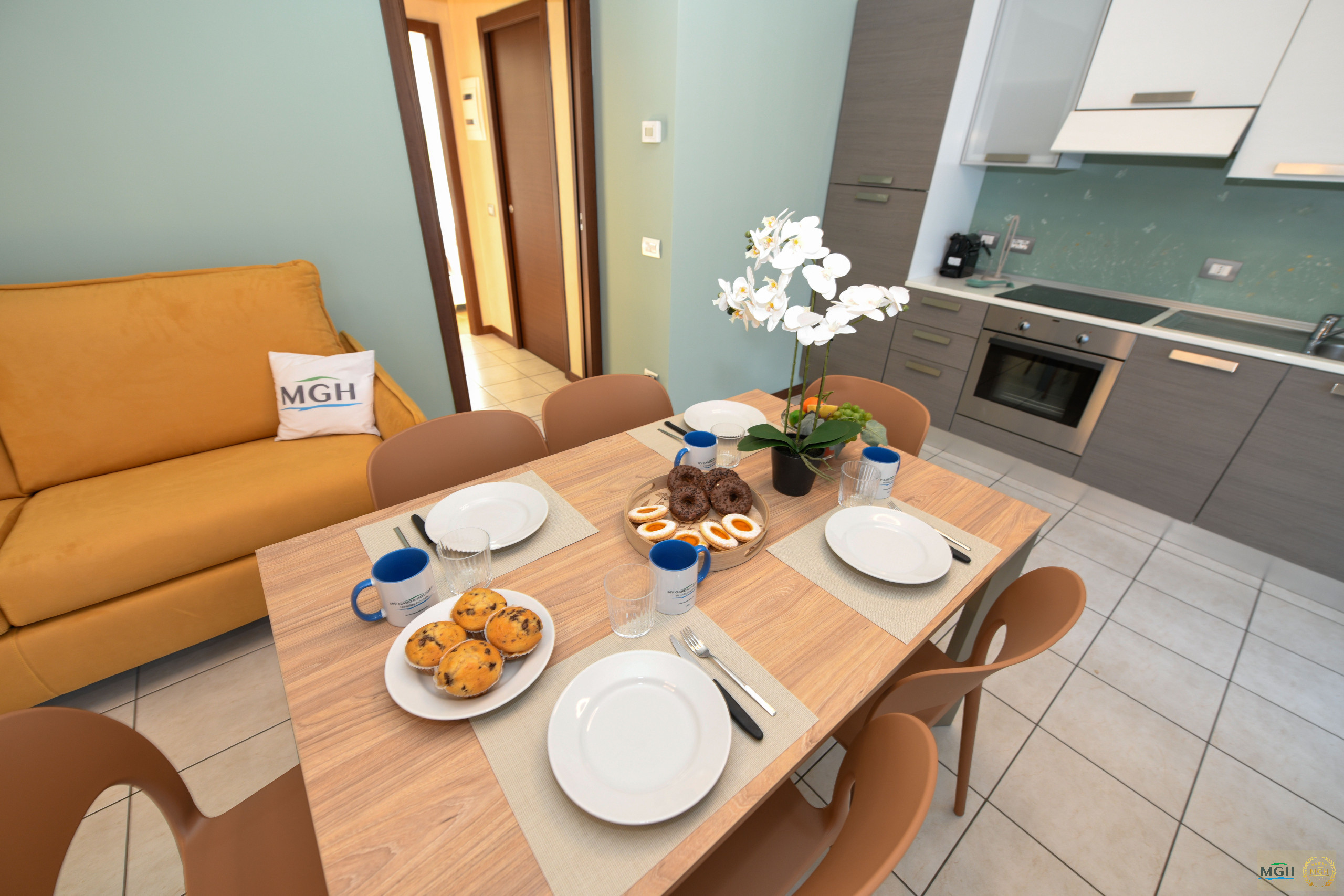 L’appartamento è dotato di tutti i comfort essenziali: aria condizionata, riscaldamento, connessione Wi-Fi e garage privato gratuito.