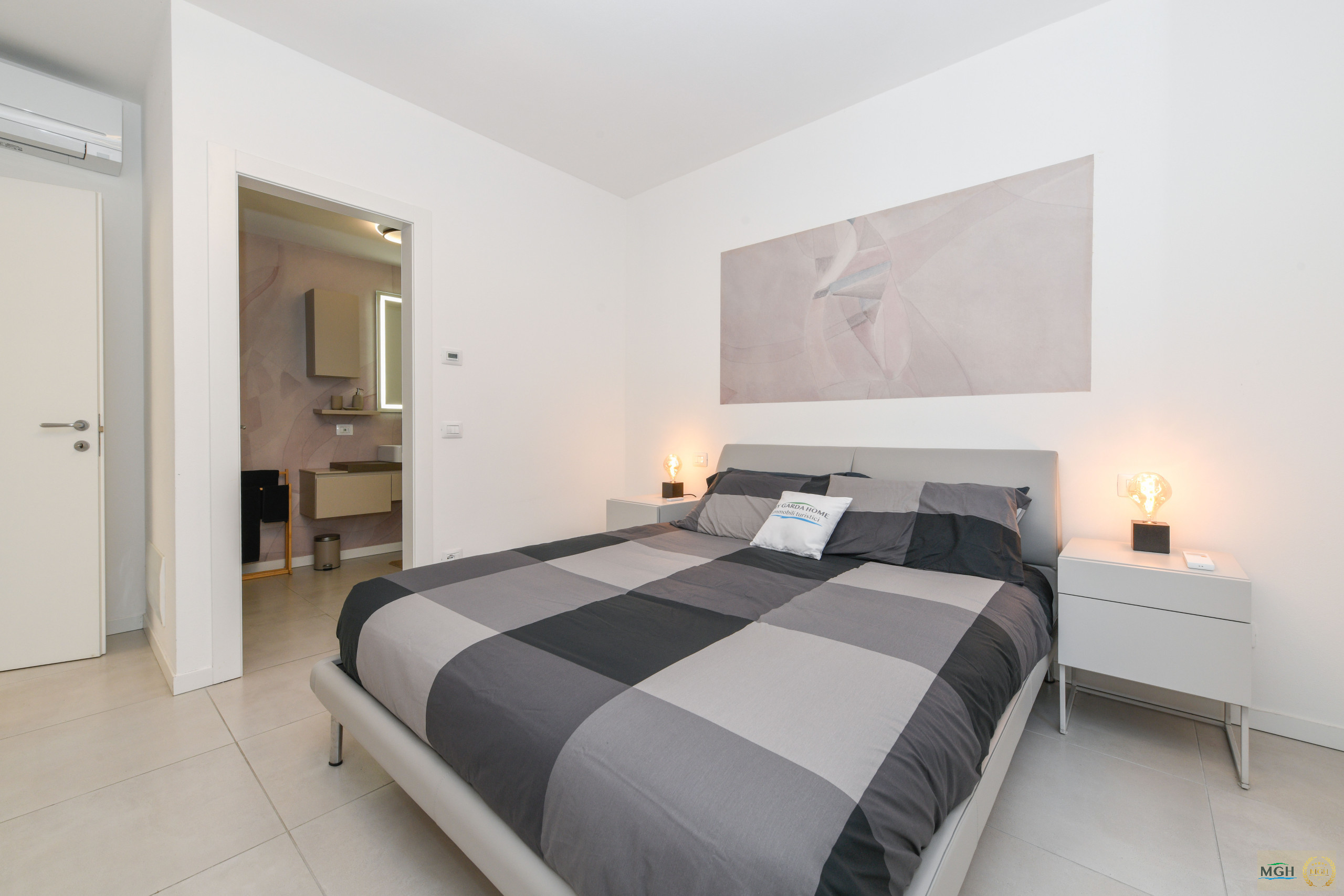 Dalla zona giorno si accede a una loggia coperta arredata con un’accogliente area relax e un tavolo perfetto per gustare colazioni o cene all’aperto in totale tranquillità.