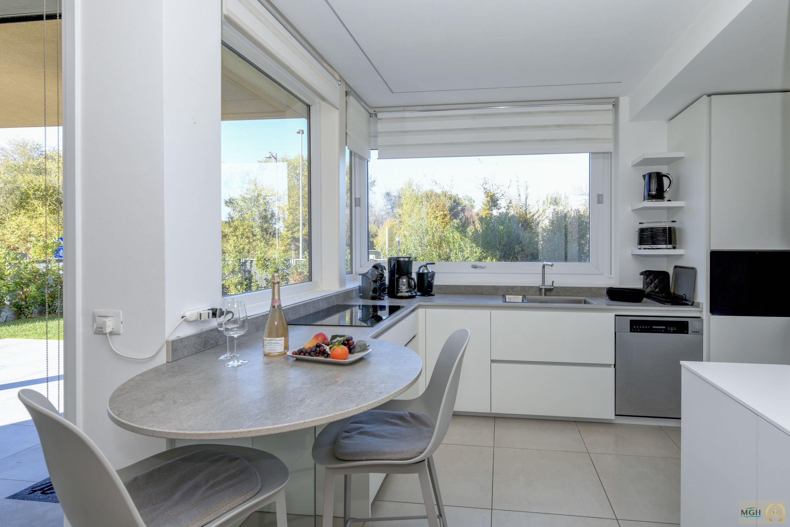 La zona giorno, ampia, luminosa e ben organizzata, comprende una cucina completamente attrezzata con frigorifero, congelatore, piano a induzione, forno, lavastoviglie, bollitore, tostapane, macchina del caffè e persino una cantinetta dei vini, un dettaglio elegante che rende unico l’ambiente. A completare la zona living, un grande tavolo da pranzo e un soggiorno con divano letto doppio e TV a schermo piatto.