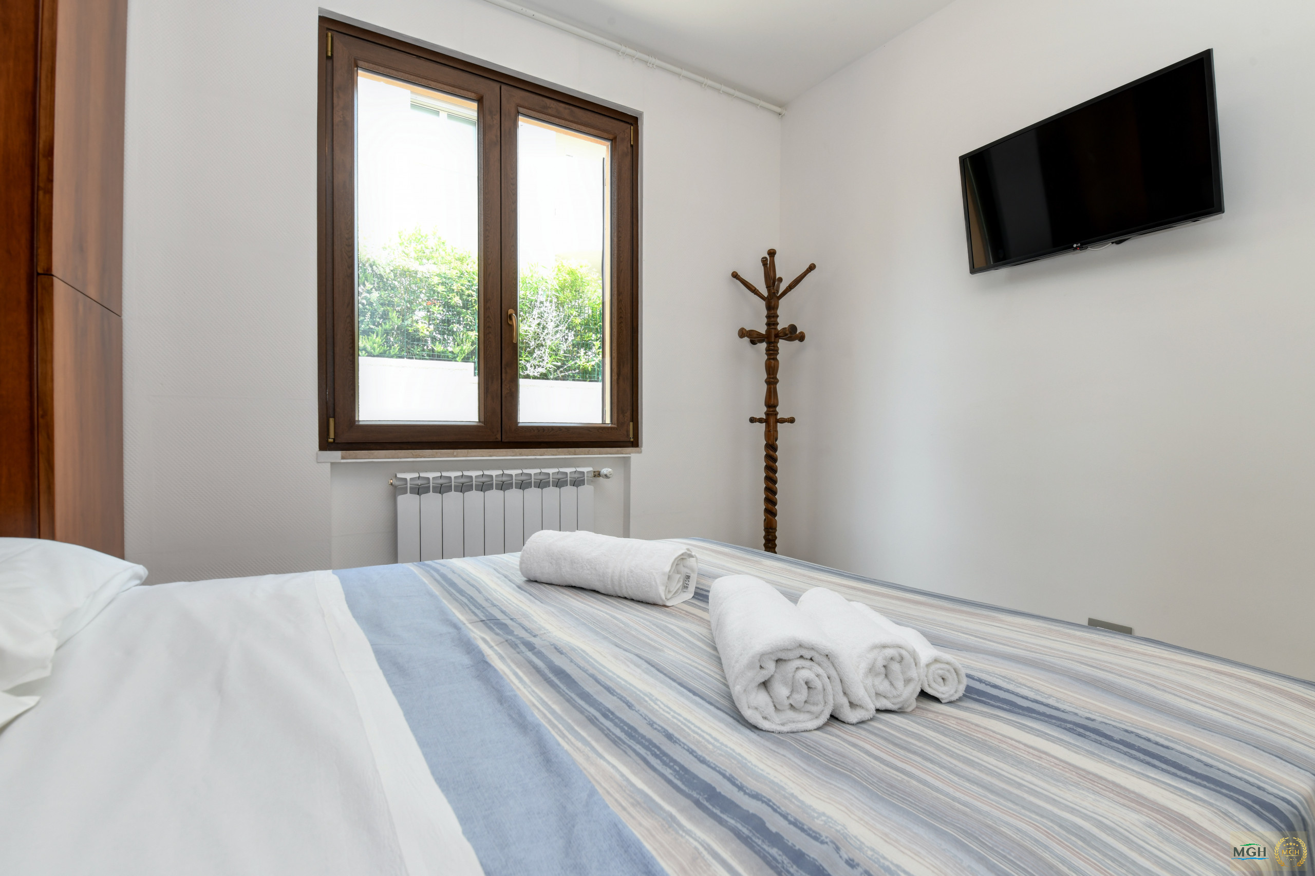 L'appartamento si trova al piano terra e dispone di una graziosa terrazza con zona pranzo. Un'altra zona pranzo è all'interno della cucina completamente attrezzata con lavastoviglie, piano cottura, forno e tutti gli utensili per cucinare. C'è un comodo divano e una Smart TV con canali internazionali. Il bagno è moderno e dispone di doccia, wc e bidet. C'è una lavatrice nel seminterrato. Il garage privato non è molto alto, ma limousine e station wagon ci stanno senza problemi.