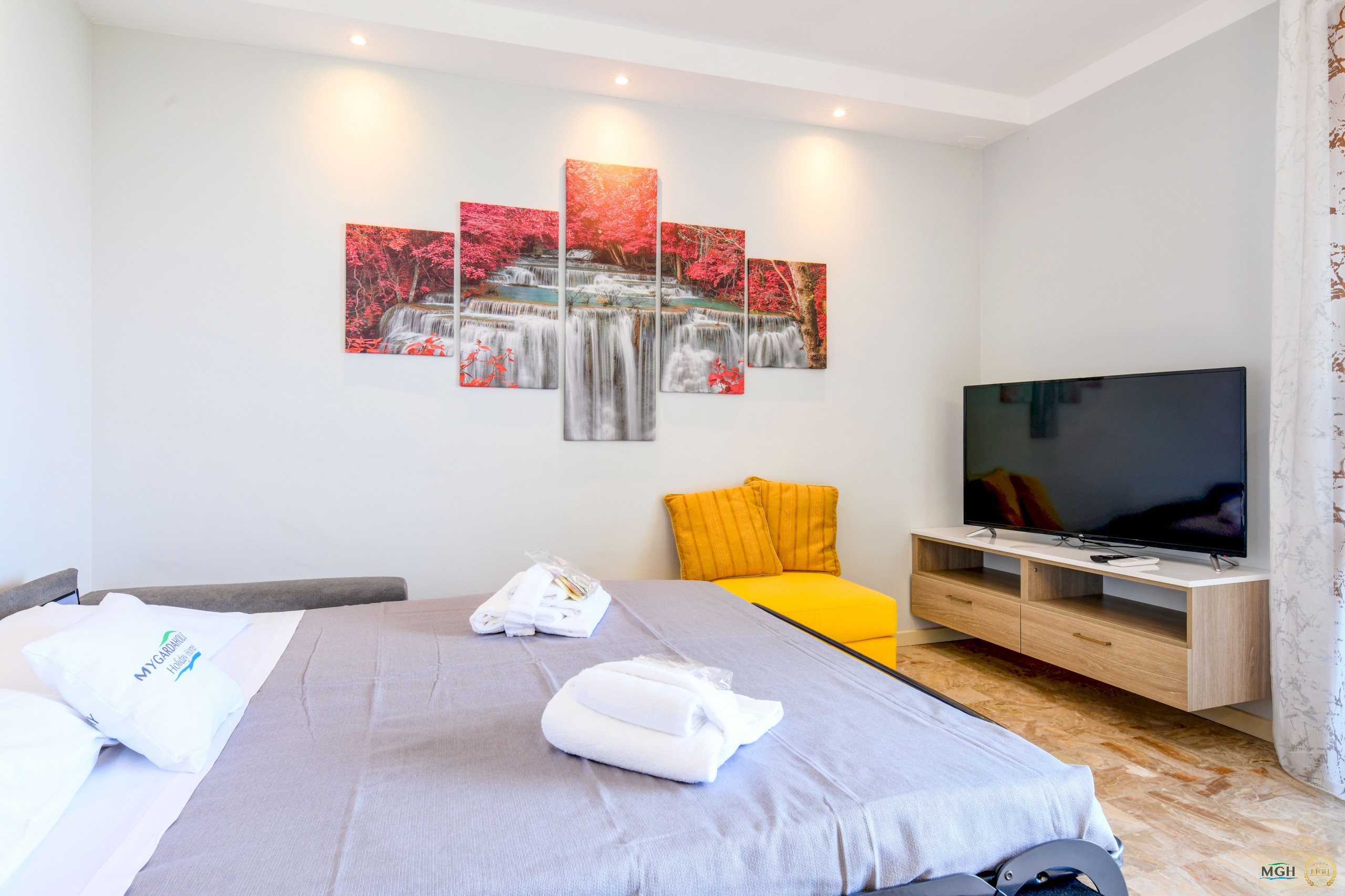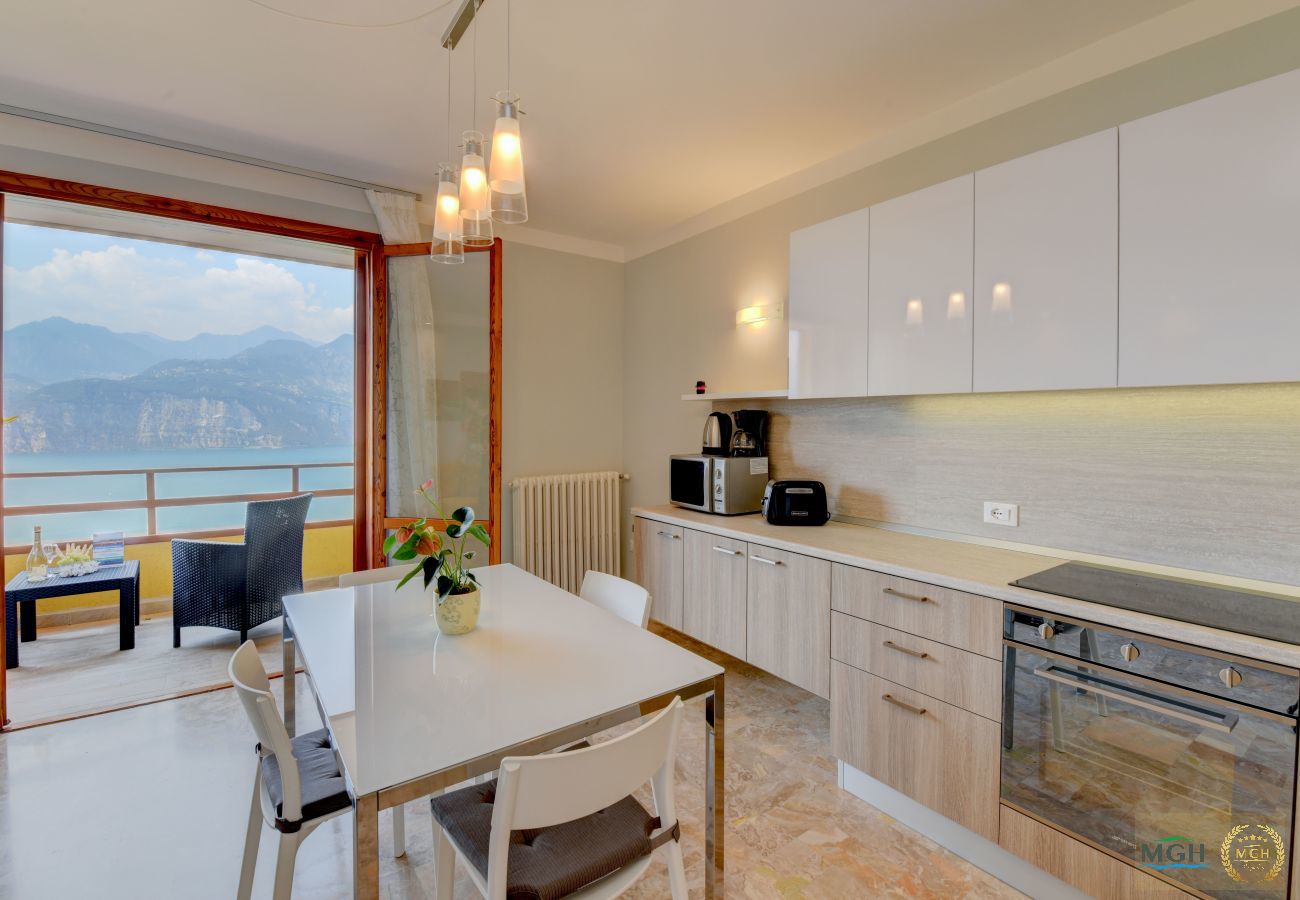 L'elegante appartamento è stato interamente ristrutturato nel 2019 e offre su circa 55m² 1 camera da letto matrimoniale, 1 bagno con doccia, WC, bidet e un luminoso soggiorno con divano letto matrimoniale e splendida vista sul lago. Da qui si accede al balcone.