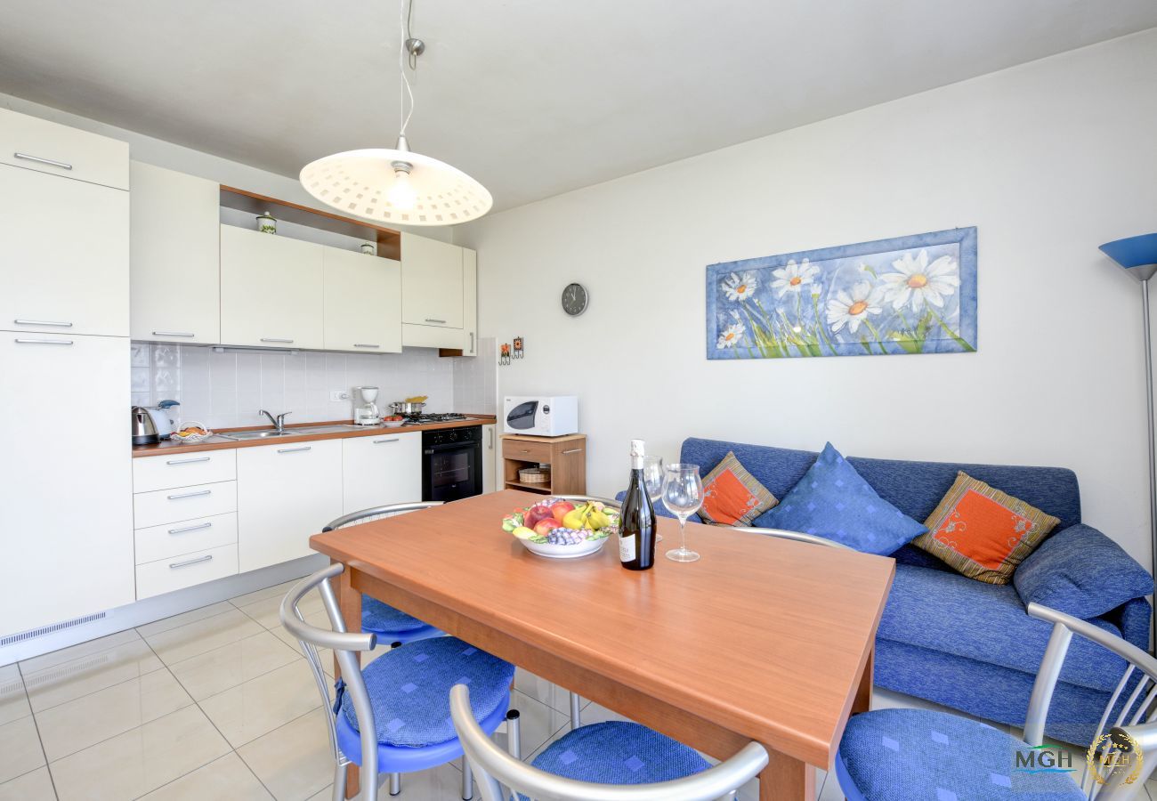 All'interno dell'immobile troviamo un soggiorno con cucina a vista illuminato da una grande vetrata dalla quale si può accedere alla bellissima terrazza che offre una vista lago eccezionale. Nella terrazza è possibile anche mangiare e rilassarsi grazie alla sua metratura generosa.