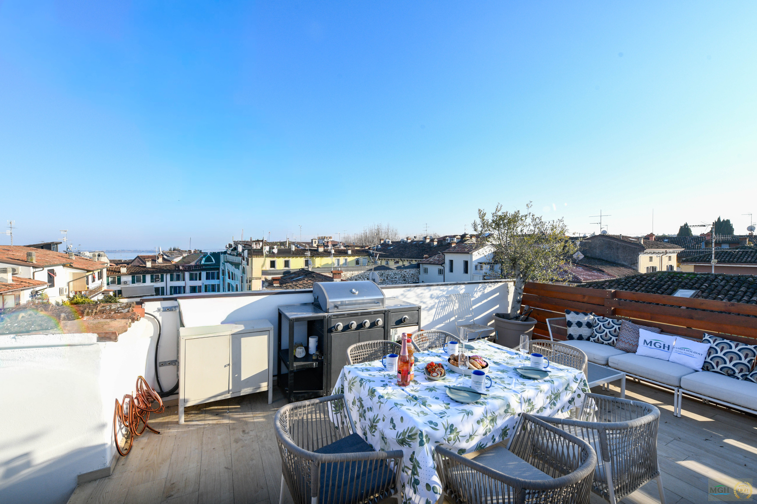 Uno degli elementi più suggestivi di questa proprietà è senza dubbio la grande terrazza vista lago, dotata di barbecue, uno spazio ideale per pranzi e cene all’aperto, momenti di convivialità o semplicemente per godersi i colori del tramonto sul lago. La terrazza rappresenta una vera estensione della casa, perfetta per vivere appieno l’atmosfera del Garda.