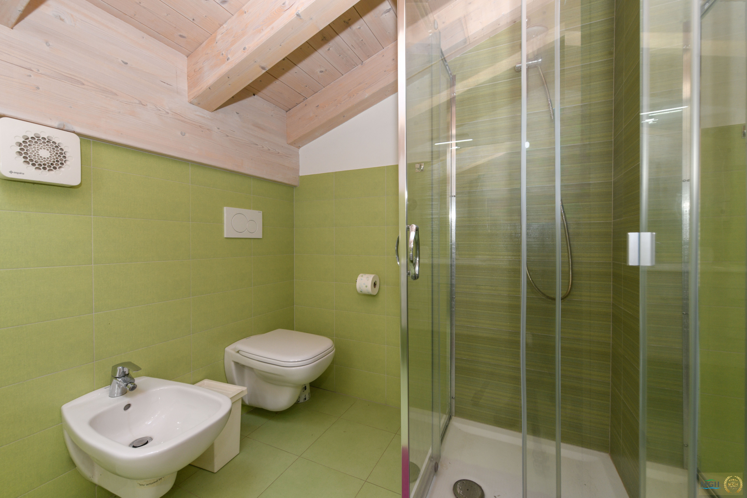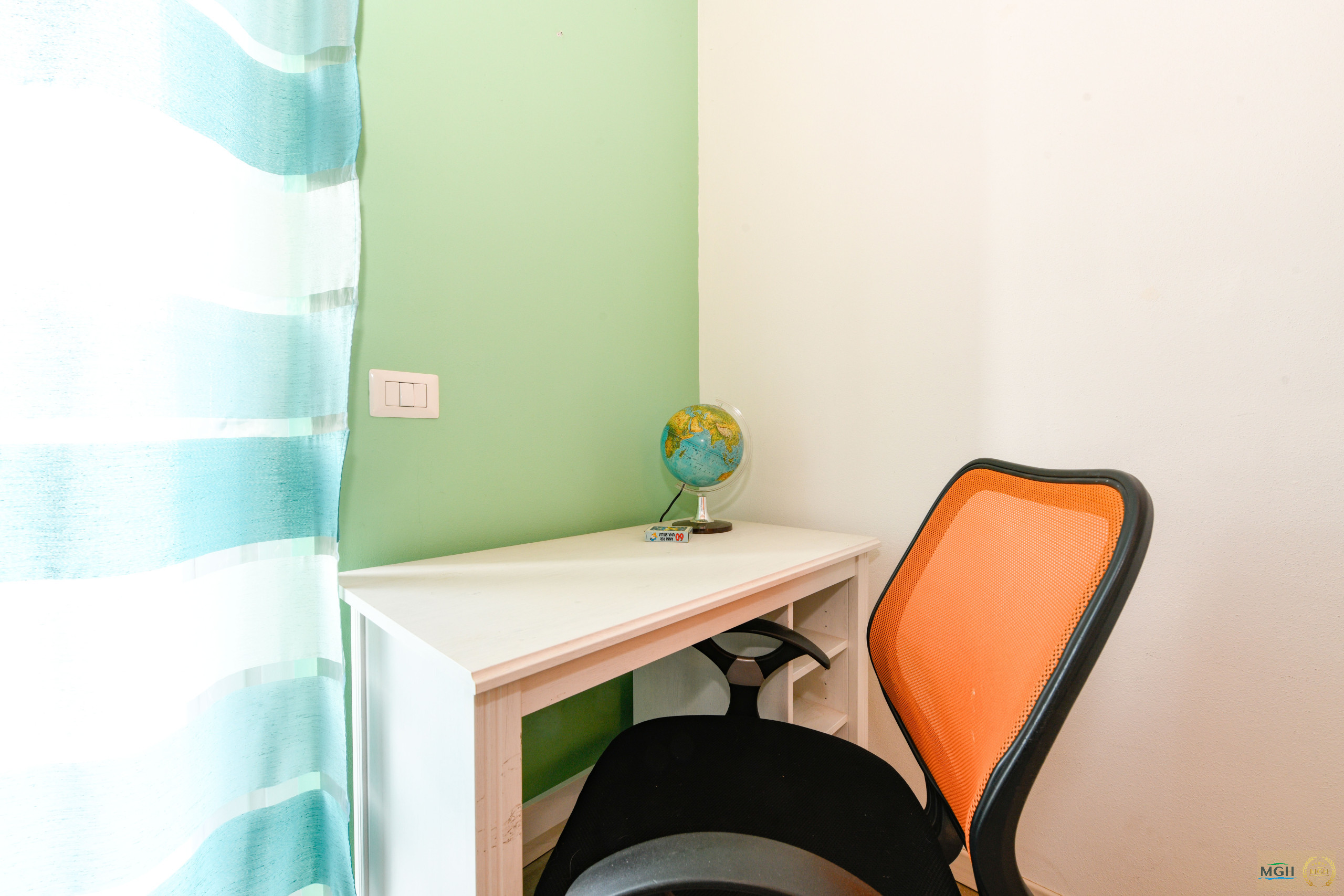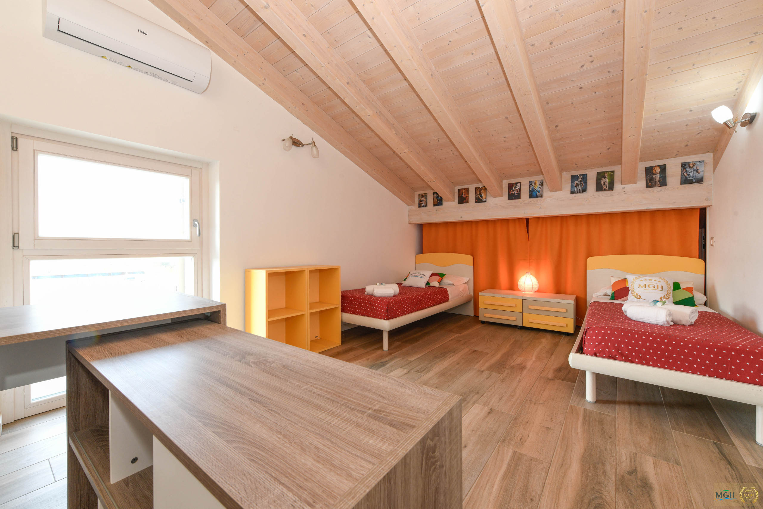 Dal soggiorno si accede al piano inferiore, dove si trova una camera ampia e confortevole con bagno privato e zona lavanderia completa di lavatrice e asciugatrice. Da qui è possibile raggiungere anche il comodo garage doppio. Salendo ai piani superiori, la zona notte prosegue con altre tre camere, tra cui una matrimoniale con balcone privato e bagno con doccia, mentre le altre stanze, ideali anche per i più piccoli, sono arredate con letti singoli. All’ultimo piano è presente un ulteriore bagno completo.