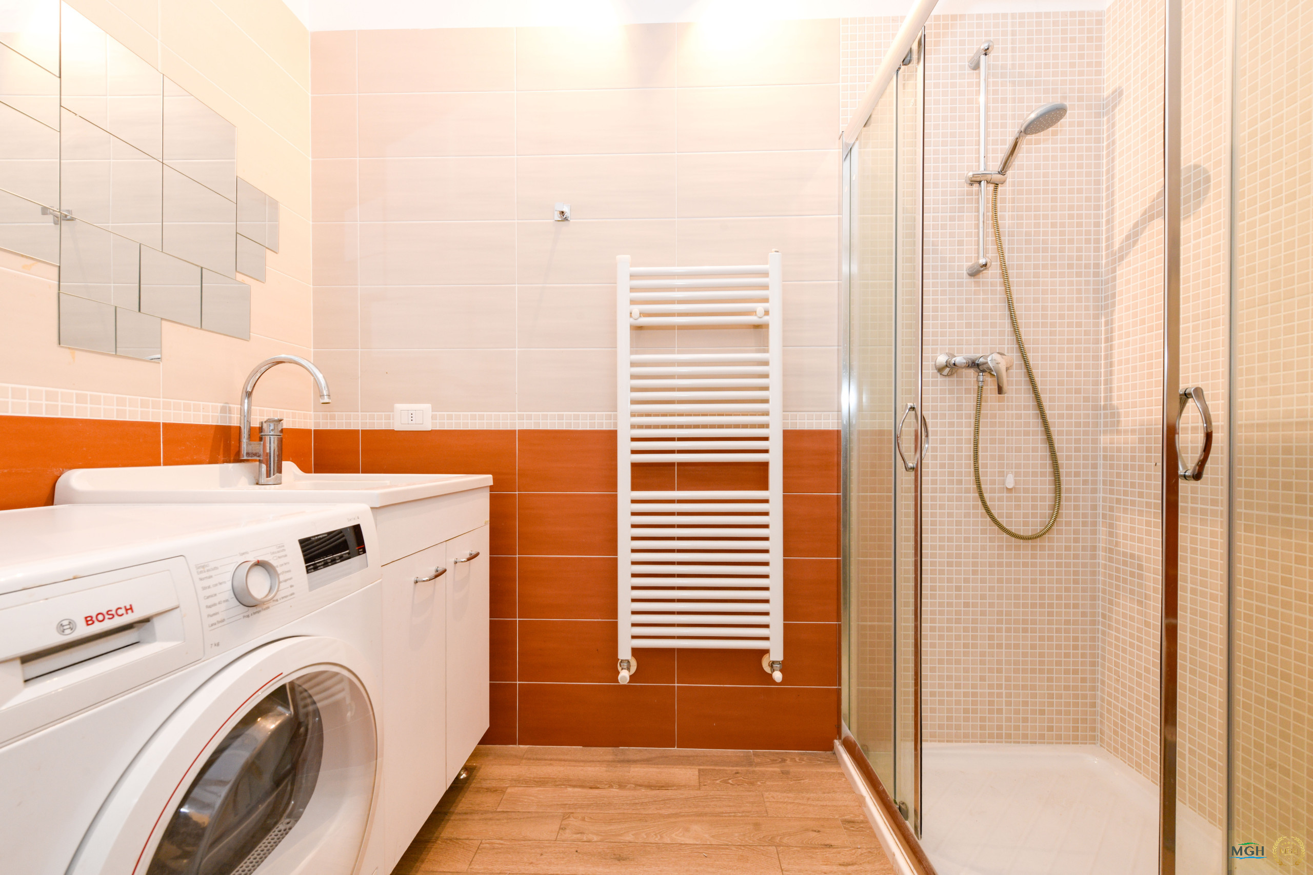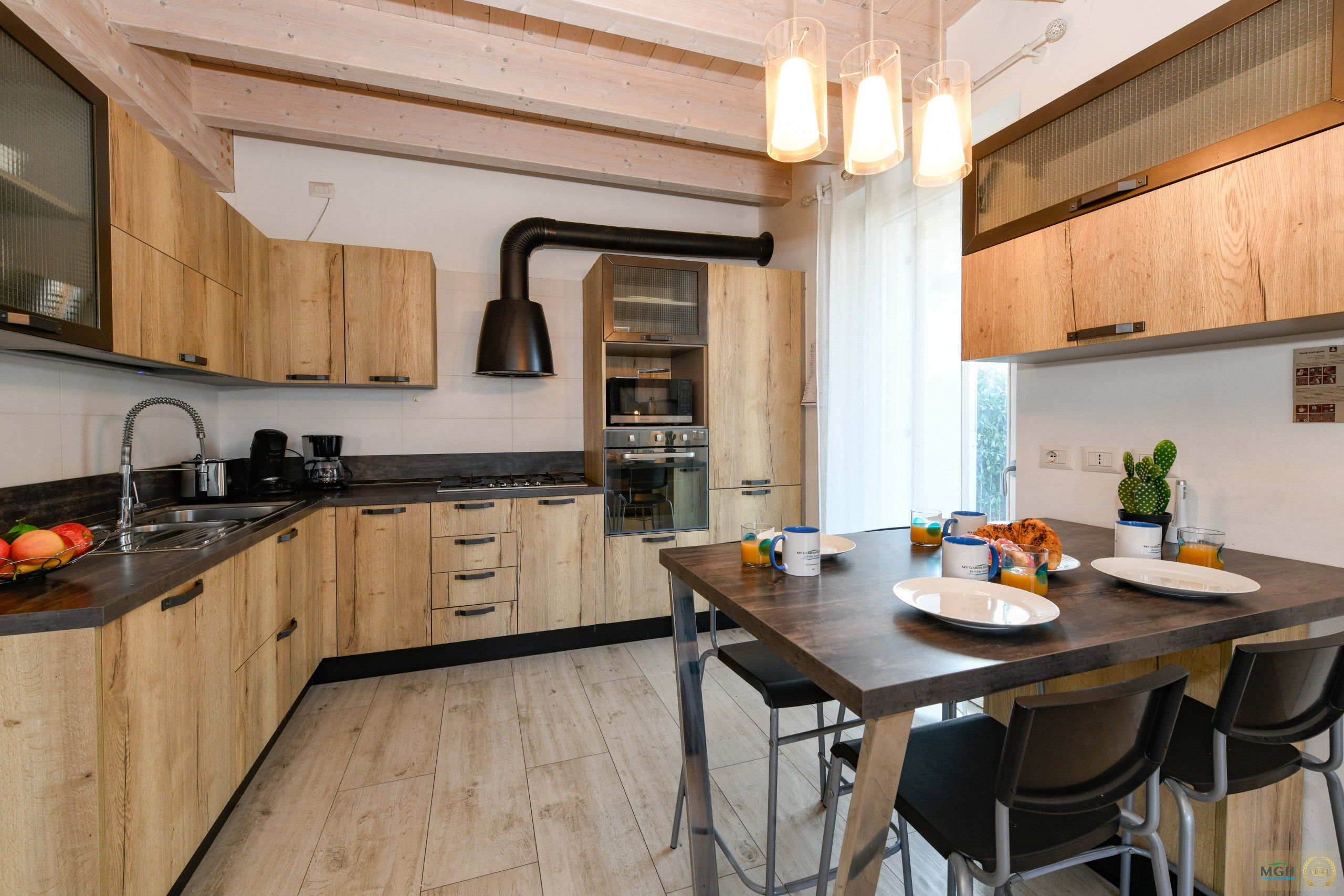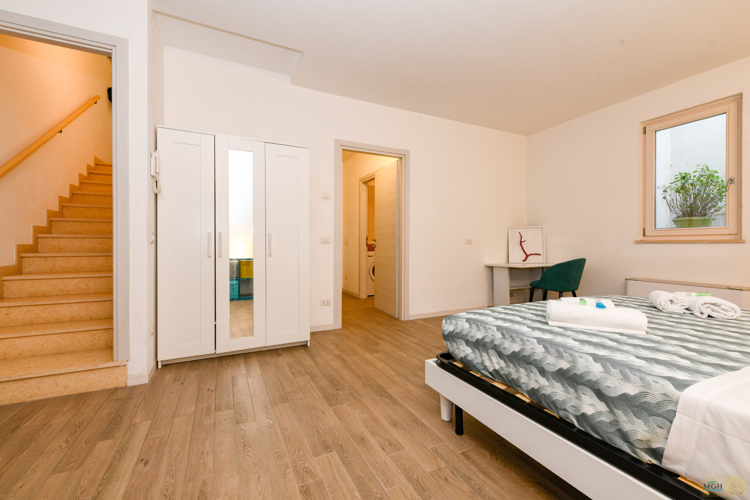 Uno dei punti di forza della casa è il giardino privato, accessibile attraverso la grande vetrata del soggiorno, dove si trova una piacevole area relax con un secondo tavolo da pranzo, perfetto per colazioni e pranzi all’aperto nelle giornate estive.