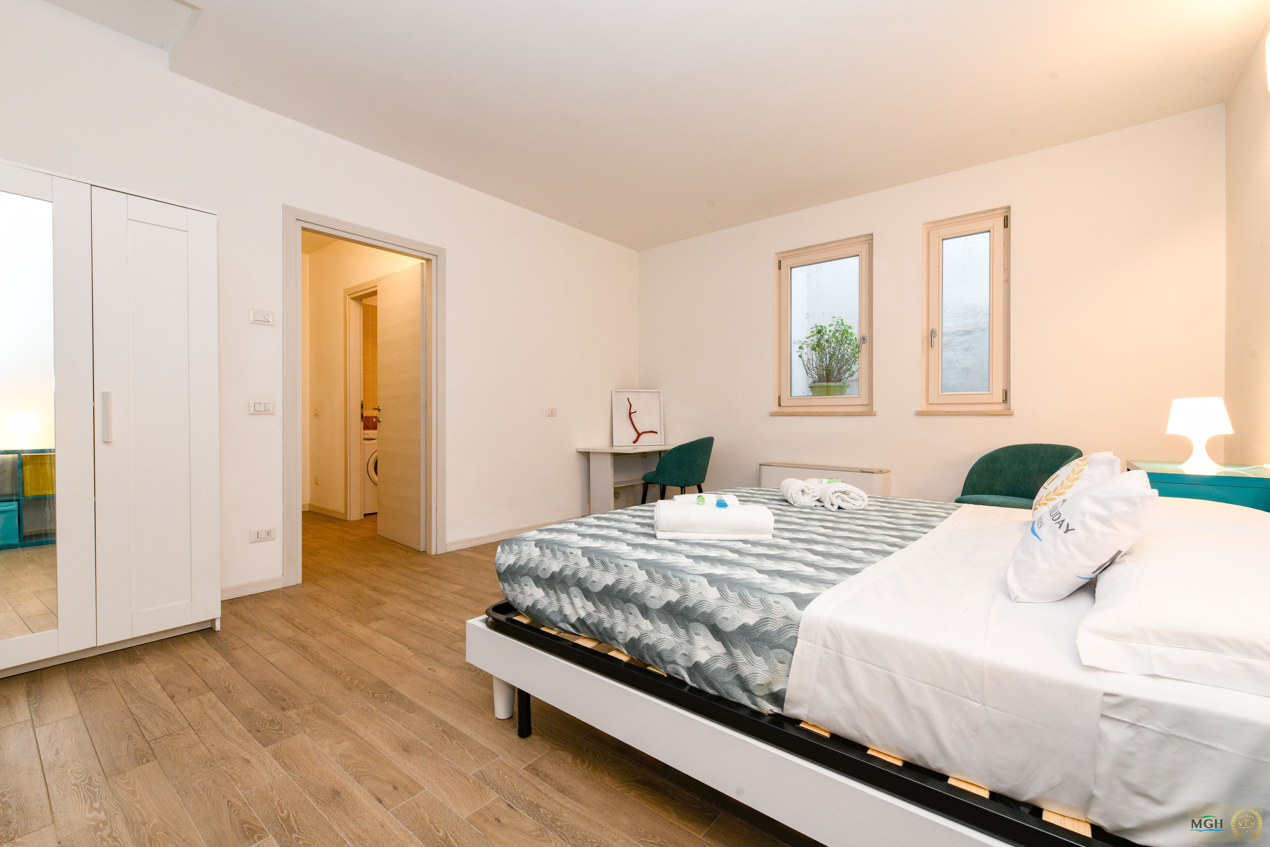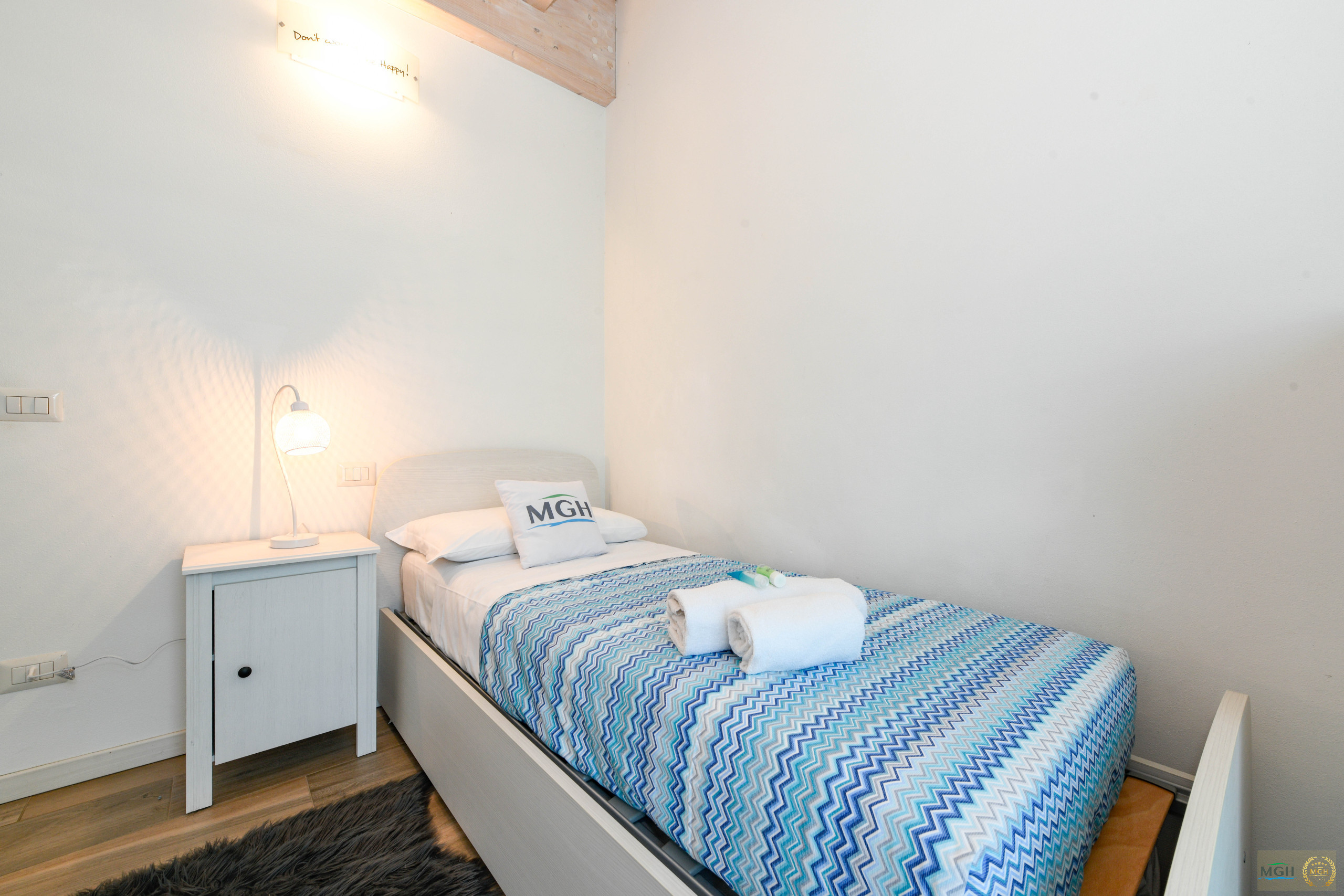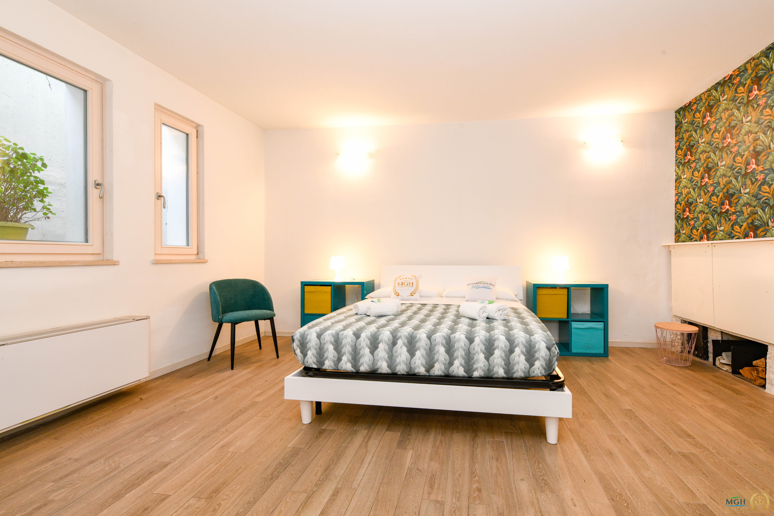 Uno dei punti di forza della casa è il giardino privato, accessibile attraverso la grande vetrata del soggiorno, dove si trova una piacevole area relax con un secondo tavolo da pranzo, perfetto per colazioni e pranzi all’aperto nelle giornate estive.