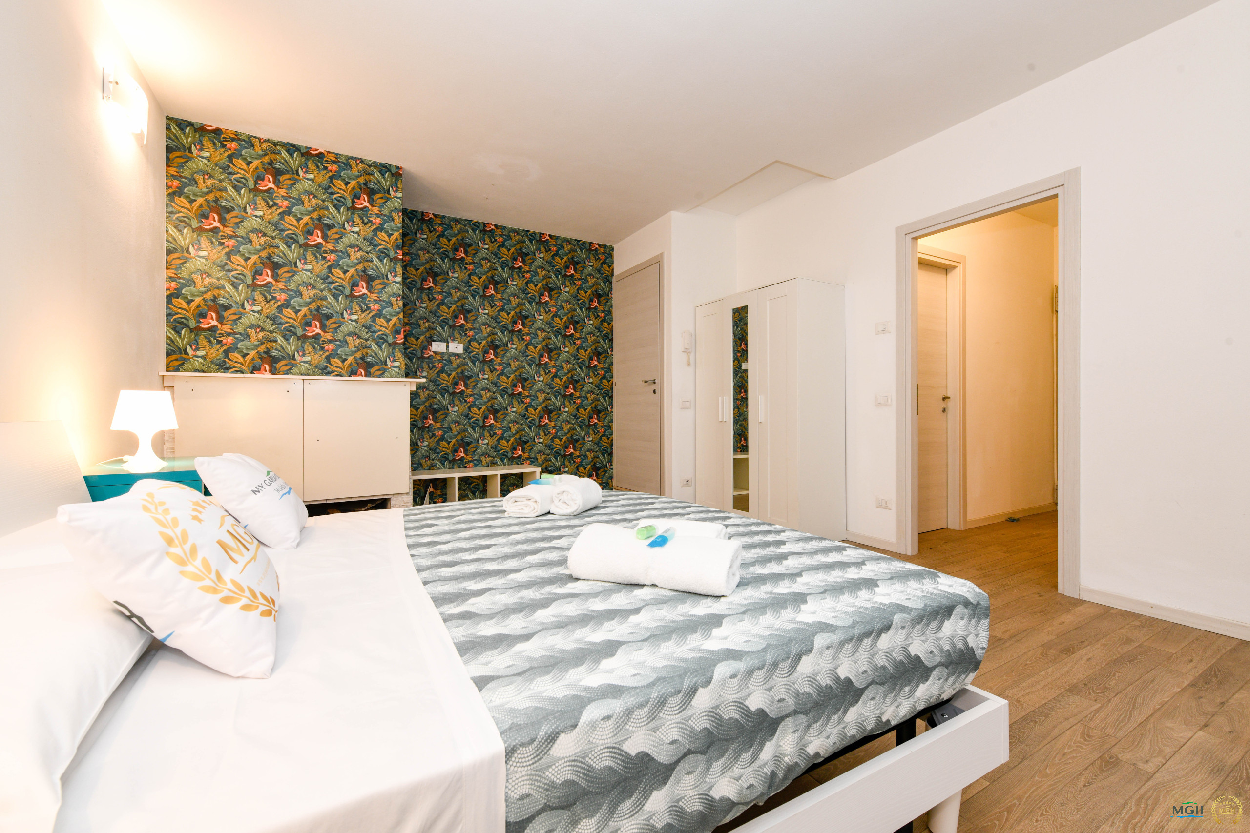 L’ingresso conduce direttamente in un soggiorno ampio e curato, con un grande divano, un tavolo da pranzo spazioso e una TV a schermo piatto, perfetto per momenti di convivialità e riposo. La cucina, moderna e completamente attrezzata, offre tutto il necessario per sentirsi come a casa, con frigorifero e congelatore, forno, microonde, bollitore, tostapane e macchina del caffè.
