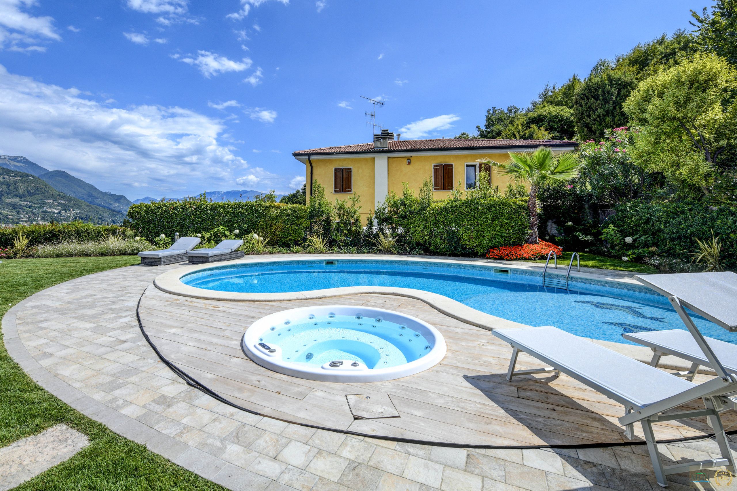 La villa è di 350 m² in totale e dispone di un giardino privato di 1000 m² con vista lago, una piscina con zona bambini bassa, una vasca idromassaggio riscaldata e una cucina esterna con barbecue.