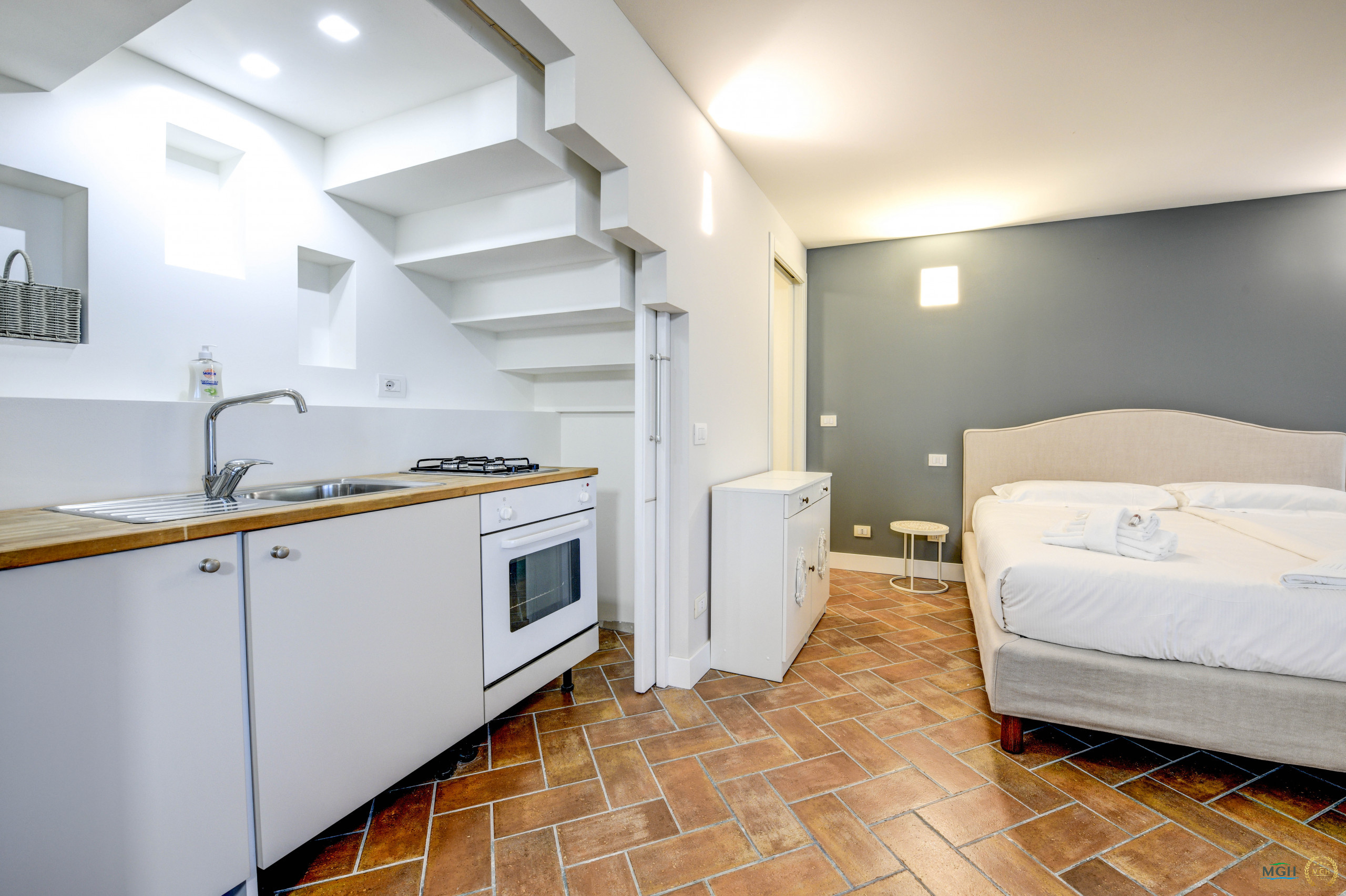 Al piano seminterrato della villa, con accesso diretto all'ampio terrazzo e al giardino, si trova un bellissimo miniappartamento di circa 30mq. Questo ha il proprio angolo cottura, bagno e TV.