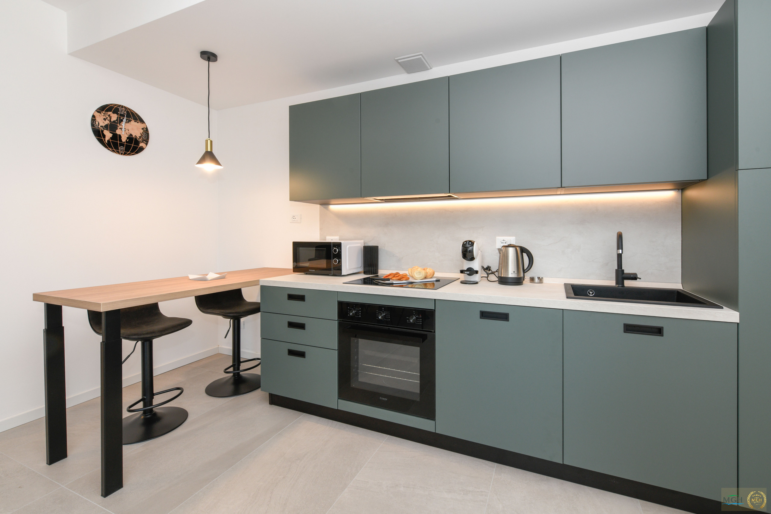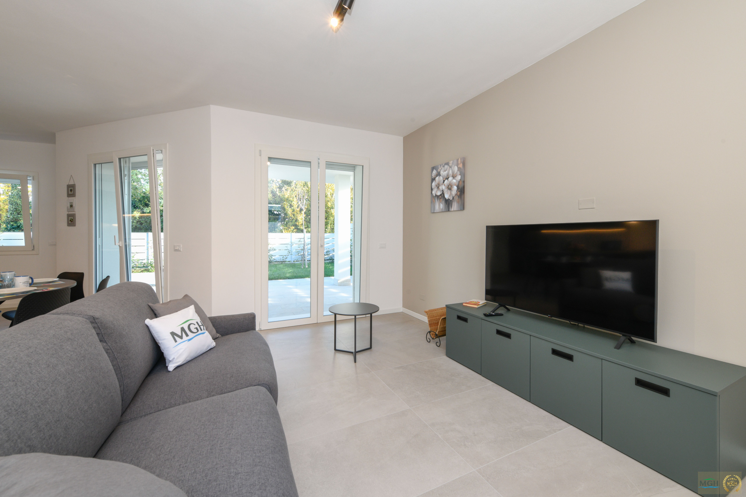 Al piano terra si sviluppa un’ampia zona giorno luminosa e accogliente, dove il soggiorno con divano letto e grande TV a schermo piatto si integra armoniosamente con la cucina moderna, attrezzata con tutti gli elettrodomestici necessari, inclusa la lavastoviglie. Da qui si accede direttamente al giardino privato, uno spazio curato e piacevole, arredato con area pranzo e zona relax ideale per godersi momenti all’aria aperta in totale tranquillità. Sempre al piano terra si trova un primo bagno completo, dotato di doccia, bidet, asciugacapelli e tutti i comfort.