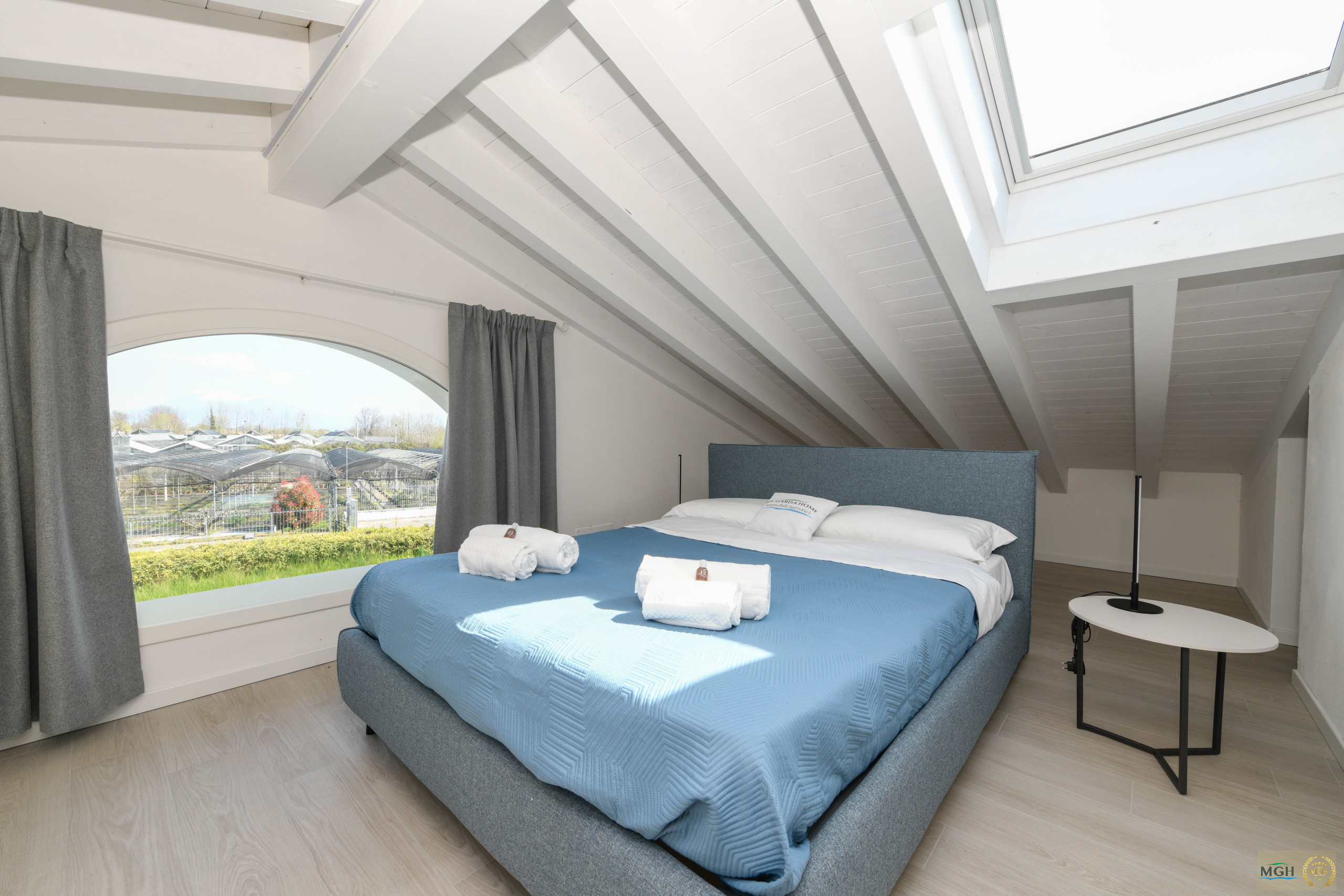 Die obere Etage beherbergt ein geräumiges Dachzimmer mit sichtbaren Balken und einem internen Badezimmer mit WC und Bidet, das eine private und komfortable Umgebung bietet.
