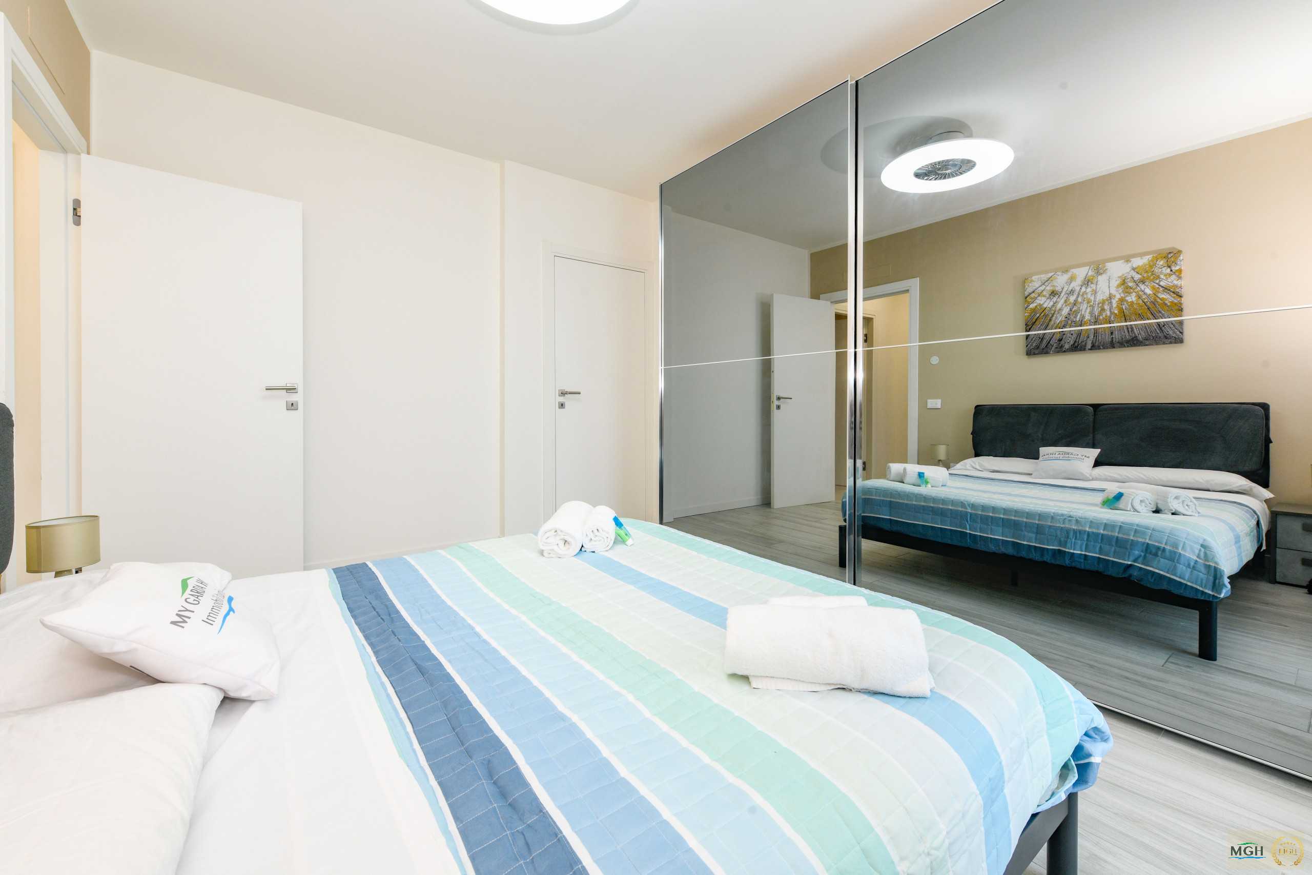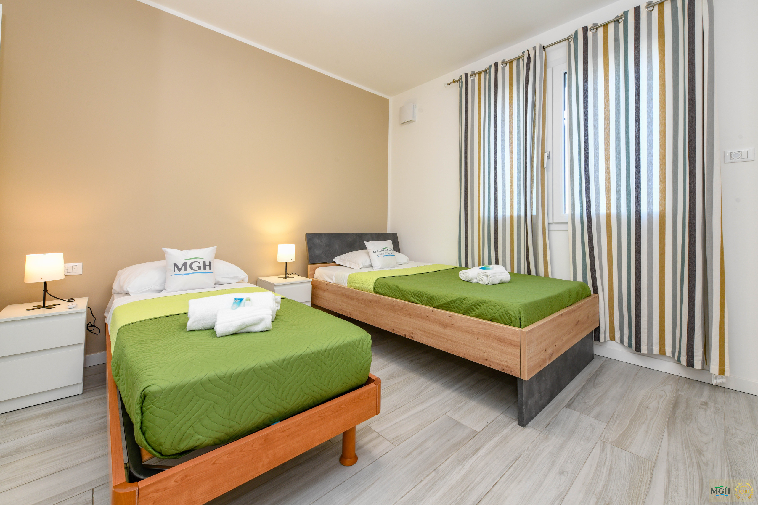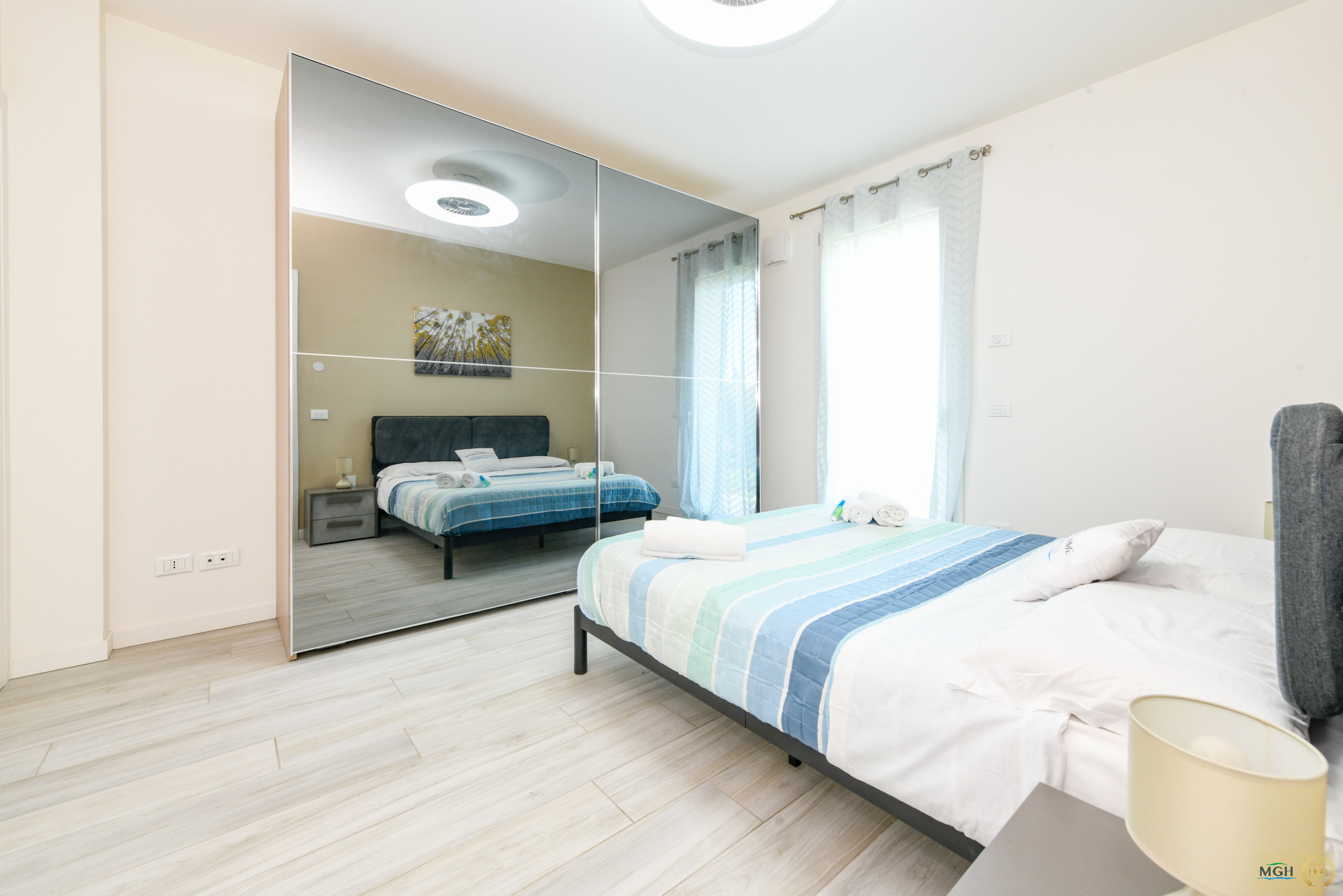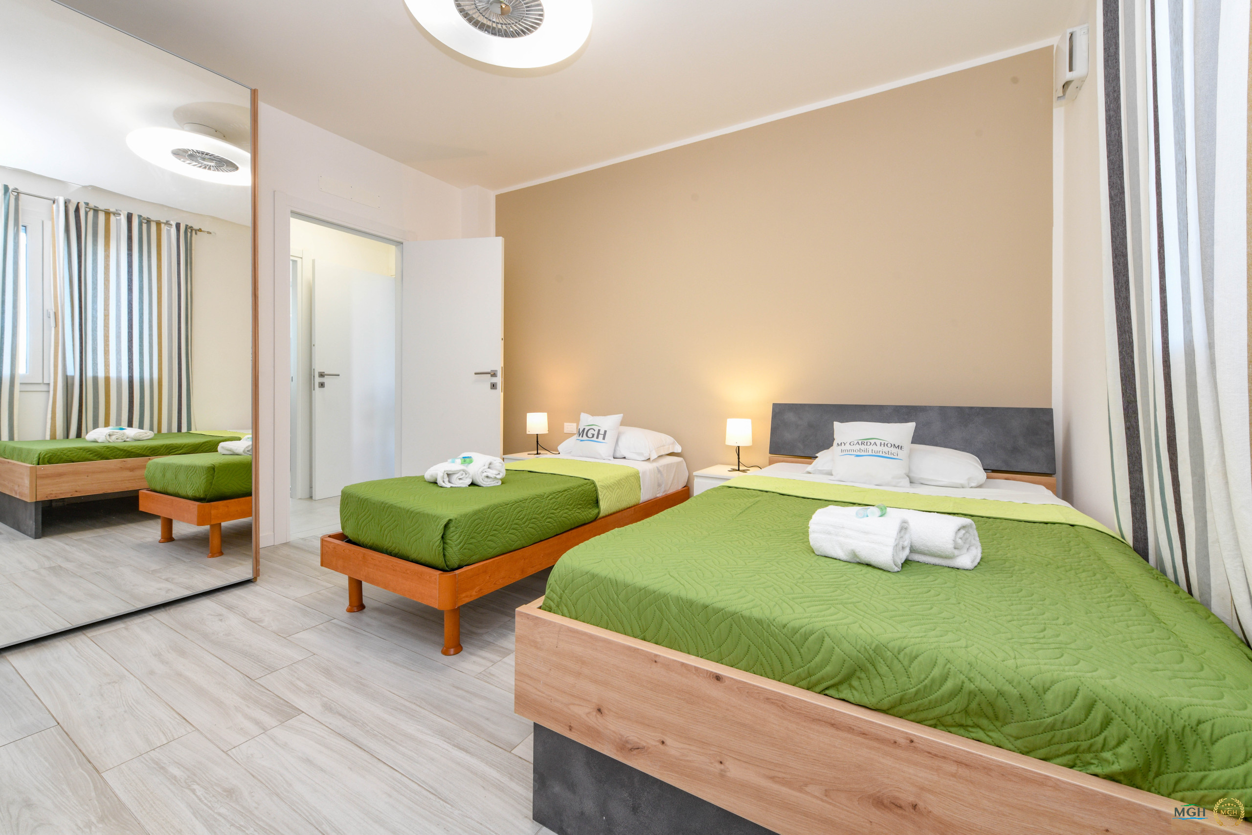 Die Wohnung verfügt über drei Schlafzimmer: ein Elternschlafzimmer, das eine praktische Waschküche mit Waschmaschine und einem kleinen Waschbecken umfasst, ein Zimmer mit zwei Betten (ein Anderthalbpersonenbett + ein Einzelbett) und ein Einzelzimmer, das ideal für Kinder ist.