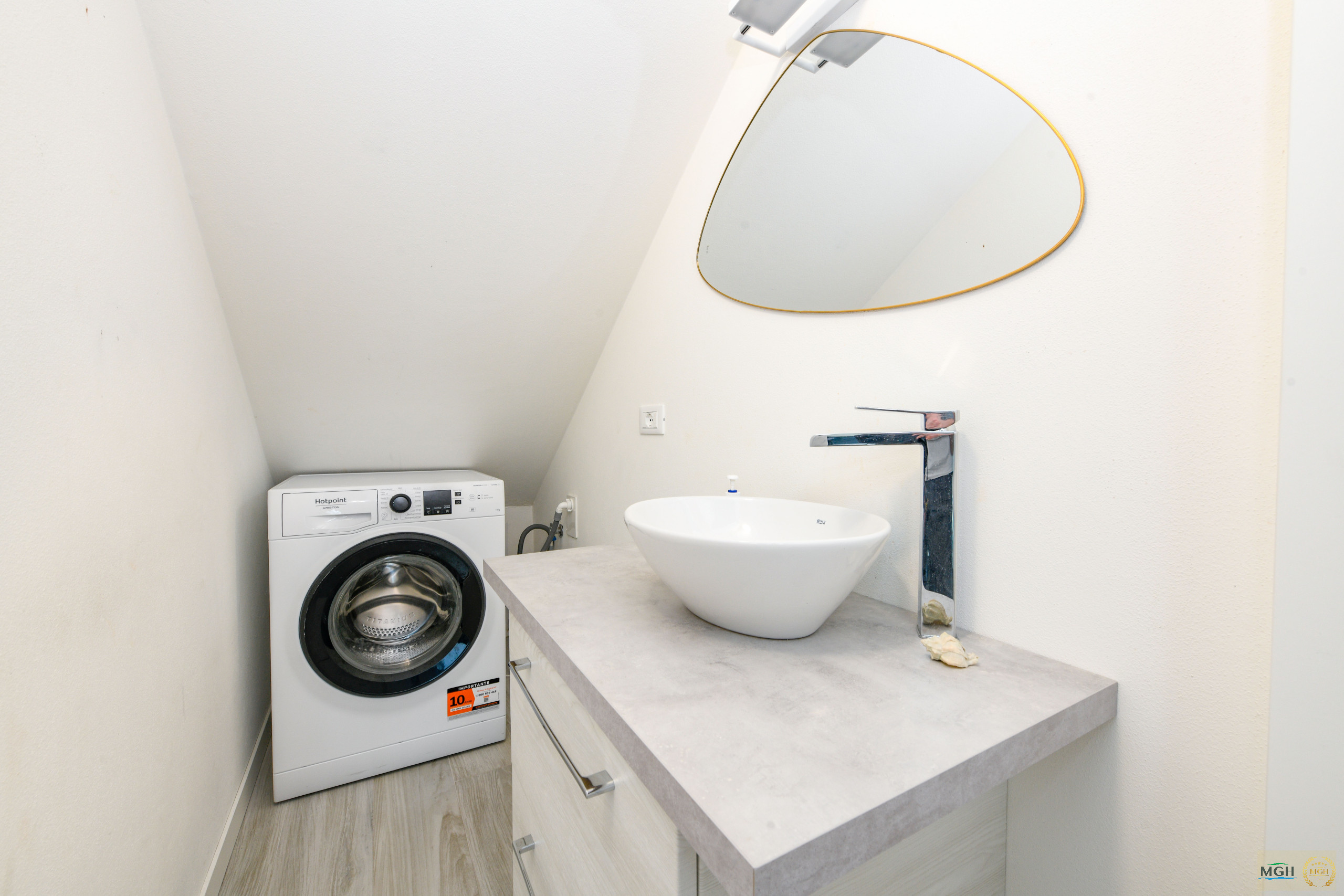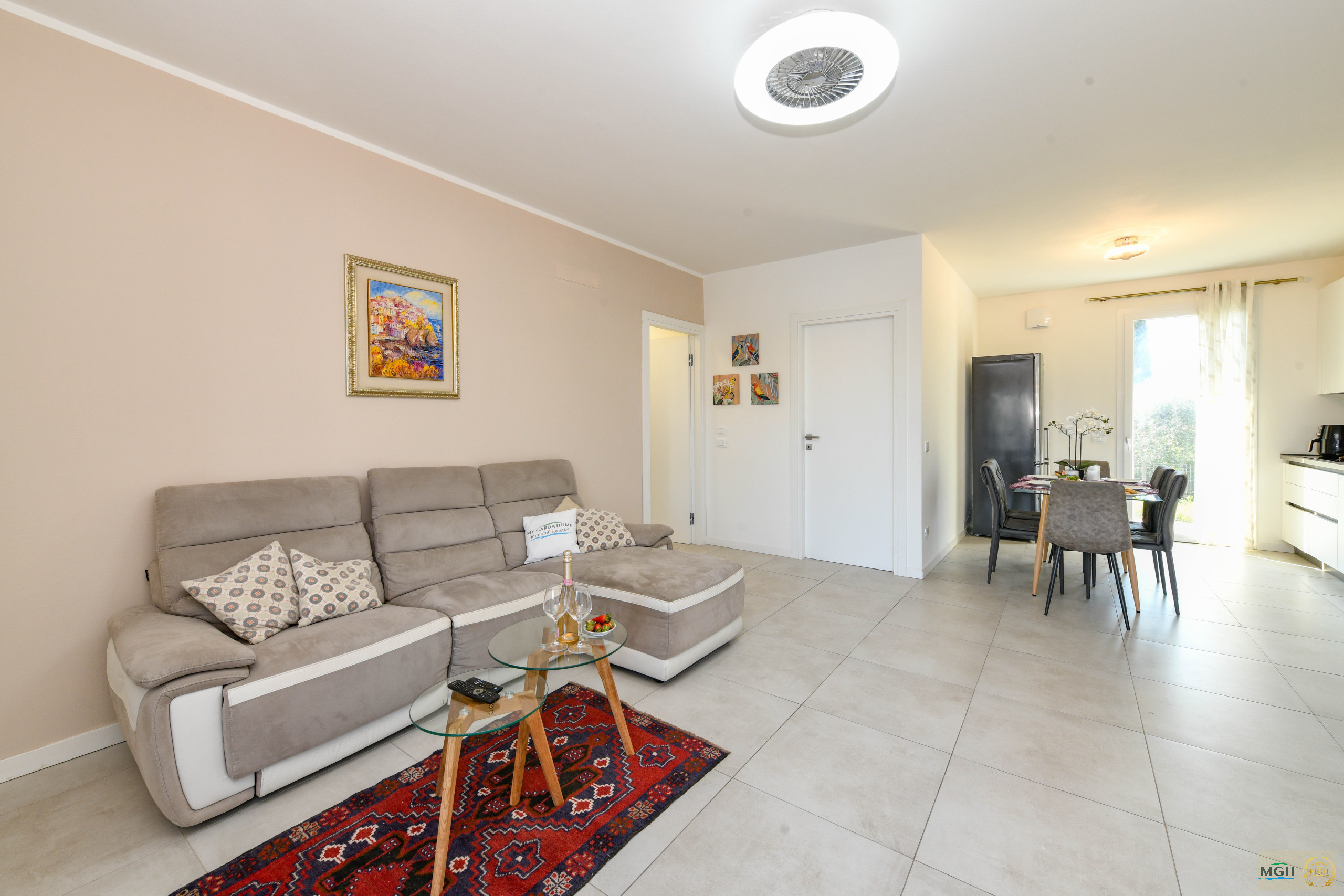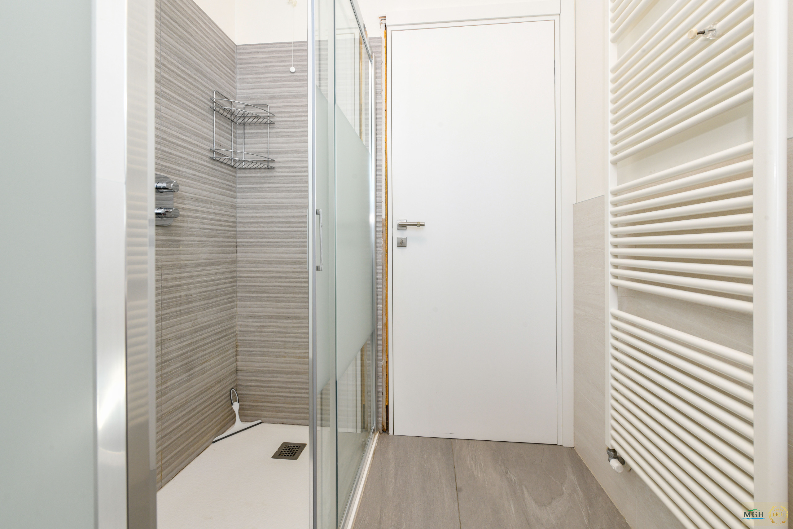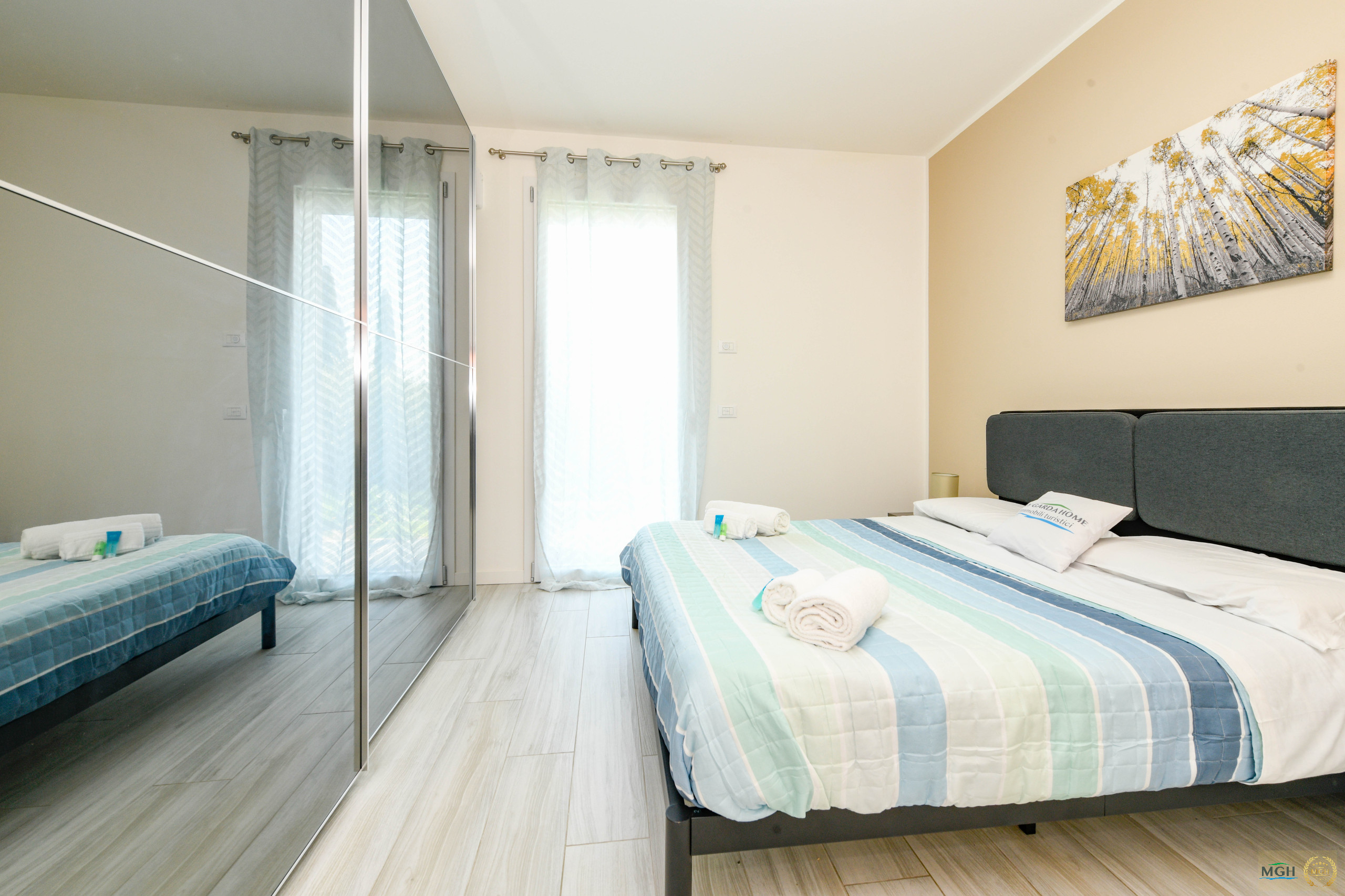 Die Wohnung verfügt über drei Schlafzimmer: ein Elternschlafzimmer, das eine praktische Waschküche mit Waschmaschine und einem kleinen Waschbecken umfasst, ein Zimmer mit zwei Betten (ein Anderthalbpersonenbett + ein Einzelbett) und ein Einzelzimmer, das ideal für Kinder ist.