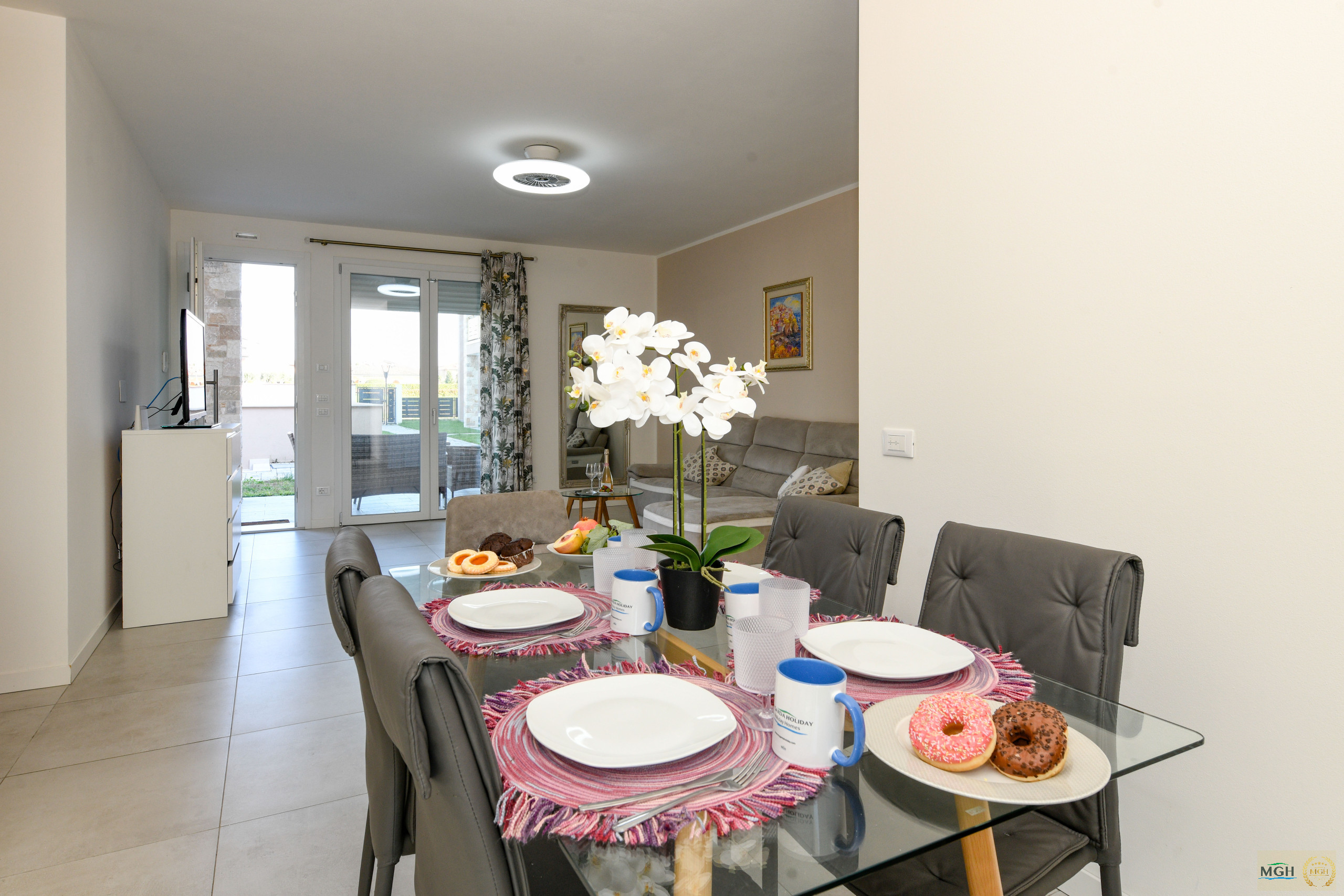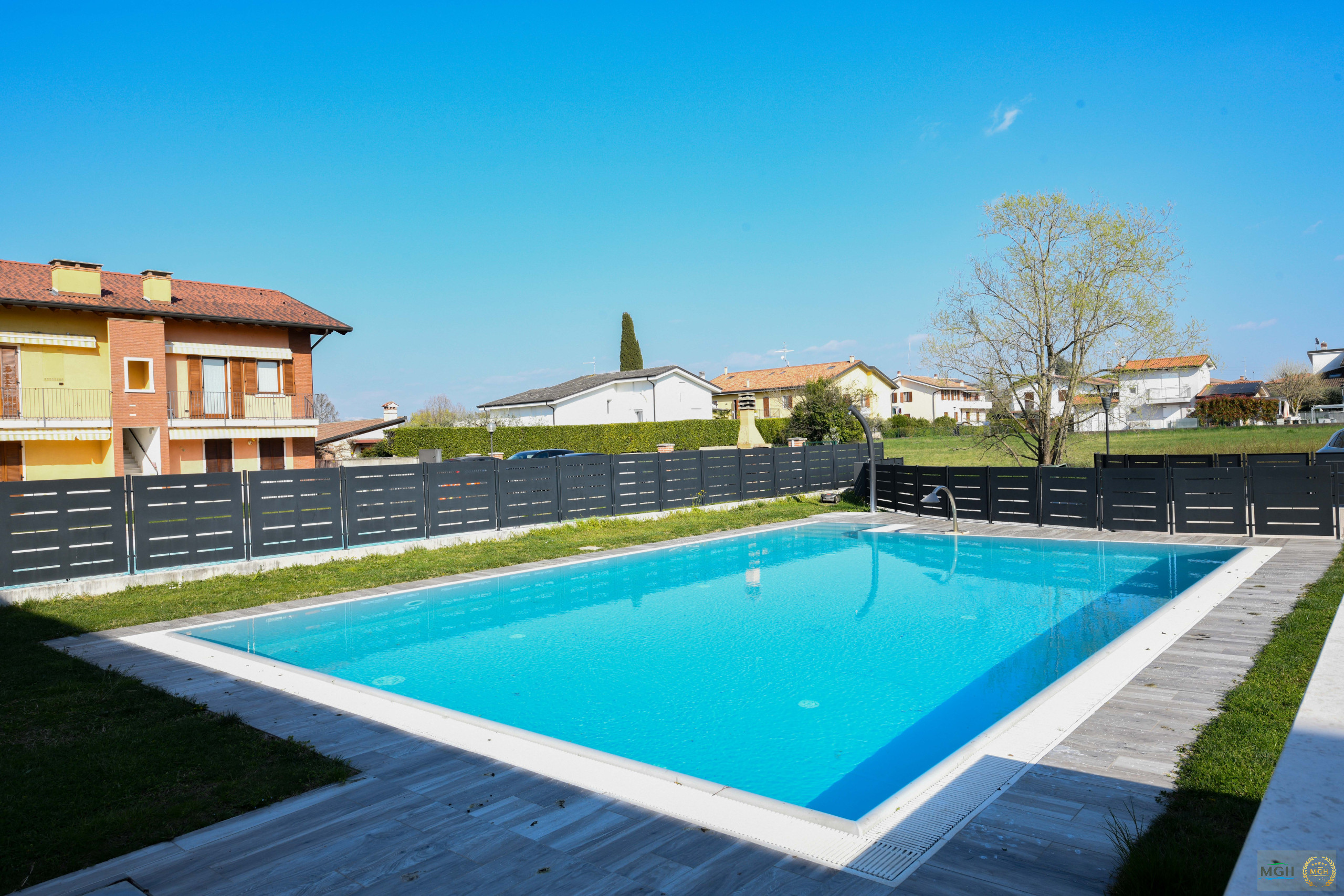 Aus der Küche gelangt man direkt in den Garten hinten, ein sicherer Raum, in dem Kinder spielen können; vom Wohnzimmer aus gelangt man hingegen zur Loggia an der Poolfront, die mit einer kleinen Relaxzone für Frühstücke oder Lesemomente im Freien ausgestattet ist.