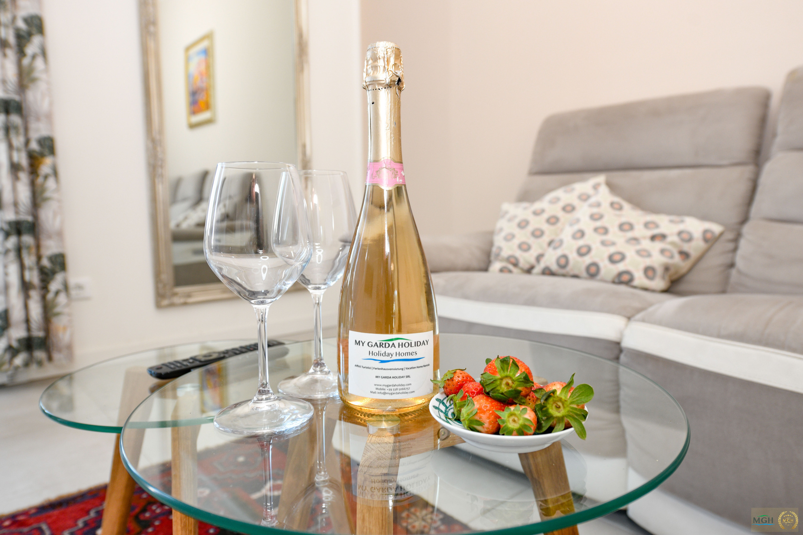 Der Wohnbereich ist hell und einladend, mit Sofa und Flachbild-Smart-TV, während die Küche komplett ausgestattet ist mit Kühl-/Gefrierschrank, Backofen, Mikrowelle, Wasserkocher, Pad-Kaffeemaschine, Toaster, Heißluftfritteuse, Geschirrspüler, Esstisch und allen notwendigen Kochutensilien.