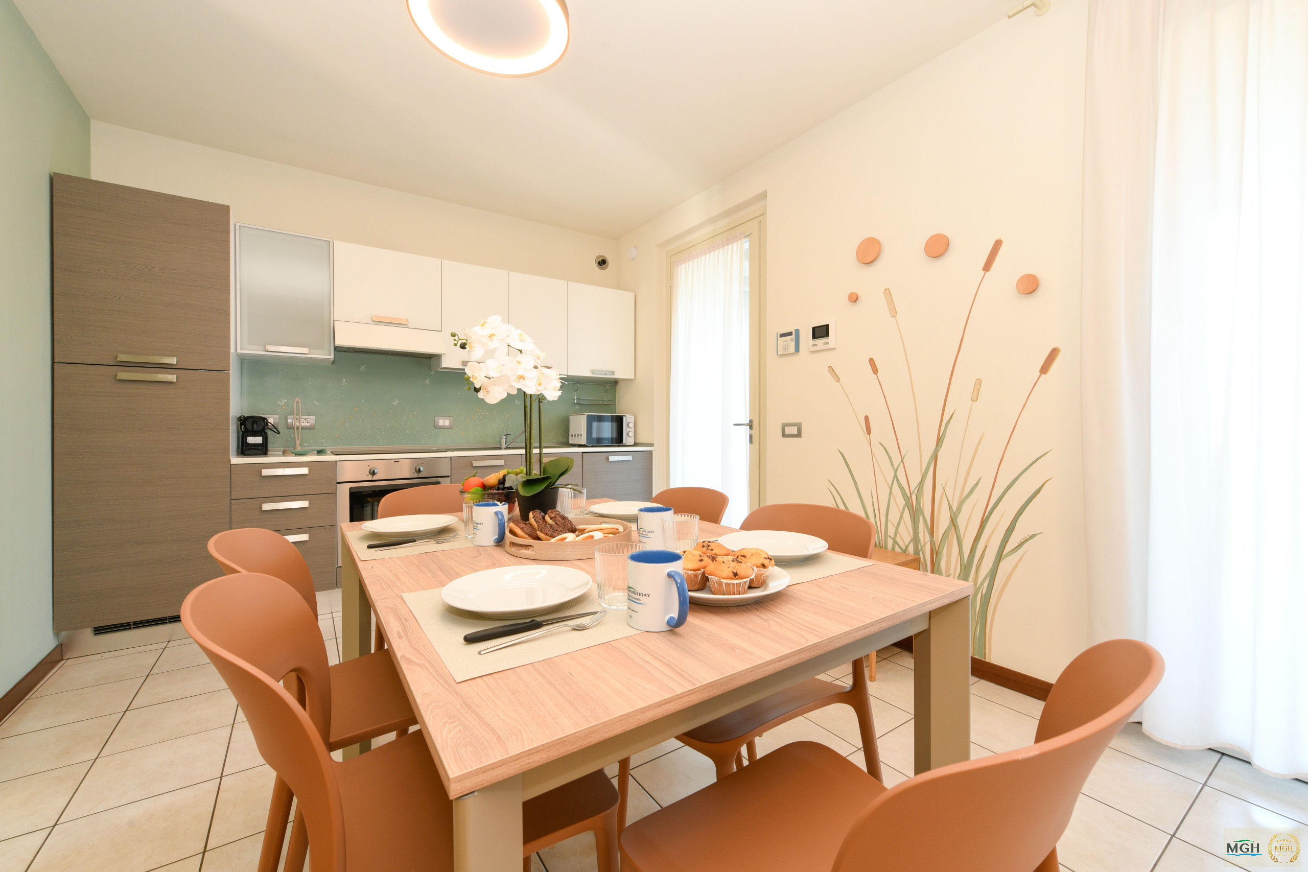 Das Wohnzimmer ist geräumig und einladend, mit einem großen Schlafsofa, Flachbildfernseher und einer offenen, vollständig ausgestatteten Küche mit Kühlschrank, Gefrierschrank, Induktionskochfeld, Ofen, Geschirrspüler, Wasserkocher, Toaster und Kaffeemaschine. Den Raum vervollständigt ein Esstisch, ideal um angenehme Momente in Gesellschaft zu verbringen.