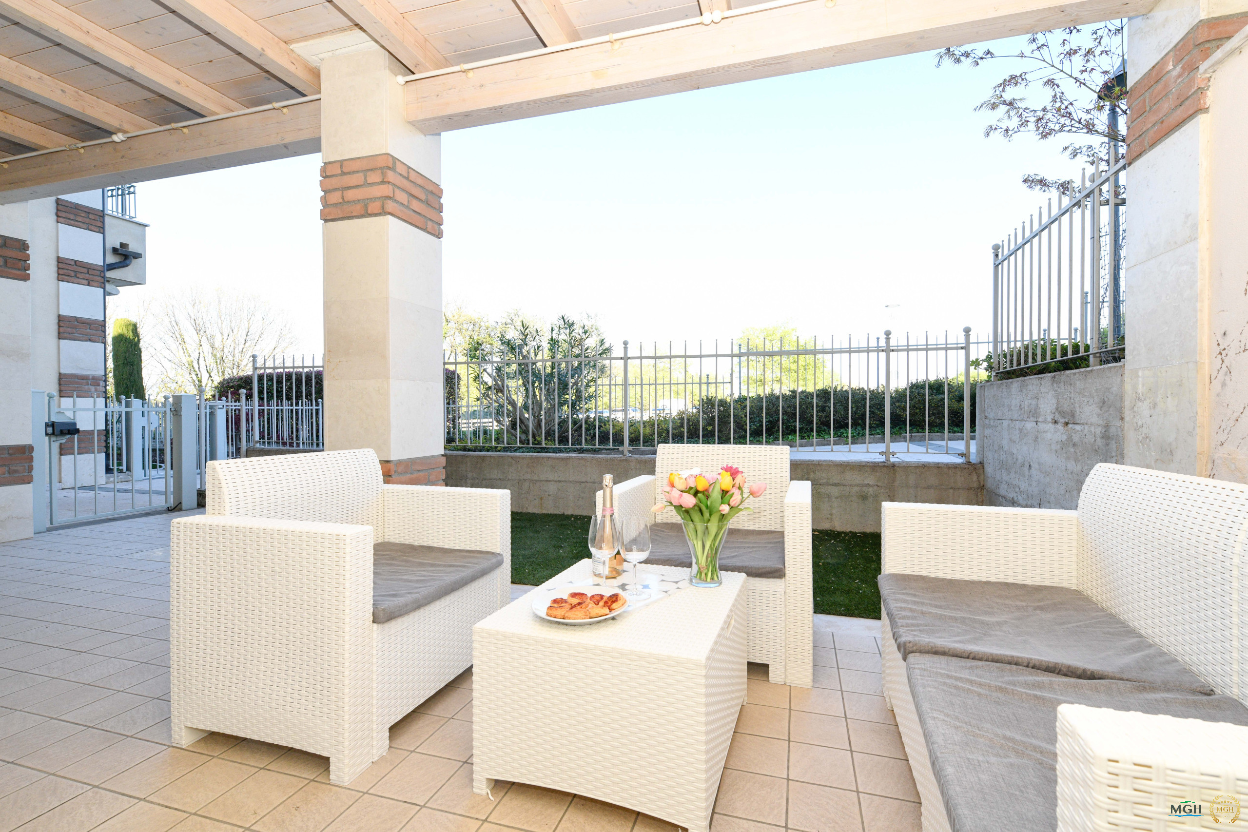 Vom Wohnbereich gelangt man auf eine hübsche überdachte externe Loggia, die mit einem Entspannungsbereich ausgestattet ist und sich perfekt für Frühstücke im Freien, Aperitifs oder Entspannungsmomente eignet.