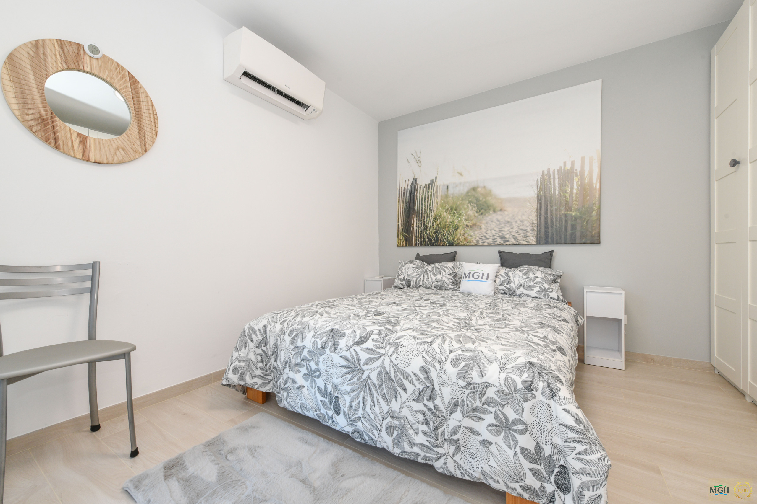 Die Wohnung verfügt über zwei Schlafzimmer, ein Elternschlafzimmer und ein Zimmer mit Einzelbetten, ideal für Kinder.