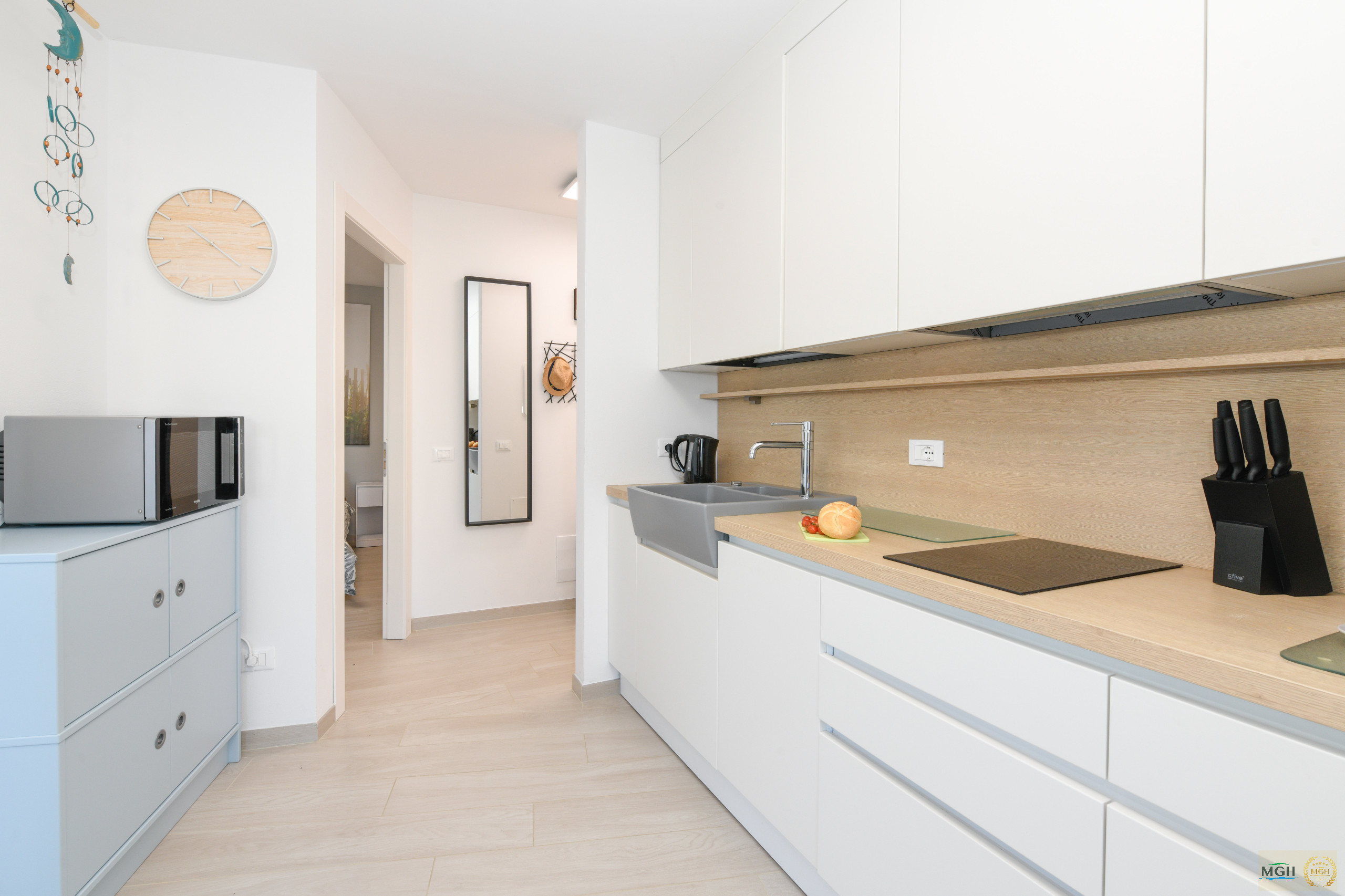 Die Induktionsküche ist komplett ausgestattet mit Mikrowelle, Geschirrspüler, Kühlschrank mit Gefrierfach, Kaffeemaschine, Toaster, Wasserkocher, Zitrusspresse und allen notwendigen Utensilien, um sich wie zu Hause zu fühlen.