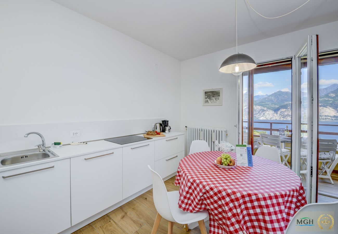 Die Ferienwohnung wurde komplett neu renoviert und bietet ein Schlafzimmer, ein Badezimmer mit Dusche, WC, Bidet und Waschmaschine, einen klimatisierten Wohn- und Essraum mit Seeblick, komfortablem Doppelschlafsofa, TV, Esstisch und voll ausgestatteter Küchenzeile mit Spülmaschine, Herd, Backofen, Kühlschrank, Gefrierfach und Kaffeemaschine (Filterkaffee) sowie Küchenausstattung. Der Balkon bietet genug Platz zum draußen Essen und einen tollen Blick auf den Gardasee und die Berge.