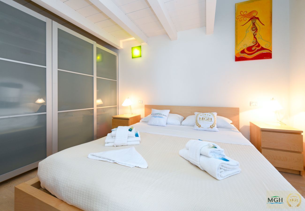 Über eine Treppe gelangen Sie auf die Galerie. Hier gibt es ein Galeriezimmer, ein WC und ein weiteres Doppelbett sowie Schrankfläche. Die Ferienwohnung verfügt über allen Komfort: Klimaanlage, Wifi, Spülmaschine, Waschmaschine und private Garage.