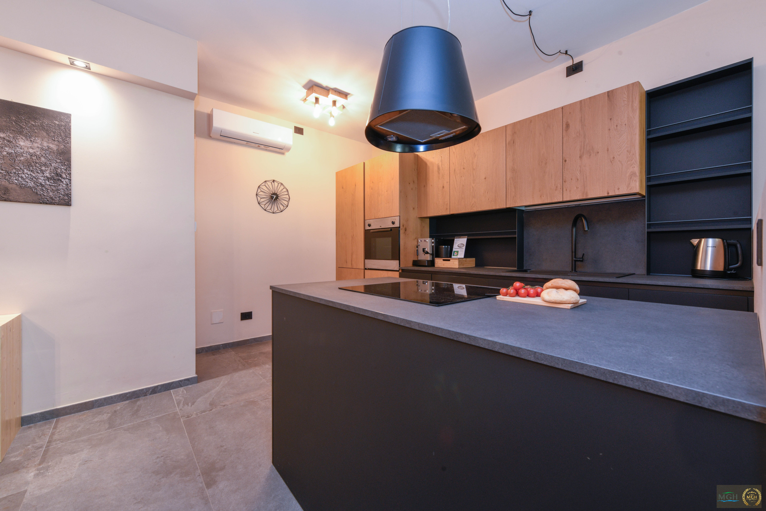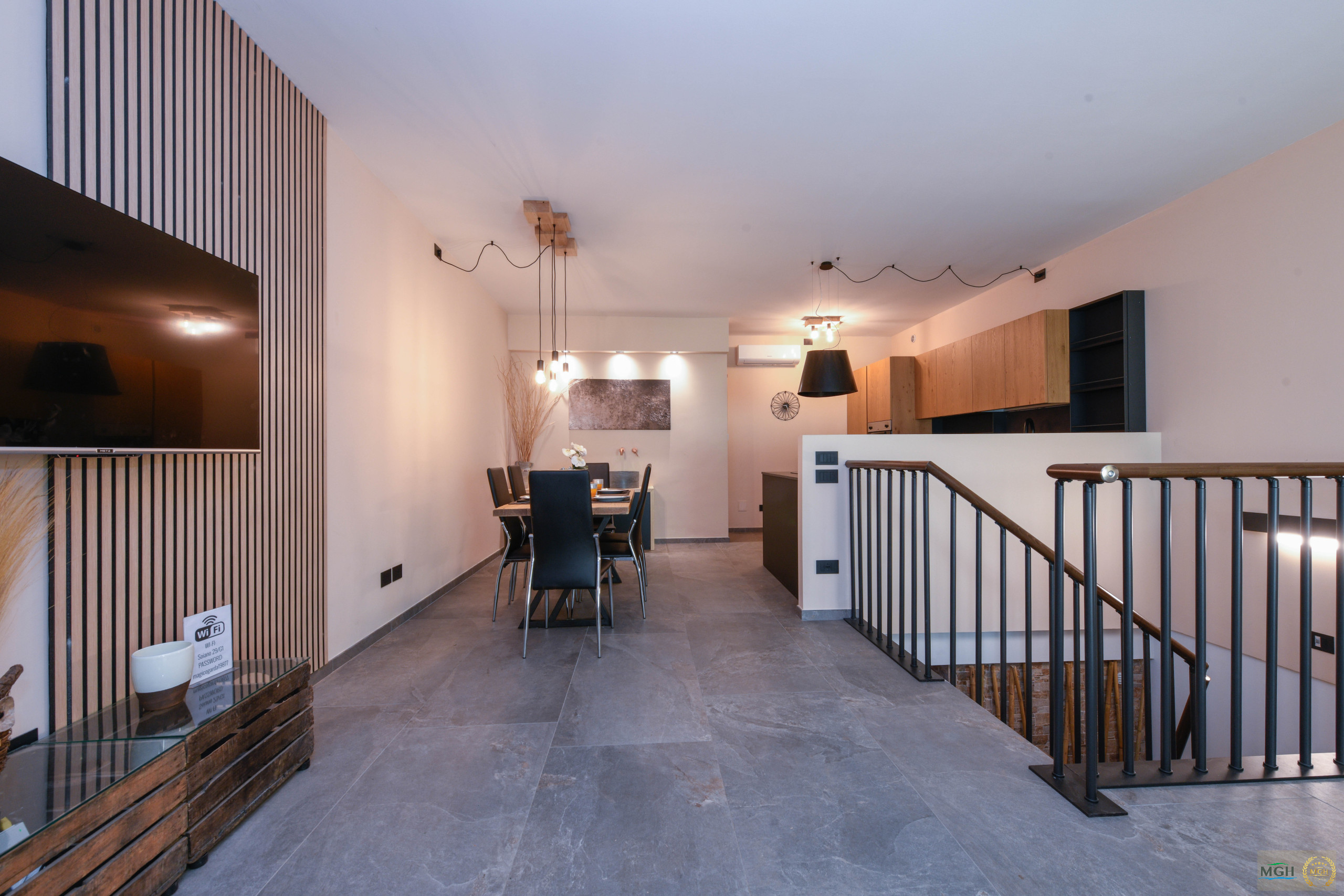 Im Obergeschoss entwickelt sich die lichtdurchflutete Wohnzone, bestehend aus einem gemütlichen Wohnzimmer mit Sofa und Flach-TV, Essbereich und einer modernen offenen Küche, die vollständig ausgestattet ist mit Kühlschrank und Gefrierschrank, Geschirrspüler, Backofen, Kaffeemaschine, Wasserkocher, Toaster, Küchenutensilien und einer eleganten Kochinsel mit Induktionsherd.