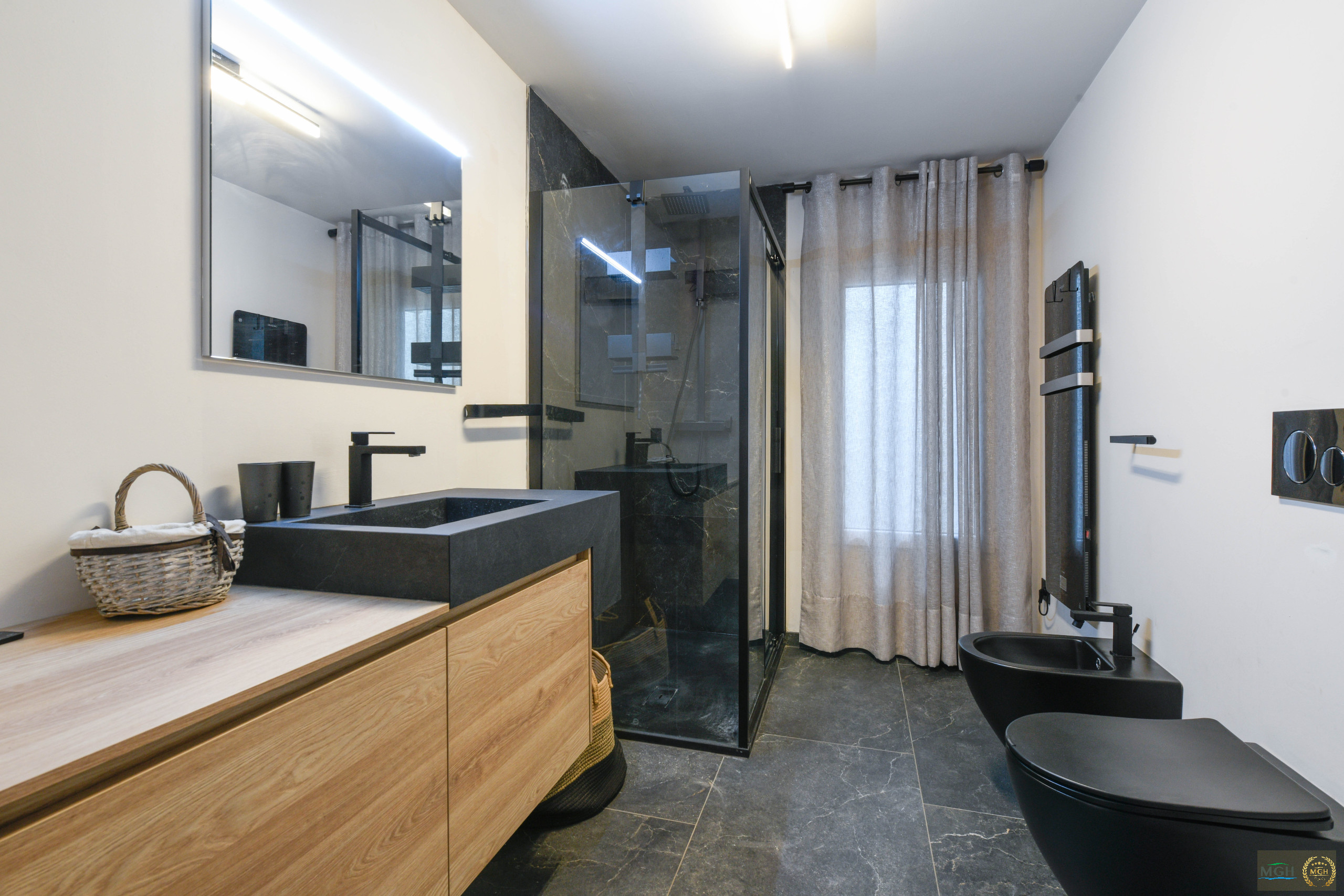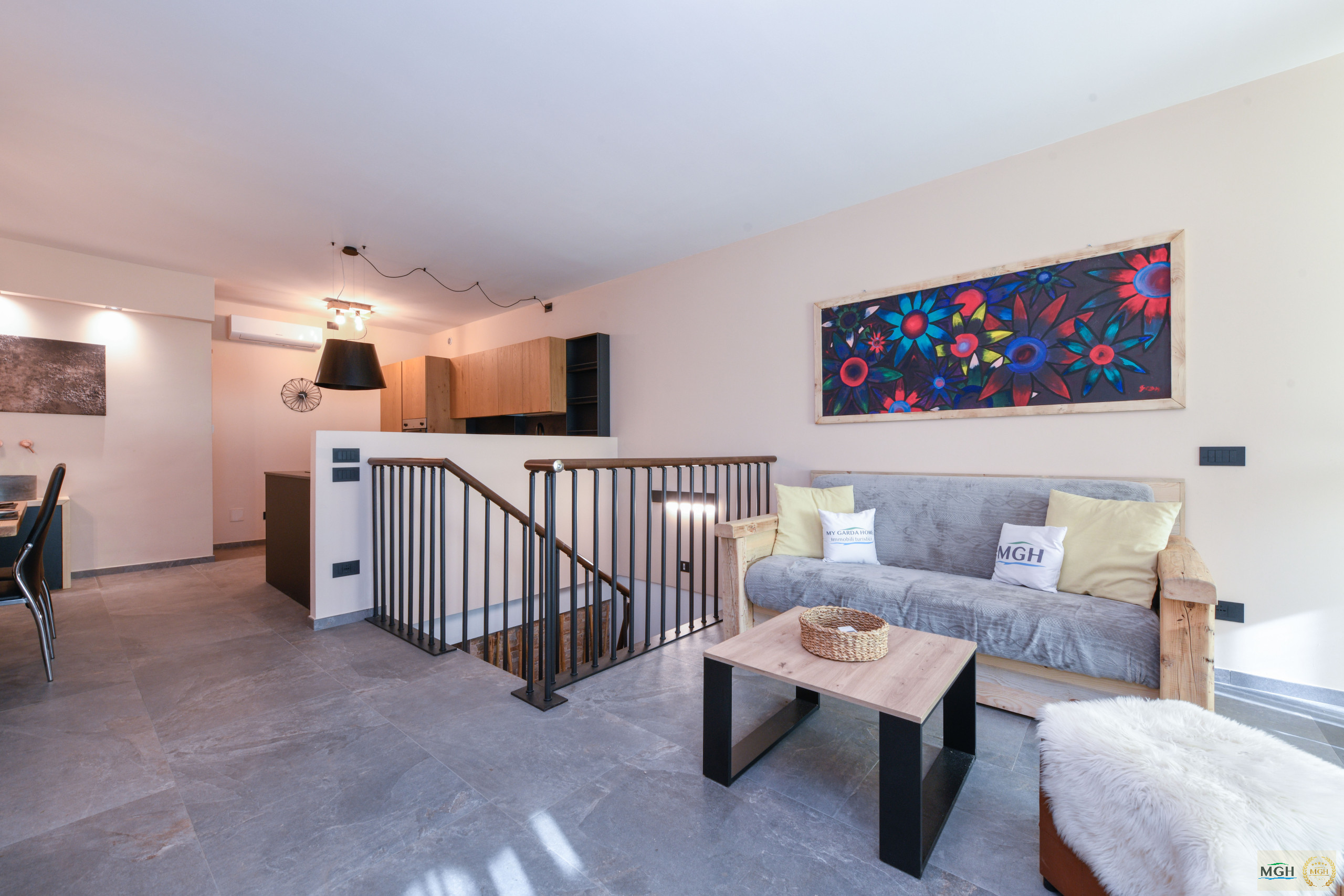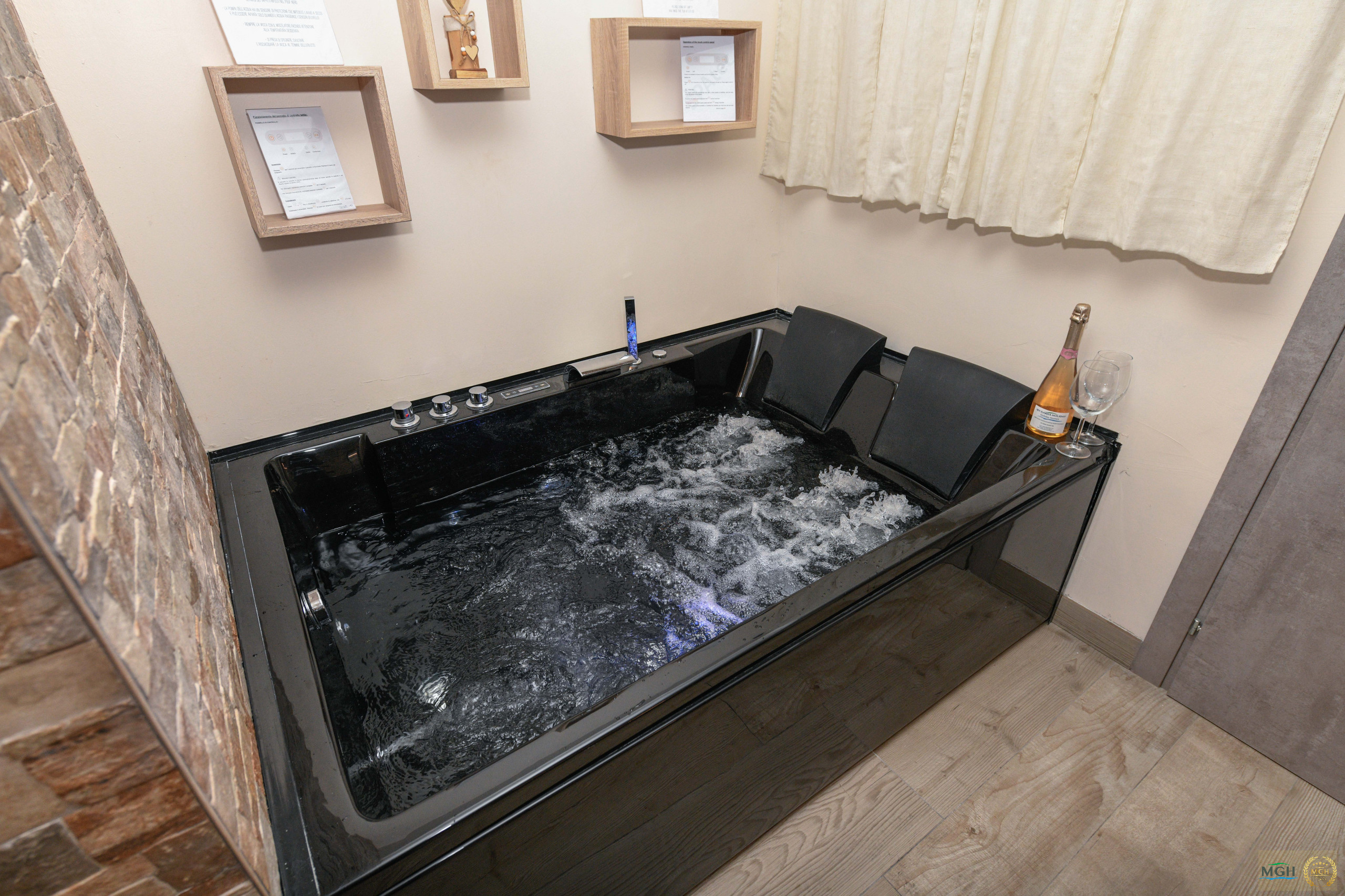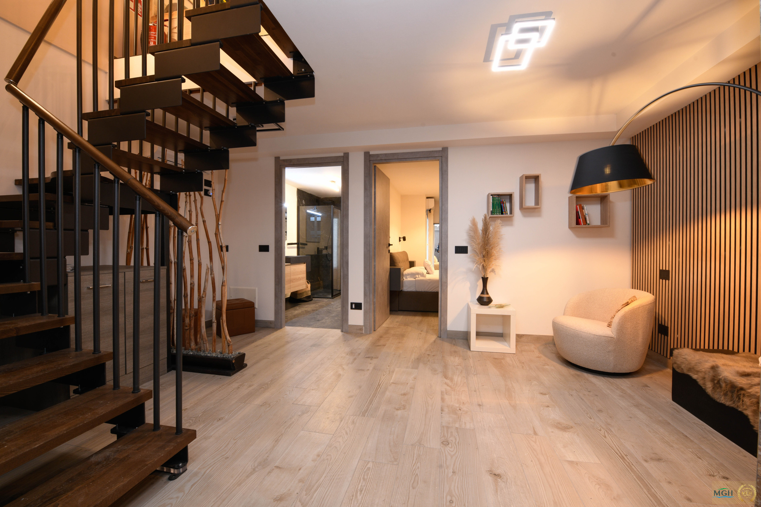 Der untere Stock ist vollständig dem Entspannen gewidmet: Hier befindet sich der Wellness-Bereich mit Whirlpool und Dampfbad, ein romantisches Doppelzimmer und ein vollständiges Badezimmer mit Dusche, WC, Bidet und Haartrockner.