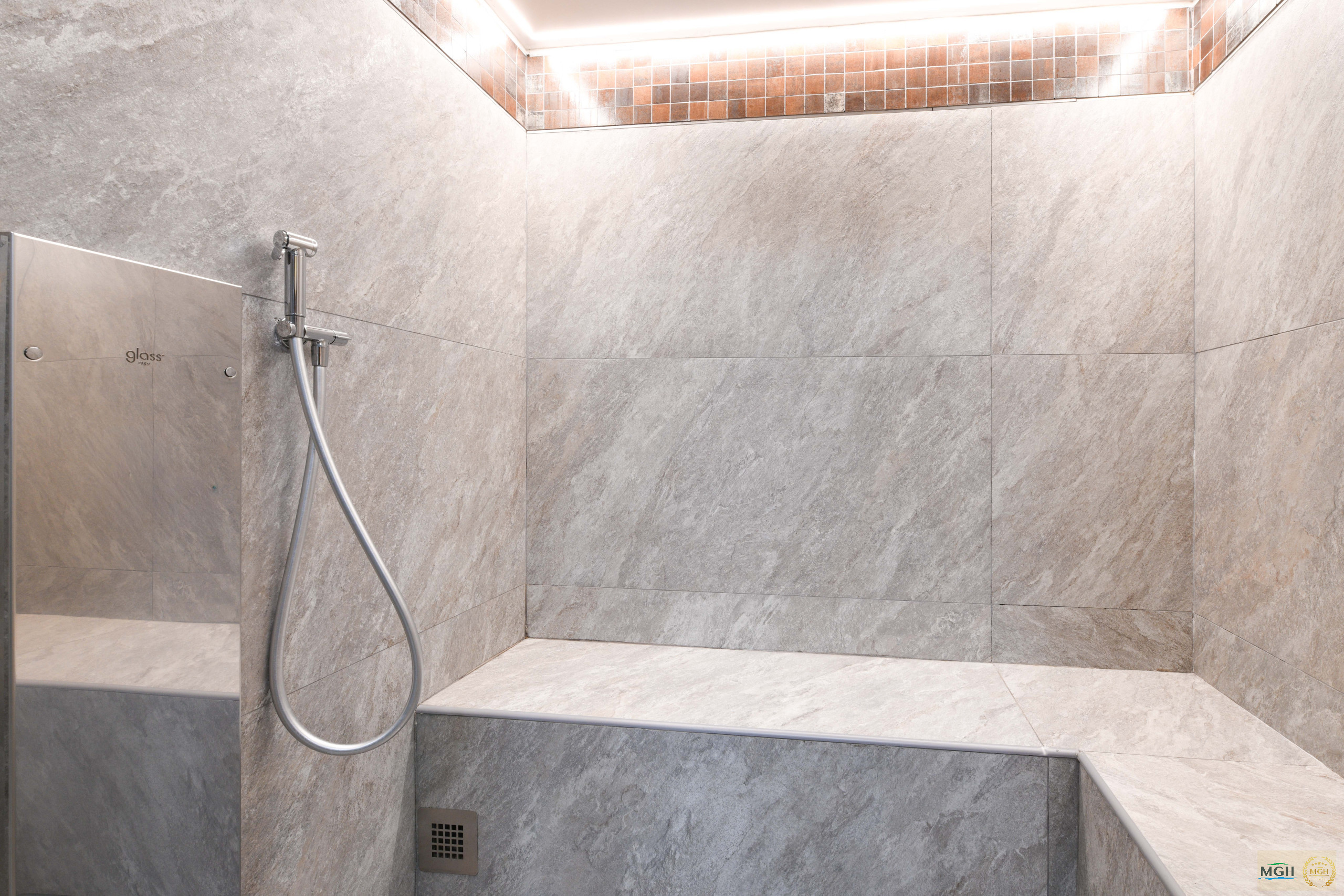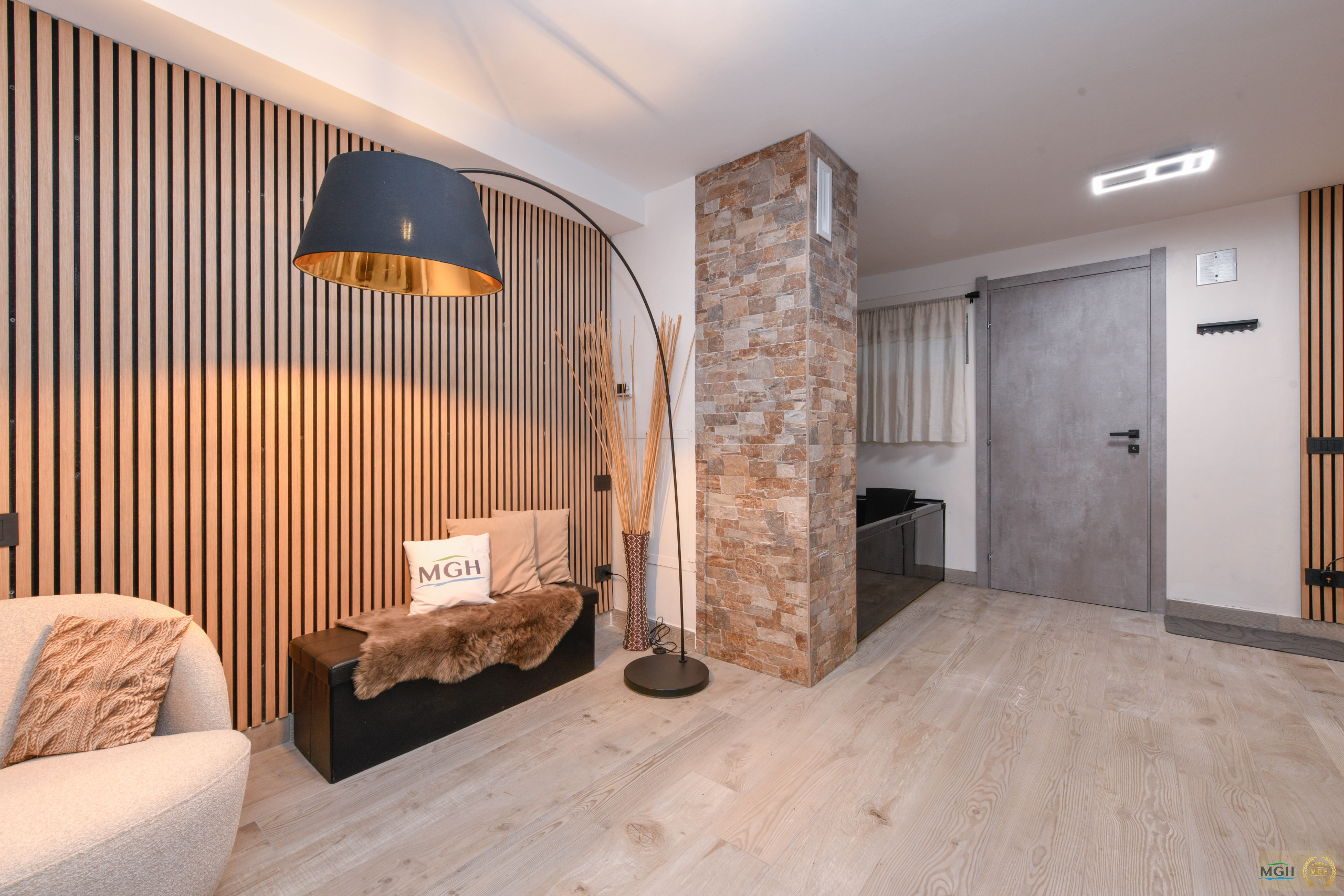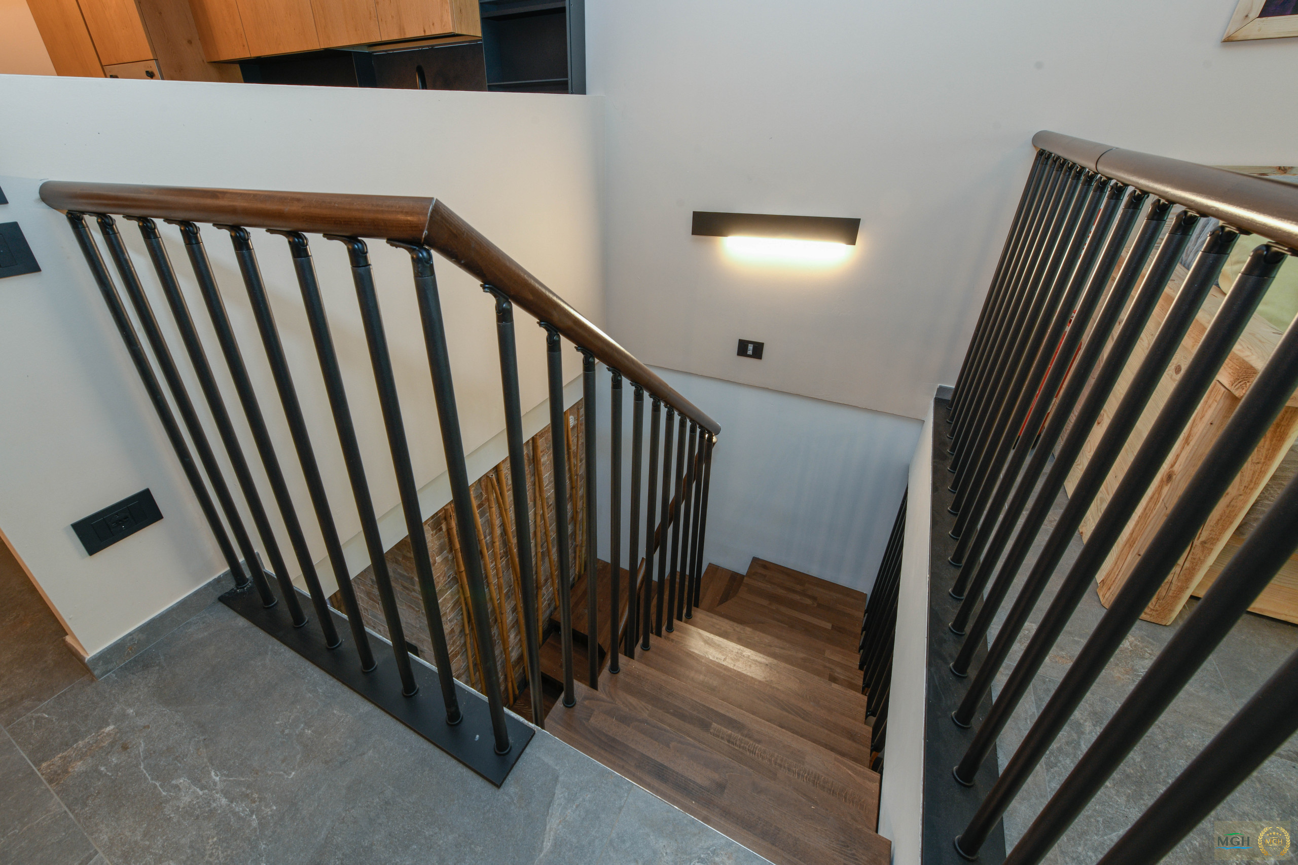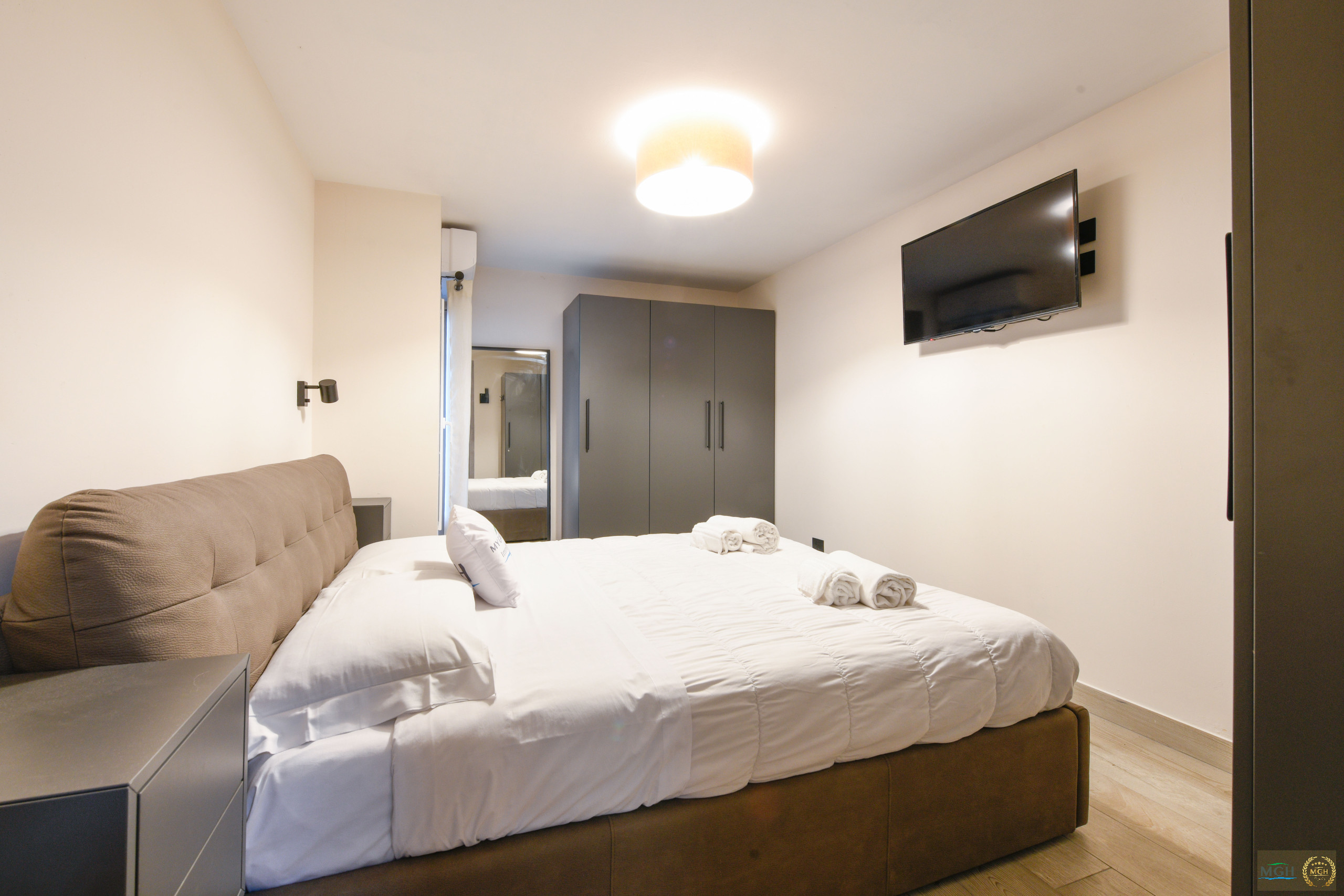Der untere Stock ist vollständig dem Entspannen gewidmet: Hier befindet sich der Wellness-Bereich mit Whirlpool und Dampfbad, ein romantisches Doppelzimmer und ein vollständiges Badezimmer mit Dusche, WC, Bidet und Haartrockner.
