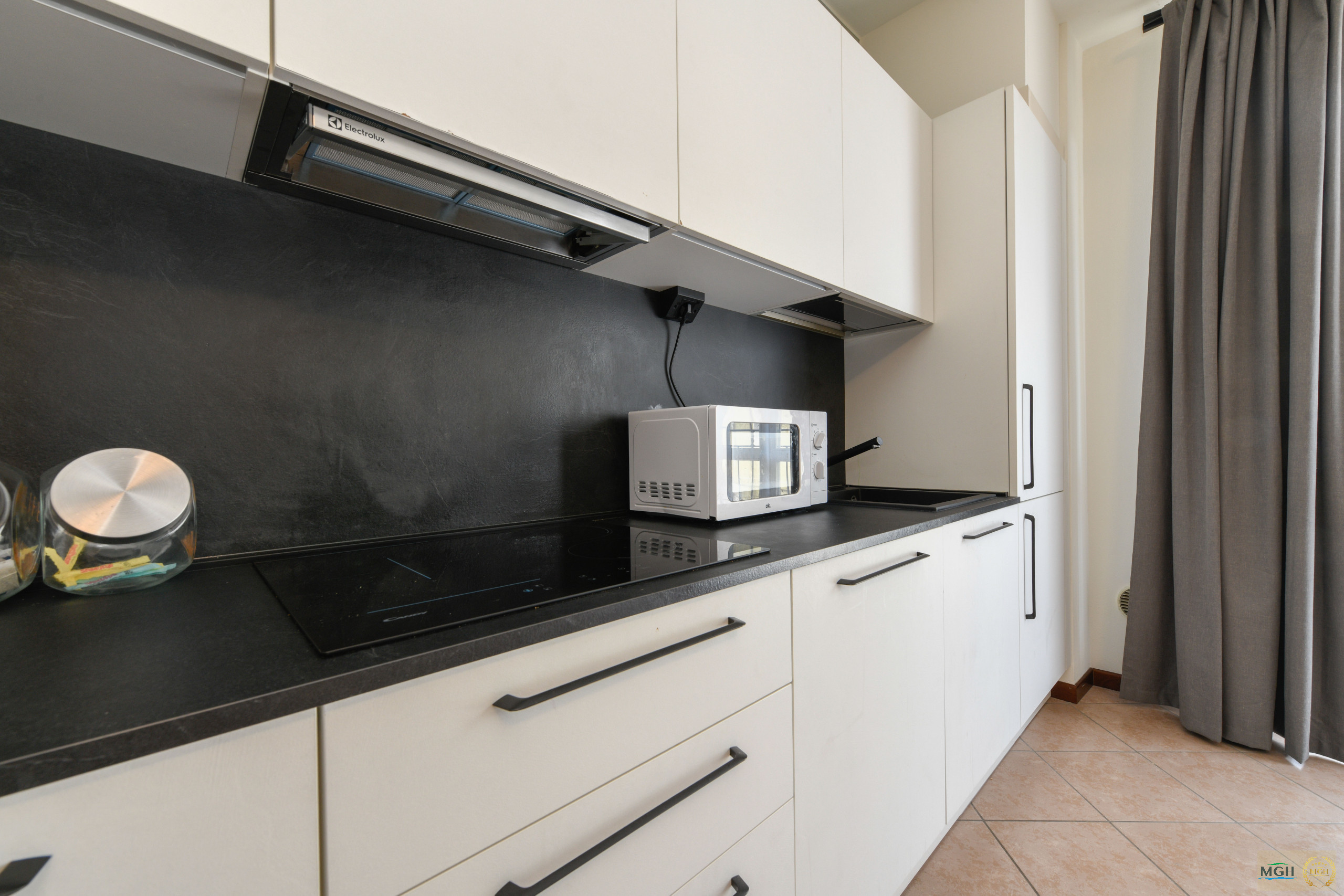 Die Einbauküche ist komplett ausgestattet: Induktionsherd, Kühlschrank mit Gefrierfach, Backofen, Mikrowelle, Geschirrspüler, Geschirr, Utensilien und Kaffeemaschine — alles Notwendige, um sich wie zu Hause zu fühlen.