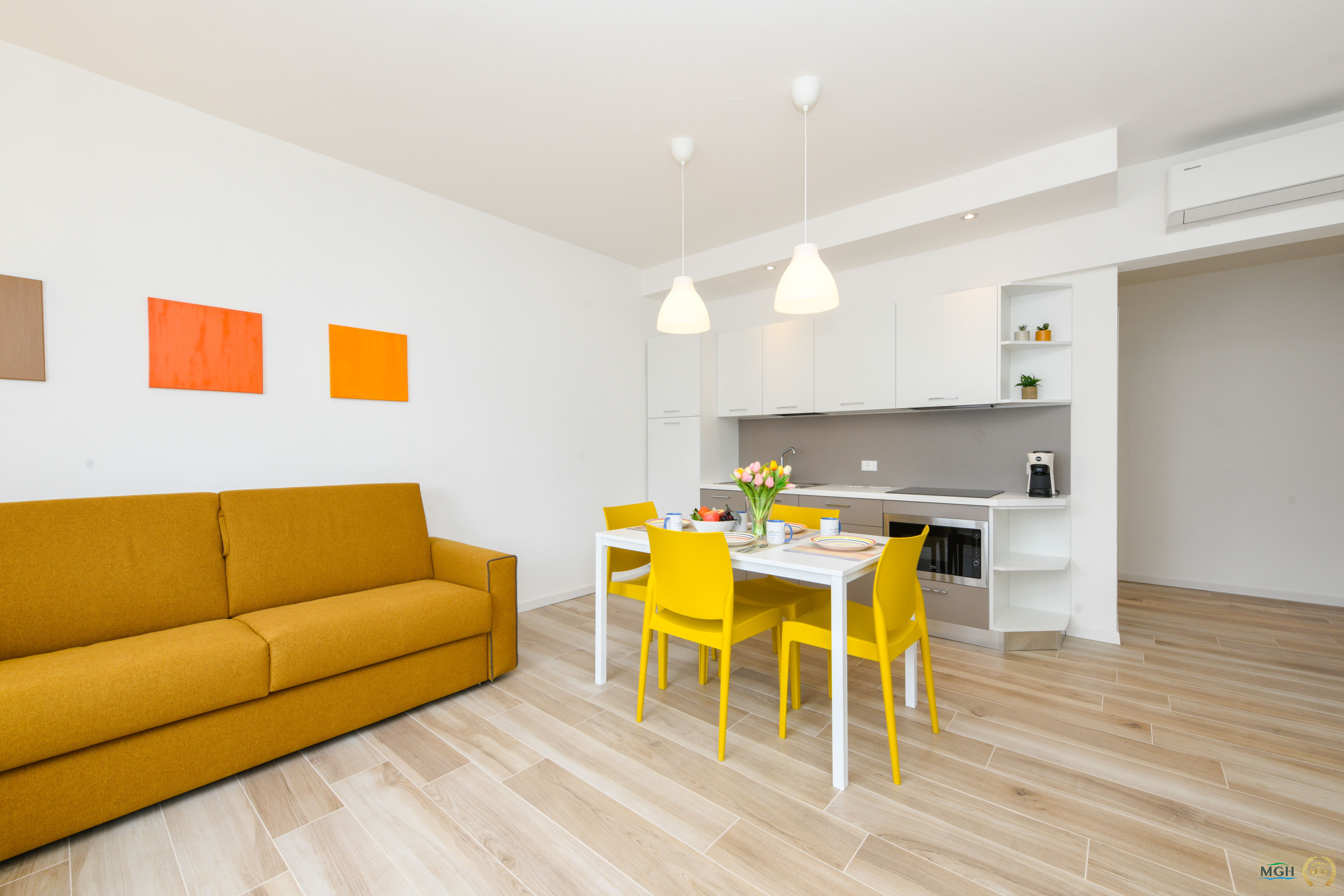 The accommodation offers a double bedroom overlooking the lake, a bathroom with shower, hairdryer and all the necessary accessories, as well as a cosy and panoramic living area with a double sofa bed. The kitchen, fully equipped with induction hob, oven, microwave, dishwasher, fridge with freezer, kettle, toaster and coffee machine, is perfect for those who like to cook even on holiday.