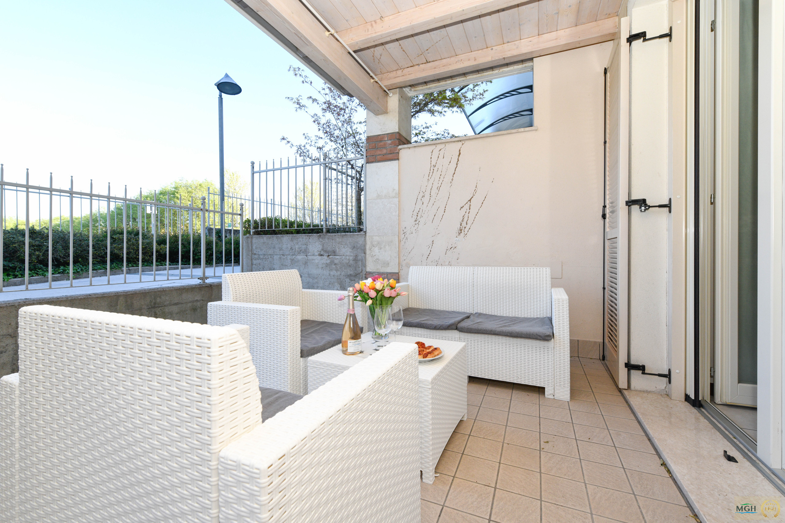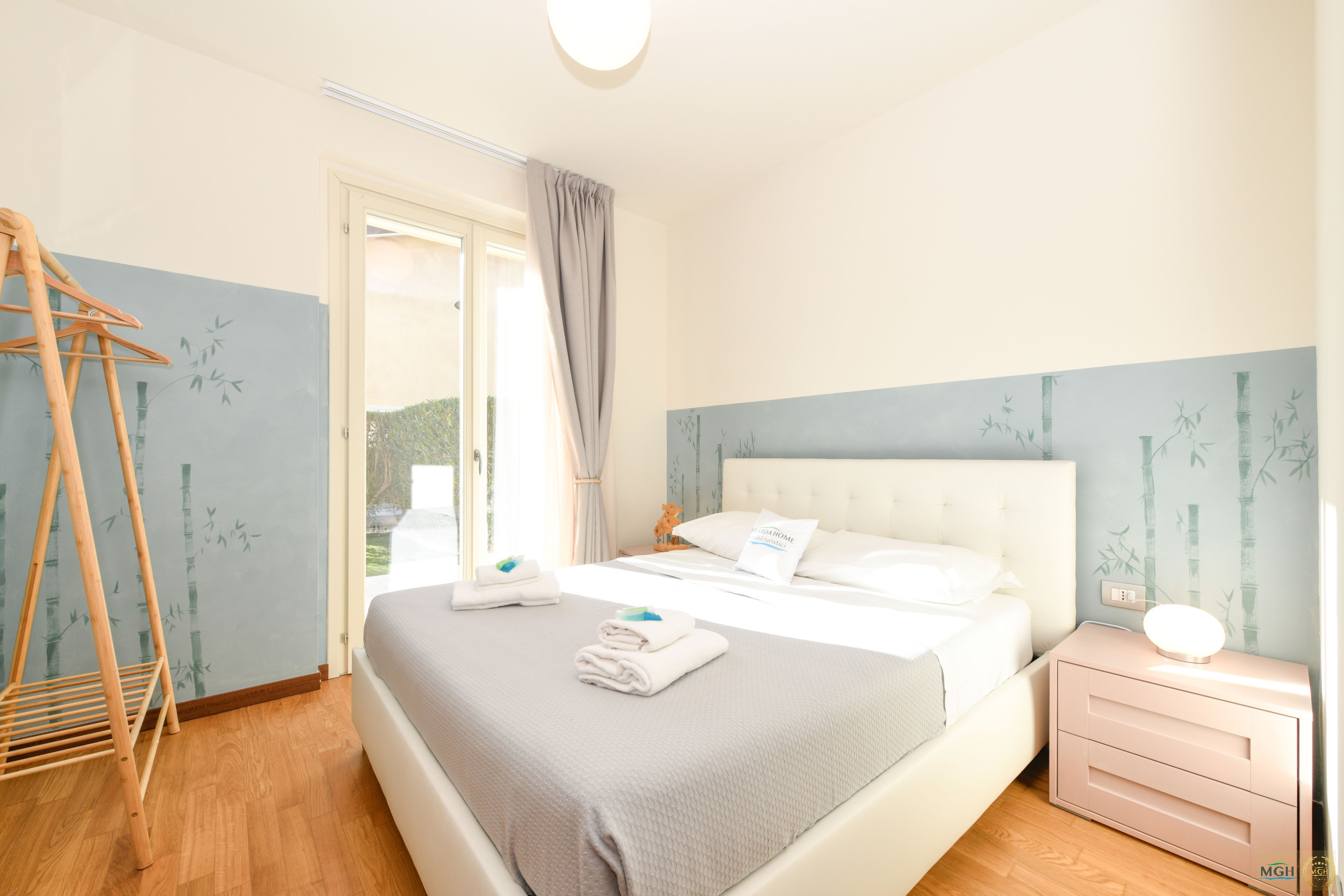 The apartment is developed on a single ground floor level and is designed to offer comfort and functionality. It has two bright double bedrooms, furnished in modern style, both with direct access to the rear garden, perfect for moments of tranquillity in the open air.