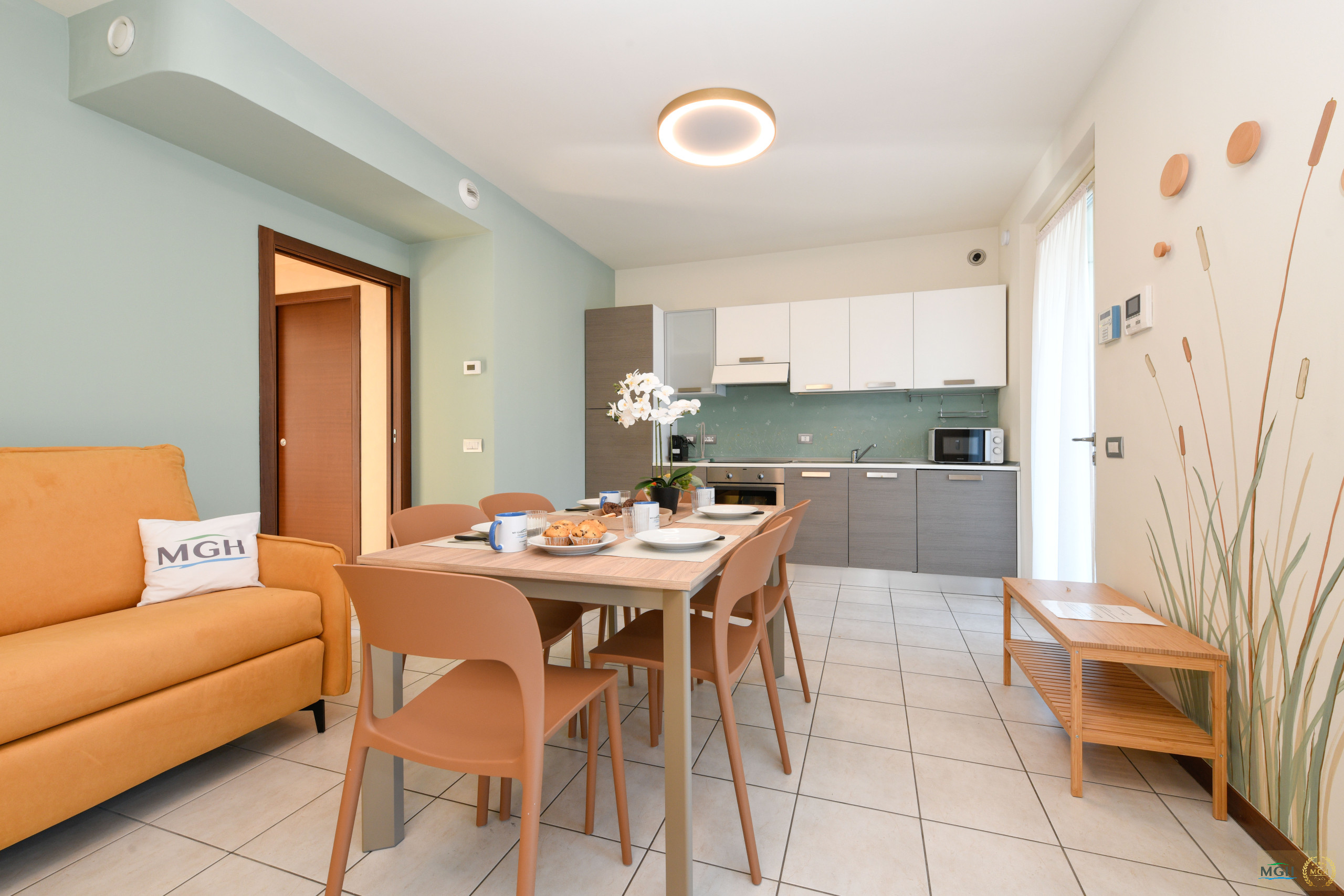 The living area is spacious and welcoming, with a large sofa bed, flat-screen TV and a fully equipped open-plan kitchen with refrigerator, freezer, induction hob, oven, dishwasher, kettle, toaster and coffee machine. The space is completed by a dining table ideal for sharing pleasant moments with company.