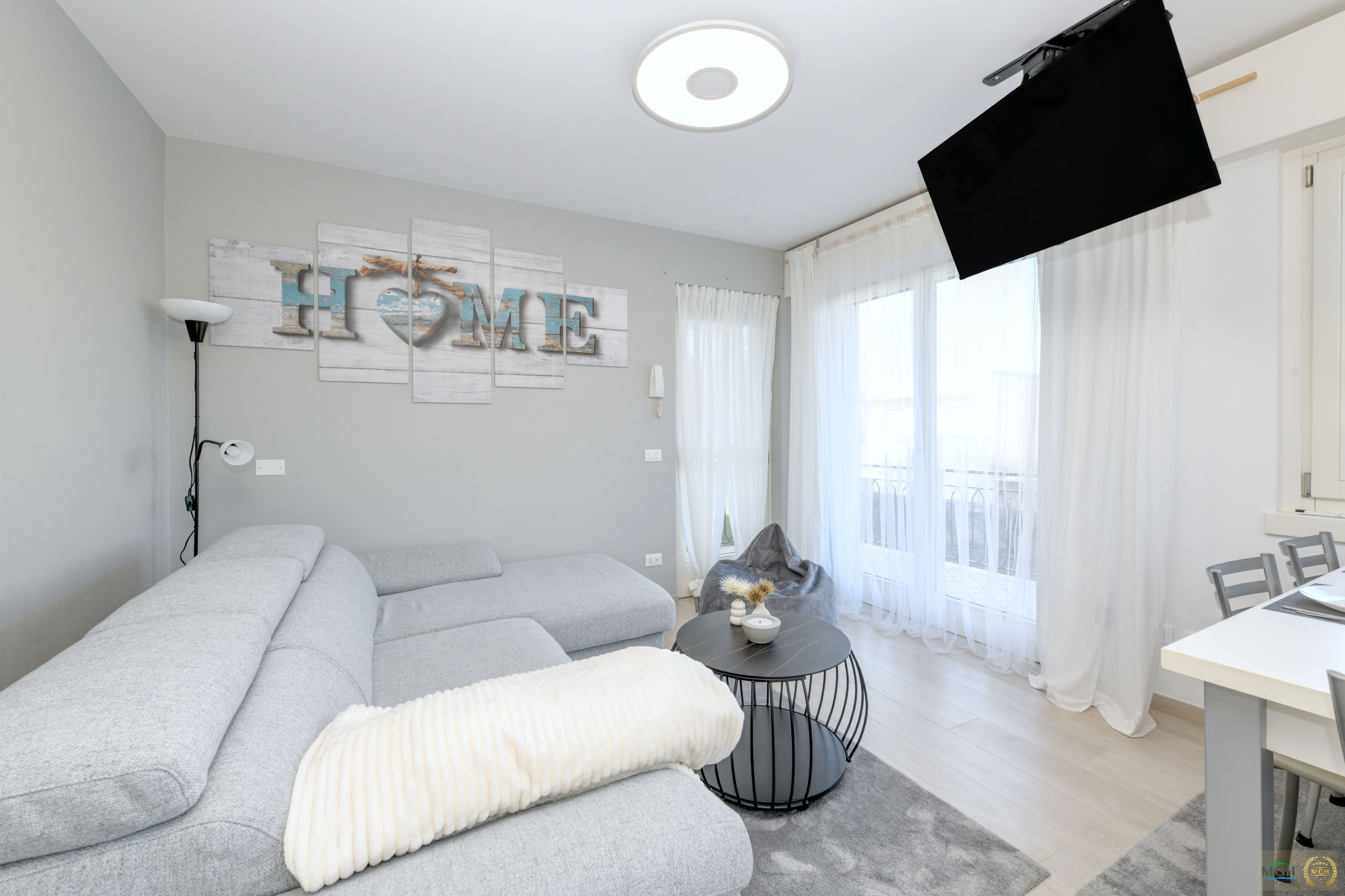 The living room is spacious and bright, with a large sofa ideal for relaxing and a flat-screen TV.