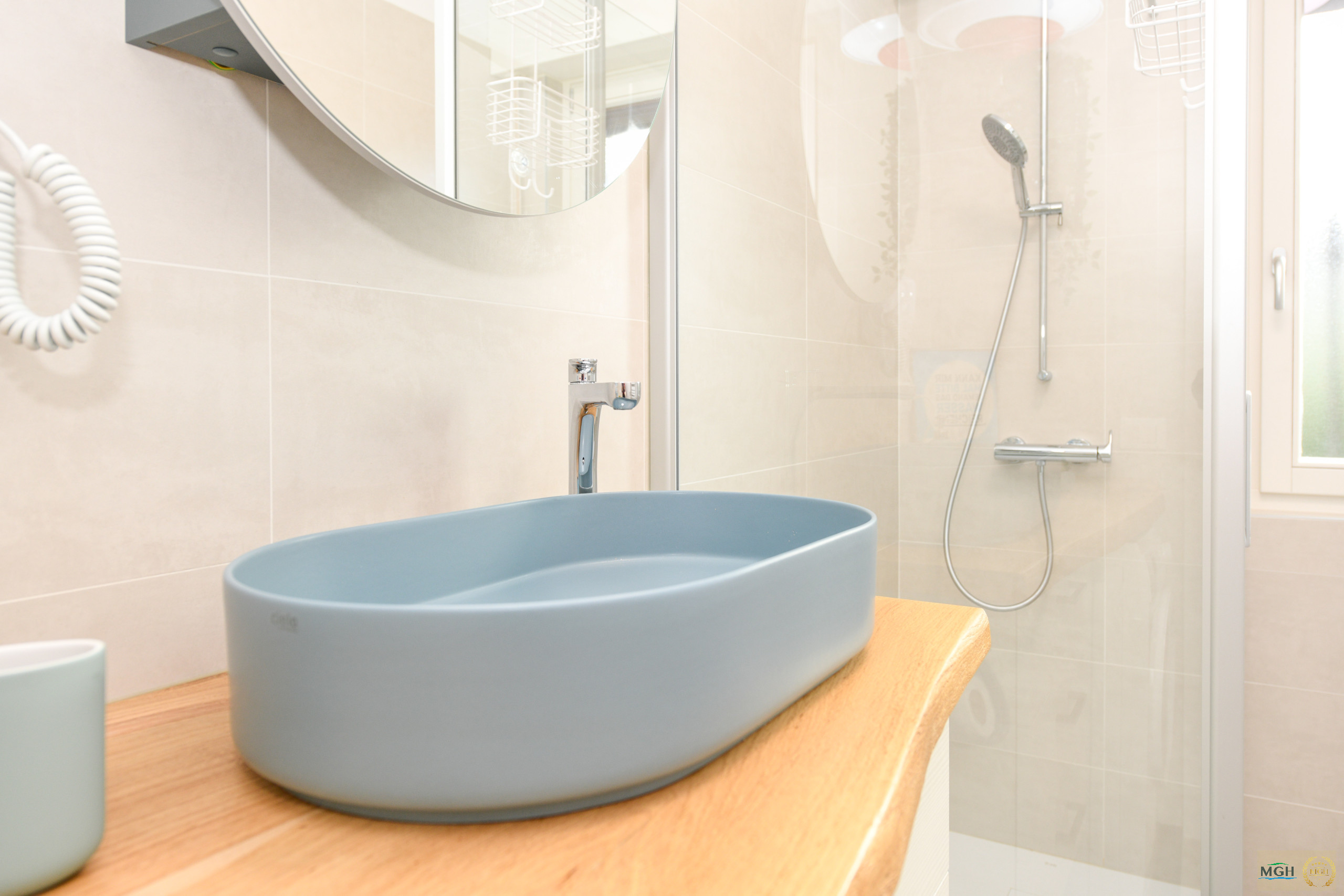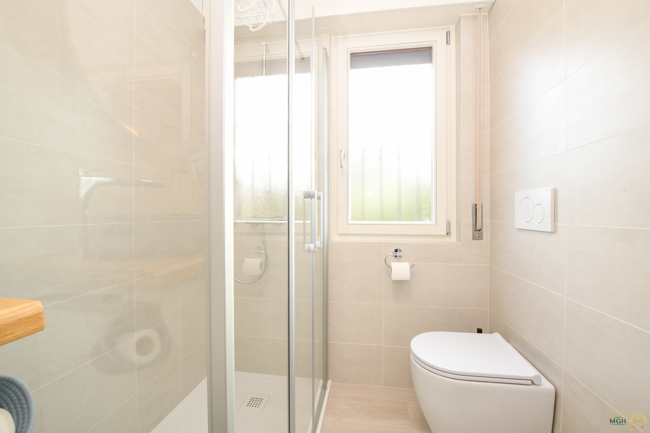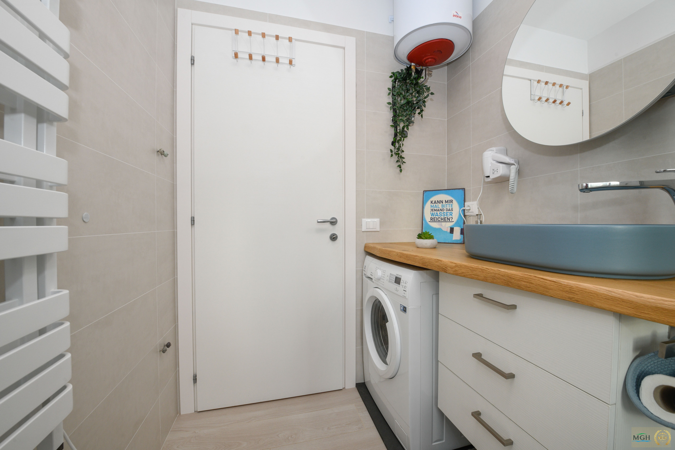 A modern bathroom is present, equipped with a shower, WC and washing machine, furnished with taste and practicality.
