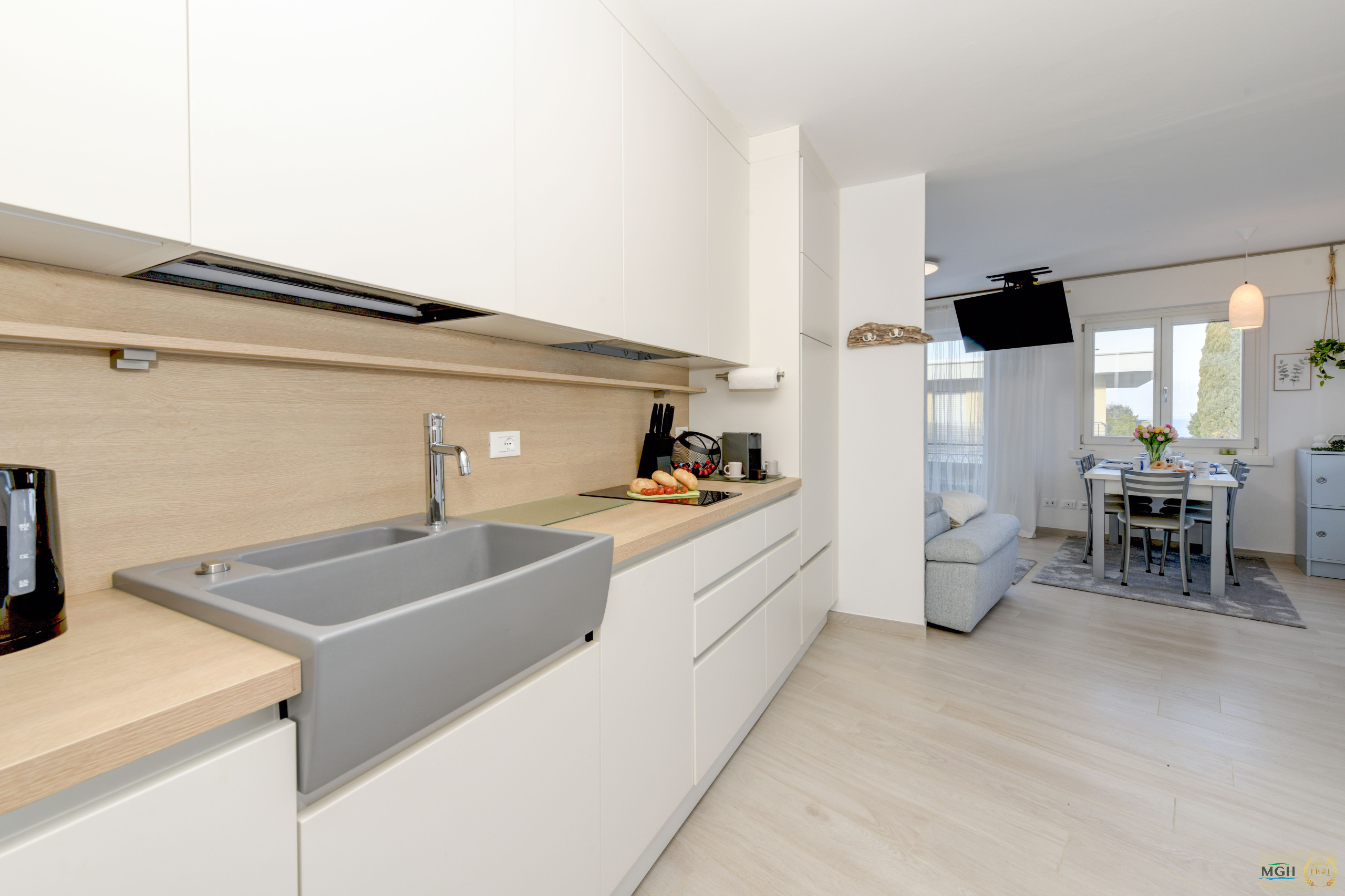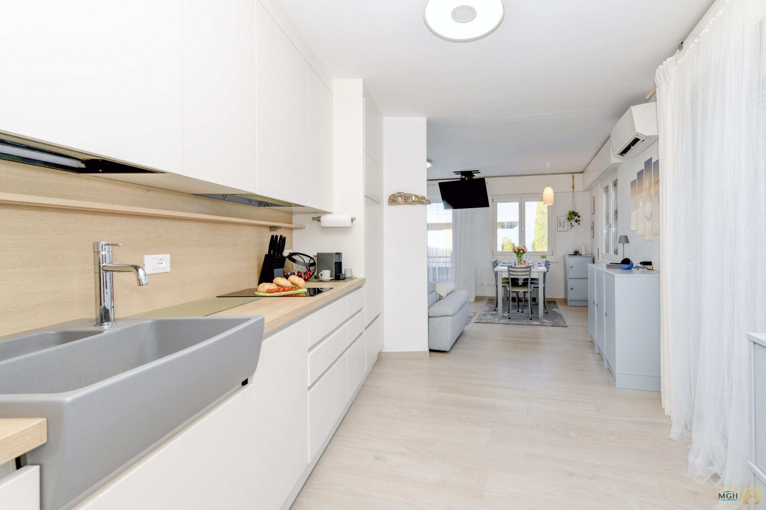 The induction kitchen is fully equipped with a microwave, dishwasher, refrigerator with freezer, coffee machine, toaster, kettle, citrus juicer and all the necessary utensils to feel at home.