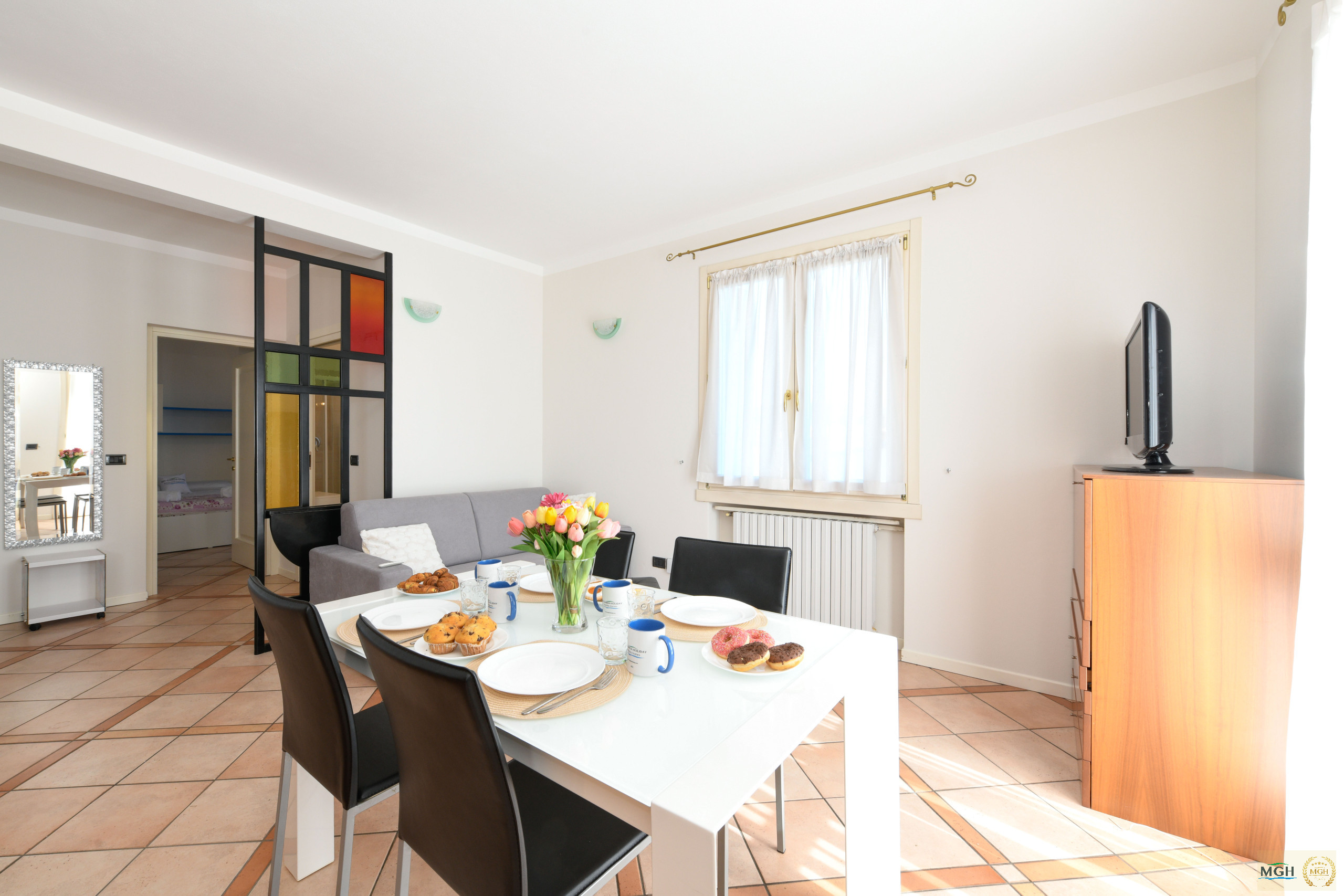 The living area is bright and welcoming, with an open-plan kitchen fully equipped with a fridge with freezer, dishwasher, hob, coffee machine, toaster, kettle and all the utensils necessary for cooking in complete autonomy. The space is completed by a living area with sofa and TV and dining table.