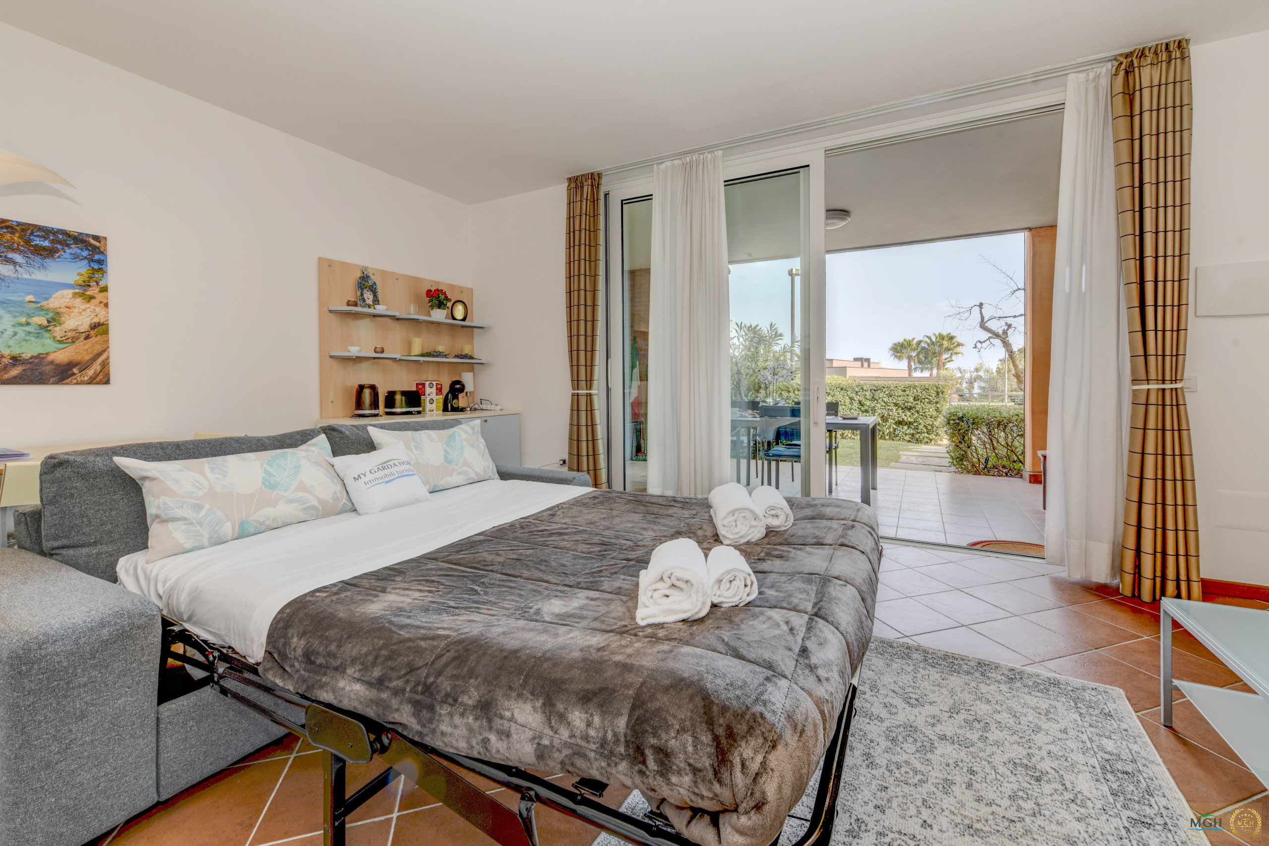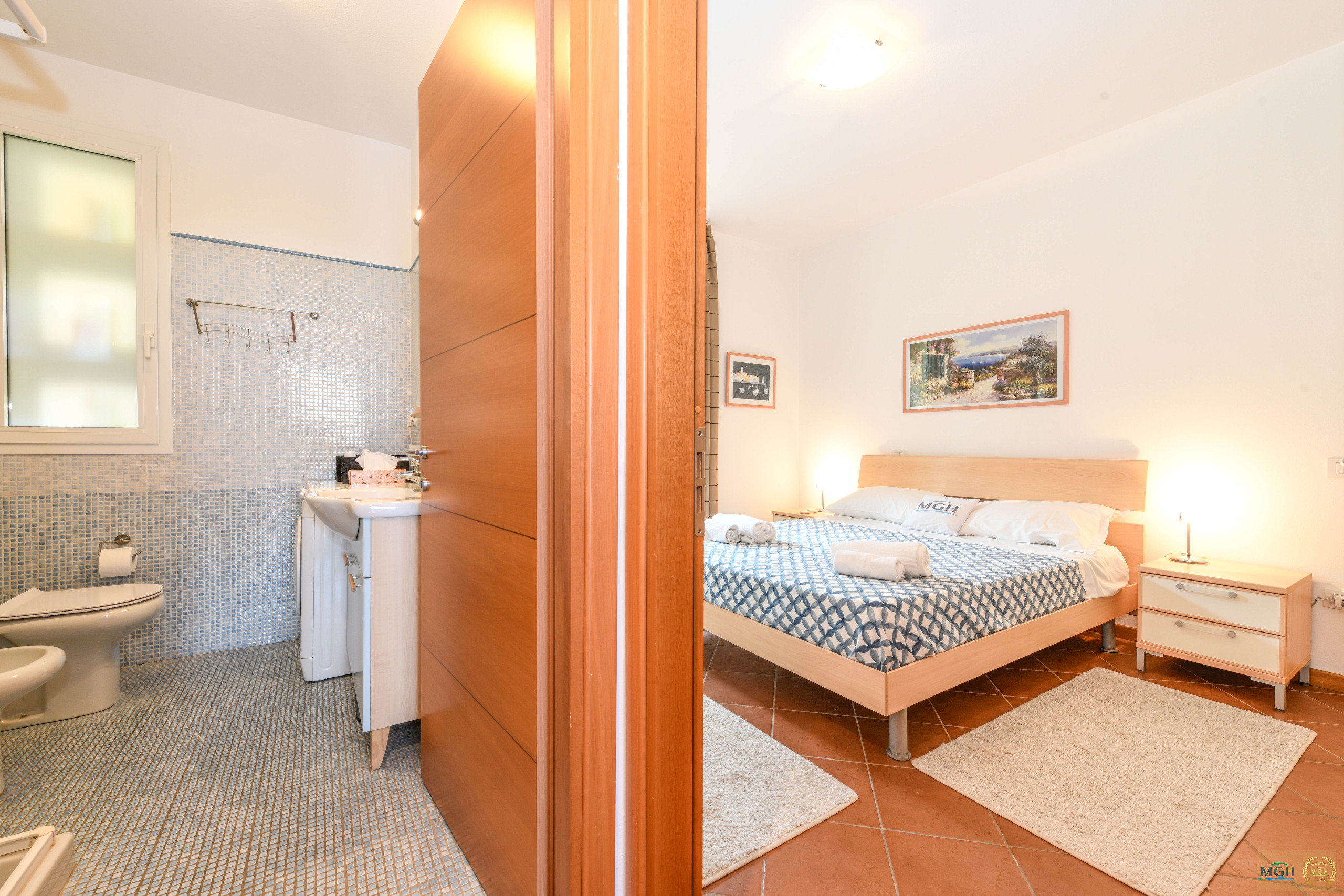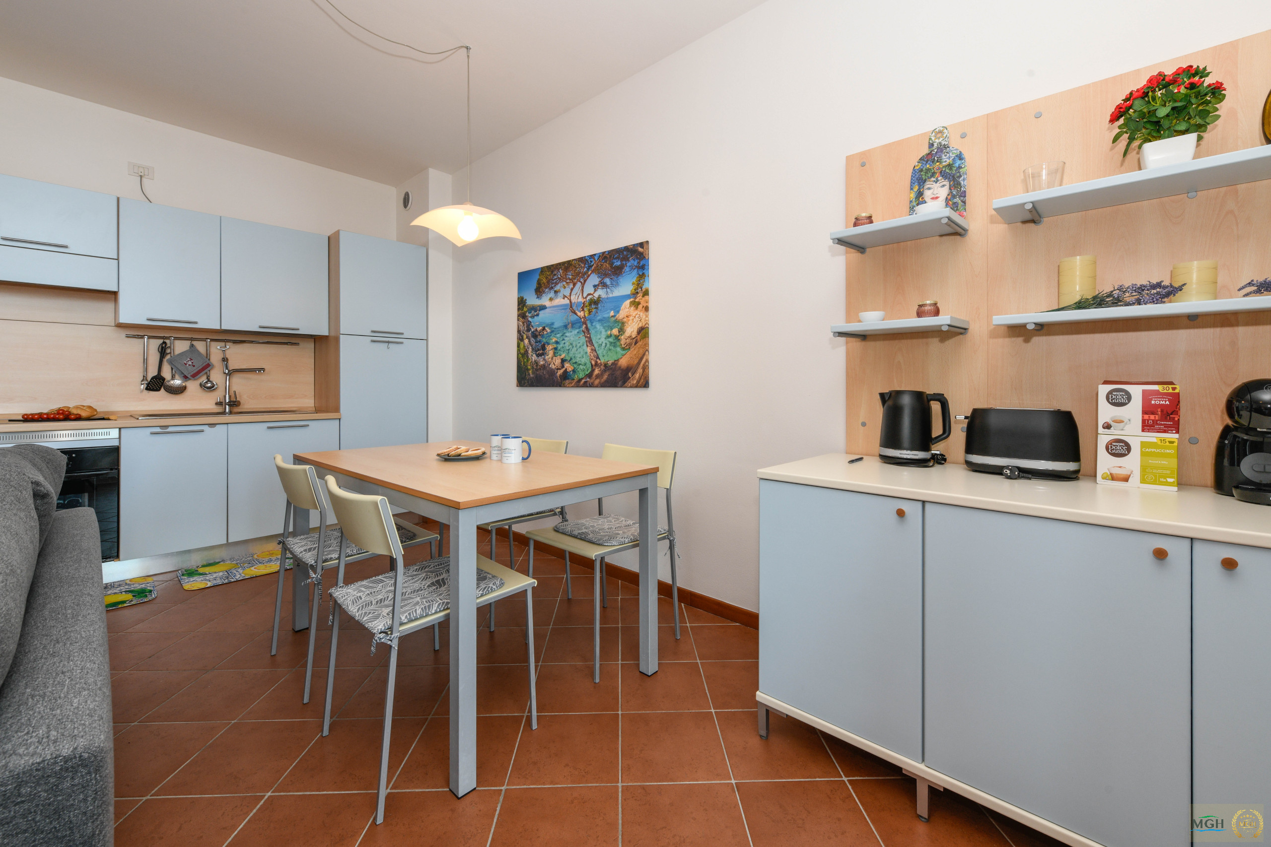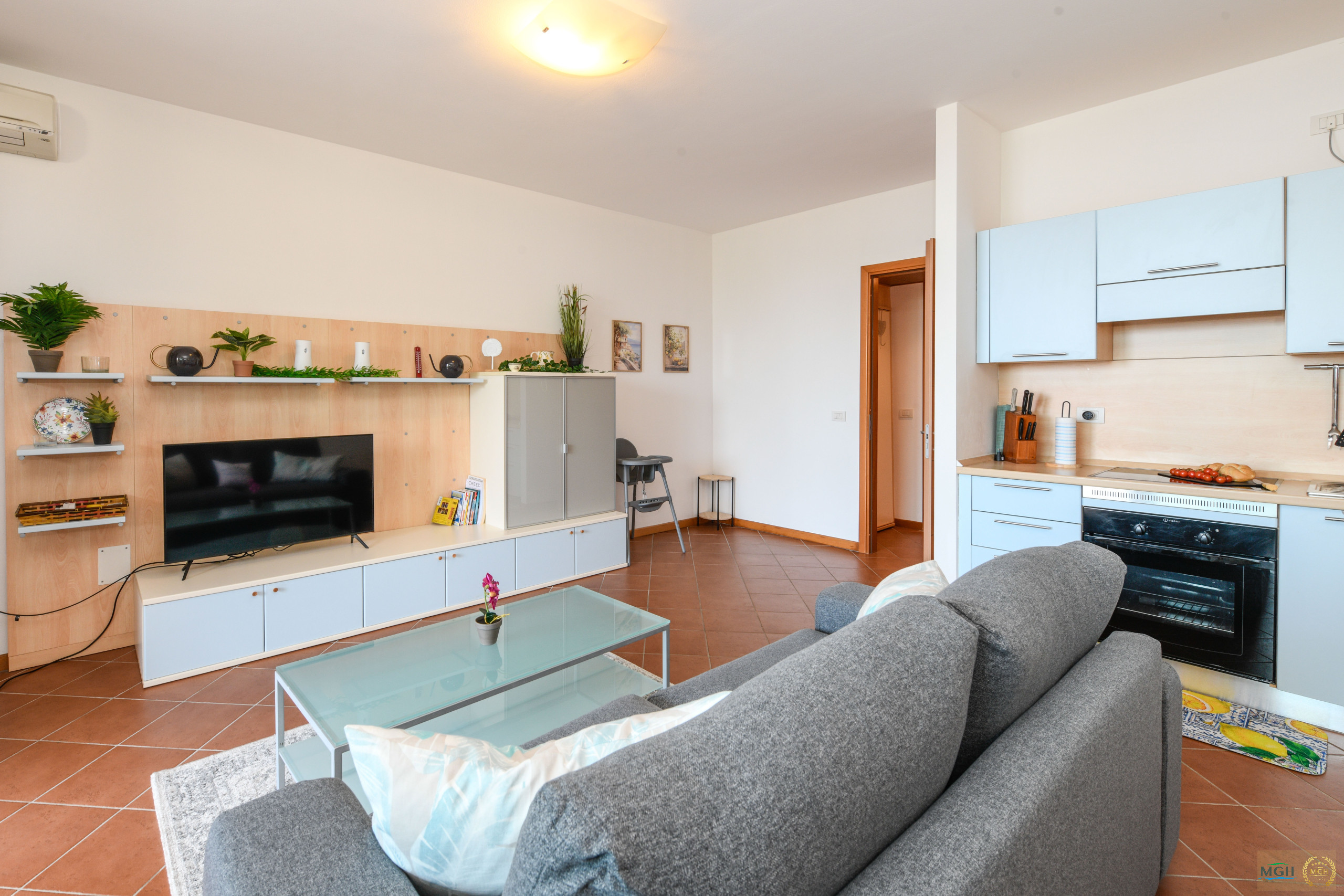 The interiors are well-designed and functional: the bright living area consists of a welcoming living room with a double sofa bed and a flat-screen TV, as well as a fully equipped kitchen with an induction hob, oven, refrigerator with freezer, coffee machine, kettle, toaster and all the necessary utensils for cooking.