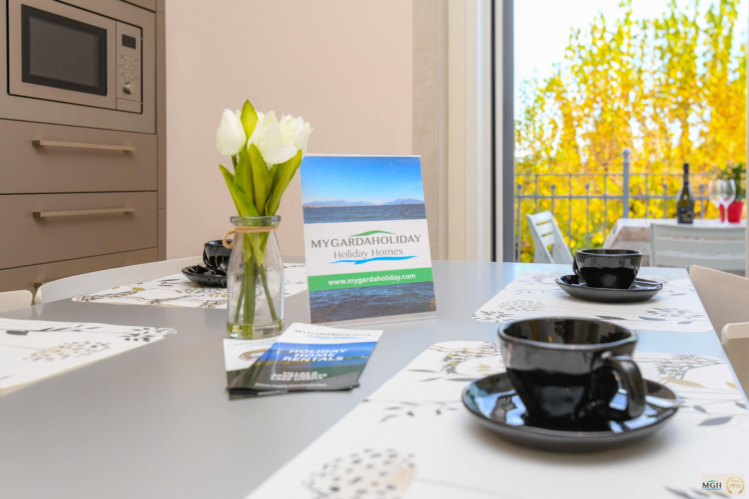 The fully equipped kitchen includes a dishwasher, induction hob, fridge with freezer and a microwave with oven function. The dining area overlooks a spacious terrace where you can dine al fresco and catch a glimpse of the lake through the trees.