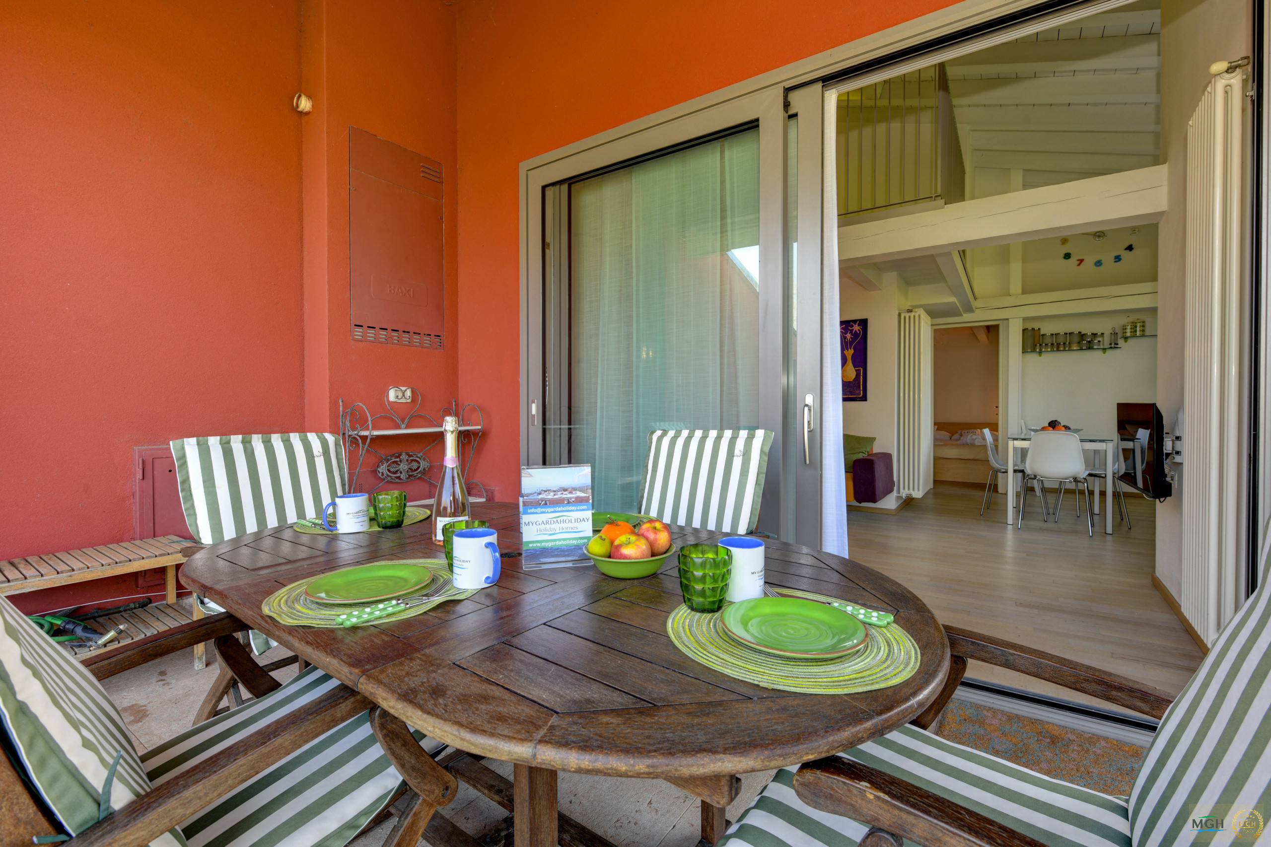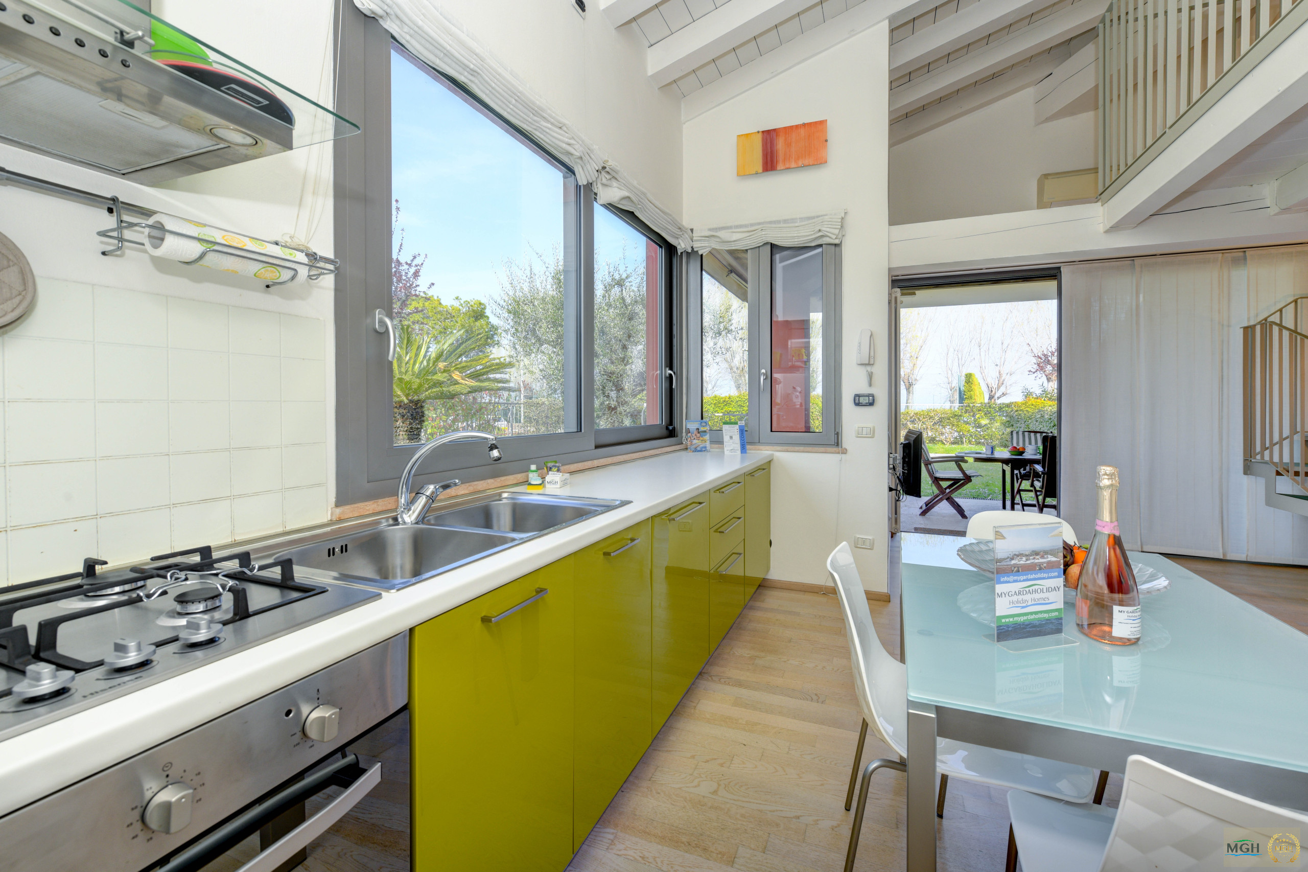 A staircase leads to the gallery. Here there is a gallery room, a WC and another double bed as well as cupboard space. The apartment has all the comforts: air conditioning, Wifi, dishwasher, washing machine and private garage.