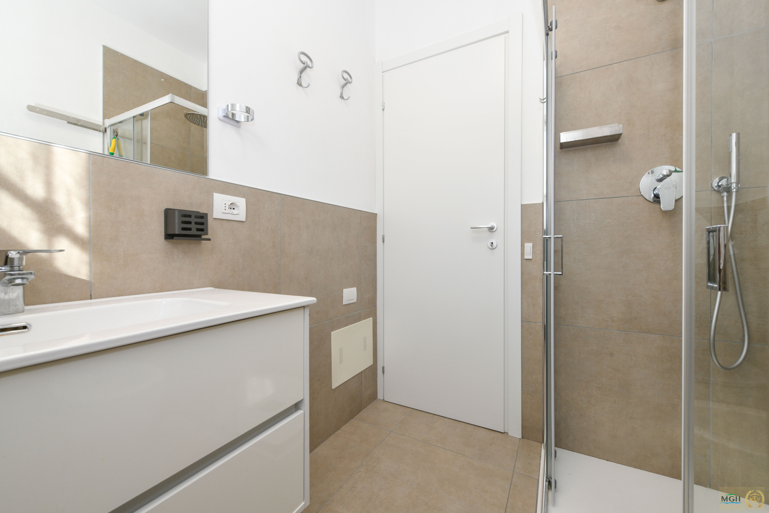 All spaces are air-conditioned with hot/cold systems, ensuring a comfortable stay in every season. The apartment also has a private garage that is easily accessible. The garage, illuminated throughout the night, is equipped with a washing machine, sink, mirror, table and shelves, offering a practical laundry area.