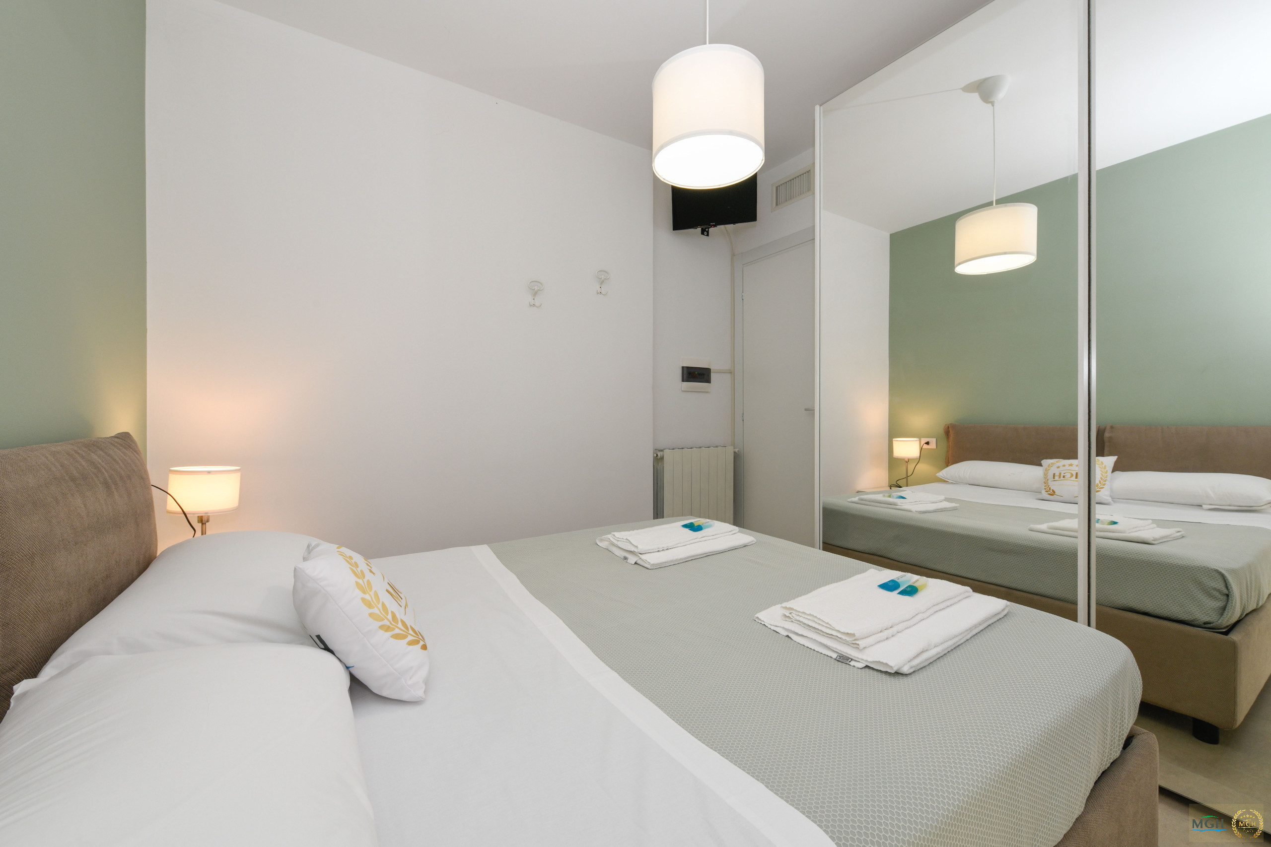 The night area hosts an elegant and quiet double bedroom, overlooking the greenery through a French window that provides a pleasant natural brightness. Here too, a satellite TV is available for maximum comfort. The windowed bathroom, equipped with a practical walk-in shower, is flanked by a convenient storage room that helps to keep the spaces tidy and functional.
