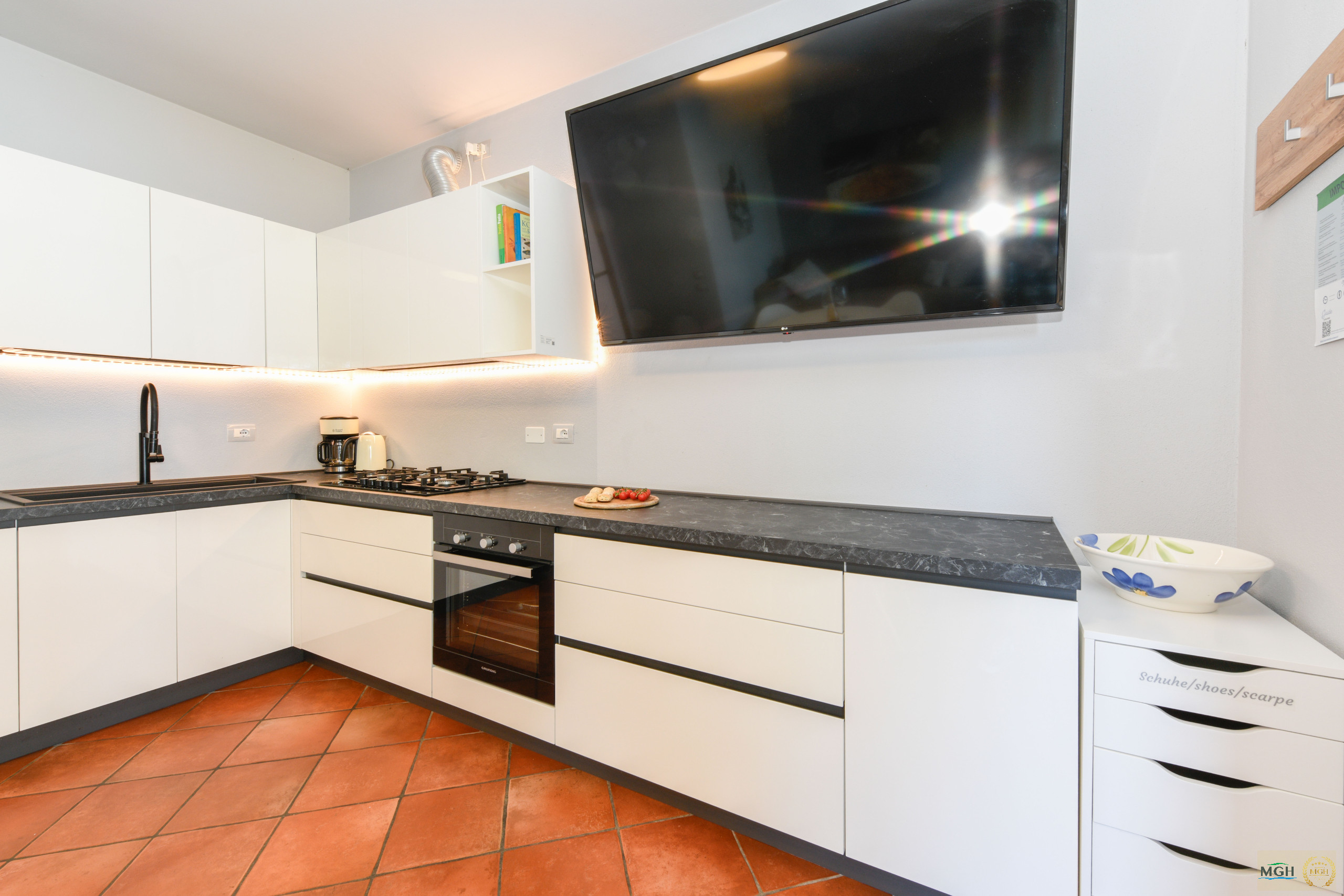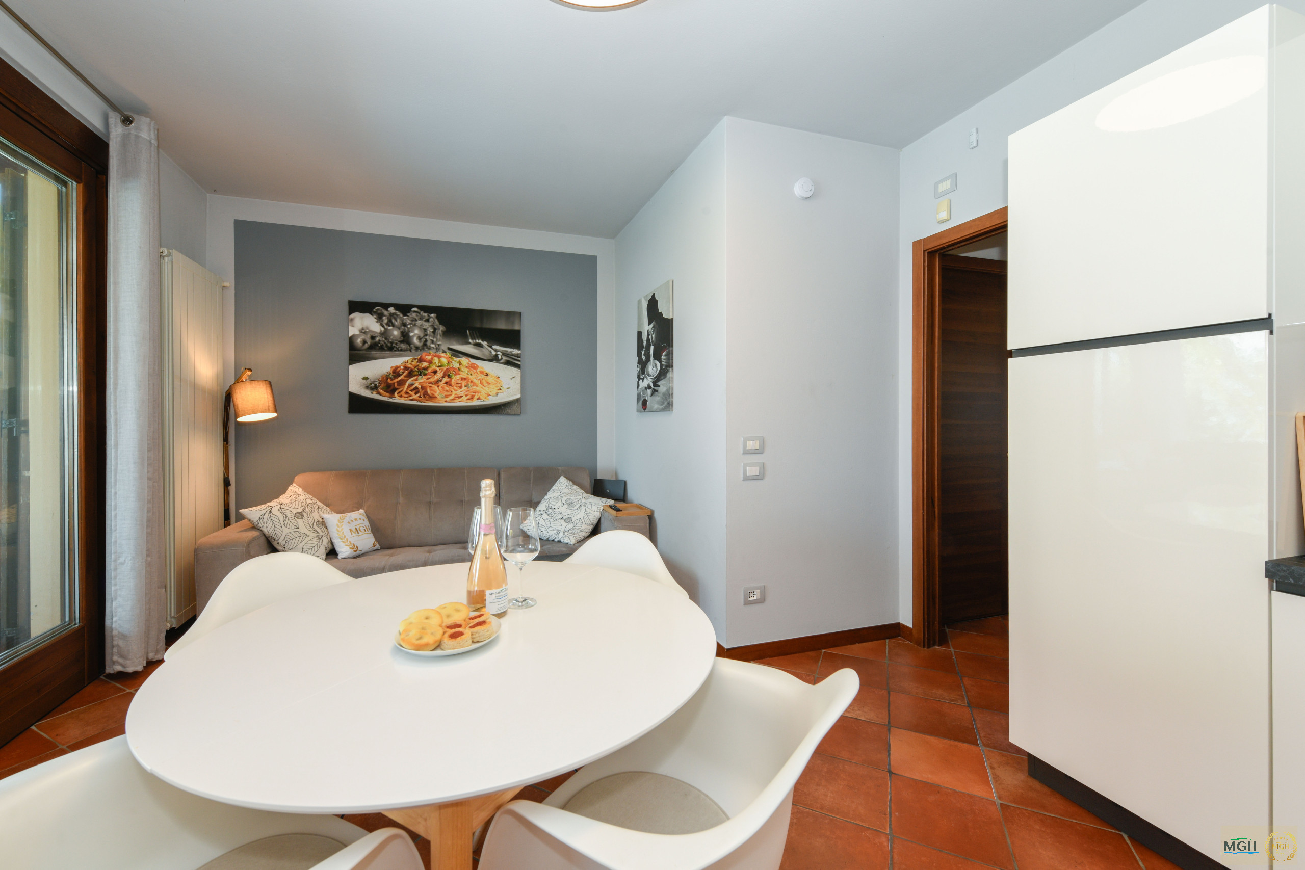 The living area features a large window front that offers full views of Lake Garda and Sirmione Peninsula. From here you can also enter the apartment's living terrace, which becomes an enlarged living room in the summer. Inside you will find a comfortable sofa, a large smart TV with international programs, a dining area and a fully equipped kitchen with dishwasher, toaster, coffee maker, kettle, oven and gas stove, refrigerator with freezer and all utensils For the preparation of delicious food.