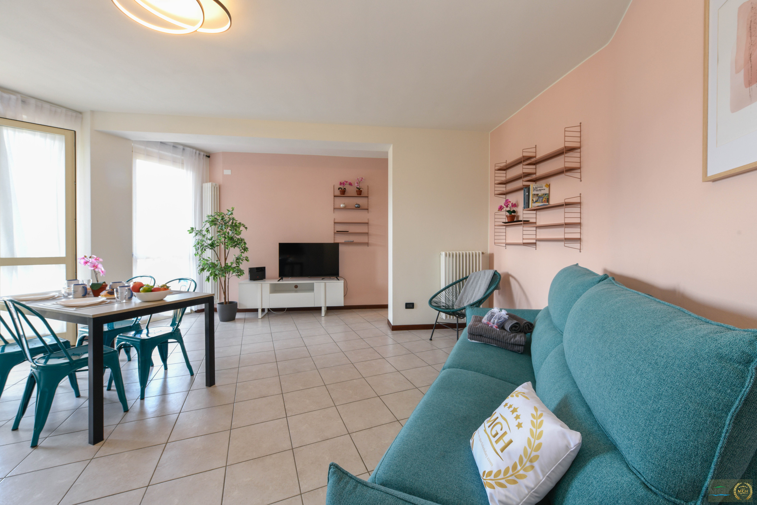 The environments, furnished with contemporary taste, include a bright double bedroom and a living room with a sofa bed and flat-screen TV, comfortably accommodating up to 4 people. The bathroom is modern and equipped with a washing machine.