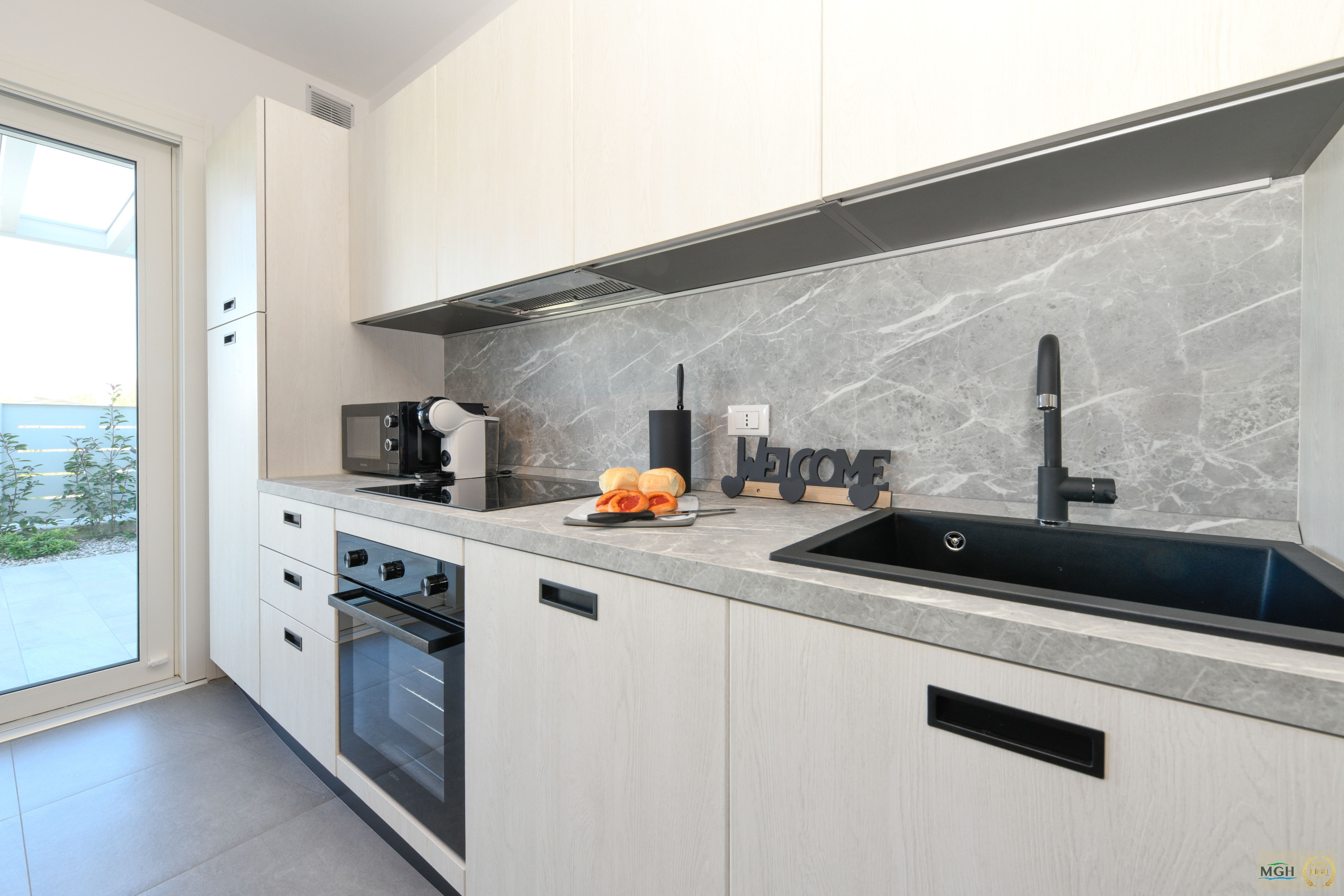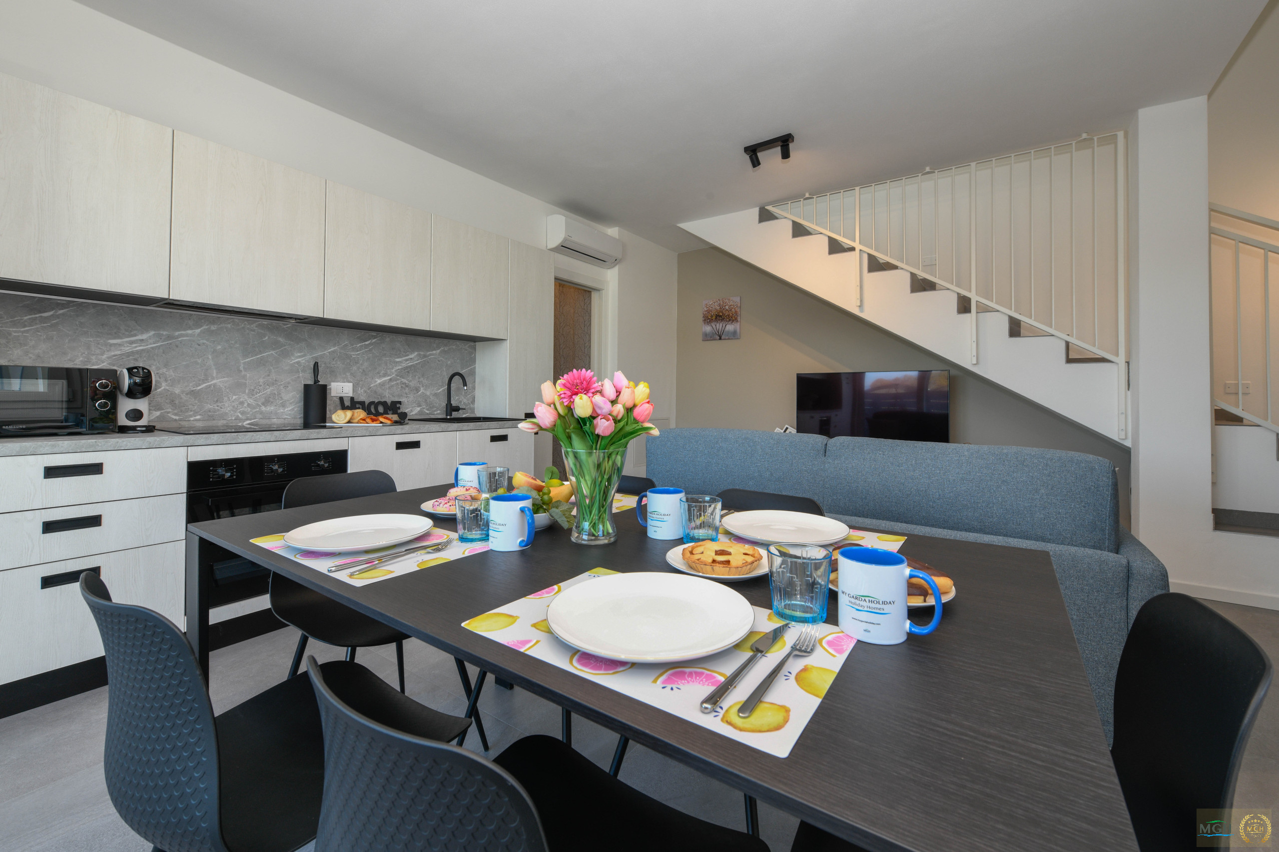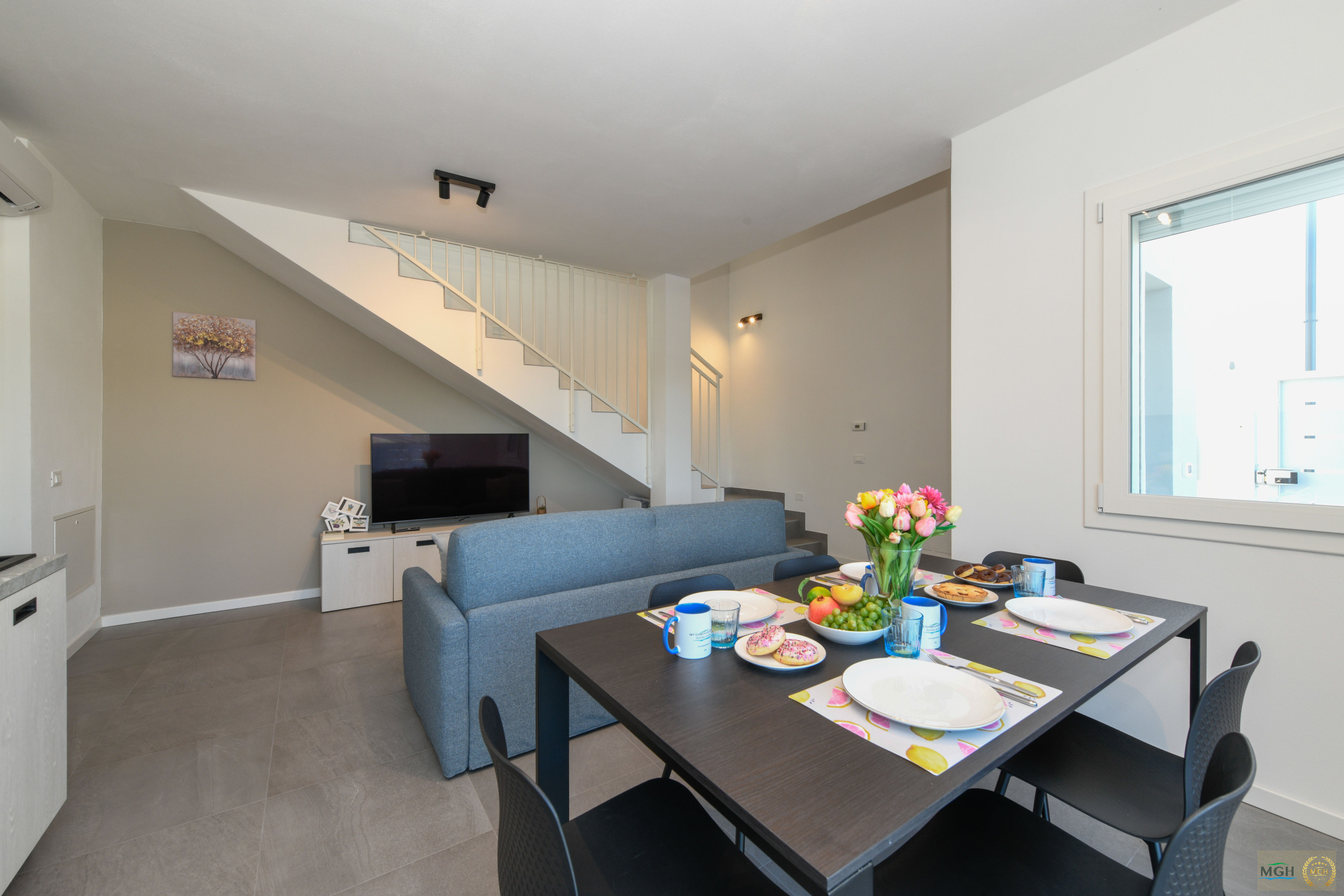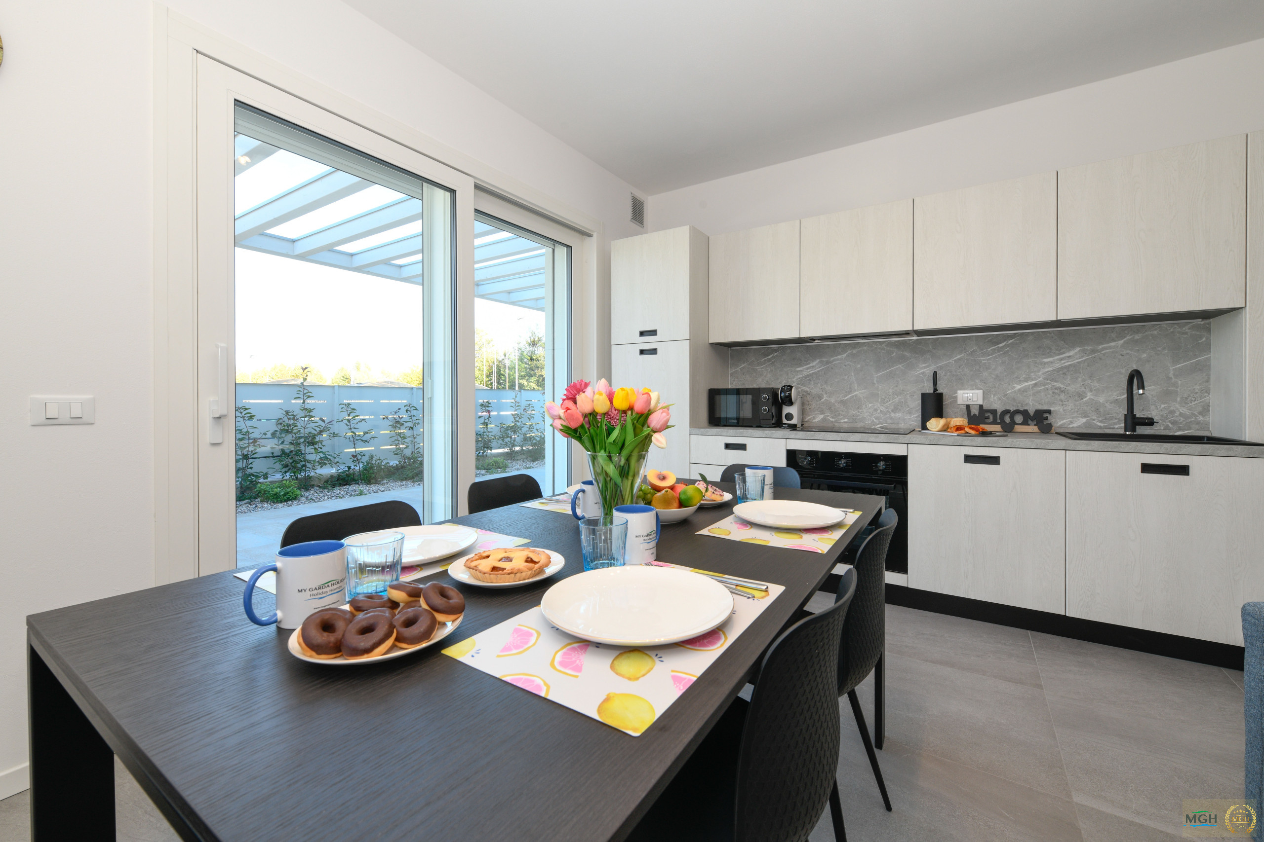 On the ground floor, there is a cosy living room with a double sofa bed, a large flat-screen TV, dining table and a fully equipped modern kitchen, complete with all appliances, including a dishwasher. From here, you can access a spacious pergola, perfect for conveniently parking the car, and a pleasant garden furnished with a dining area and relaxation zone, ideal for relaxing outdoors.