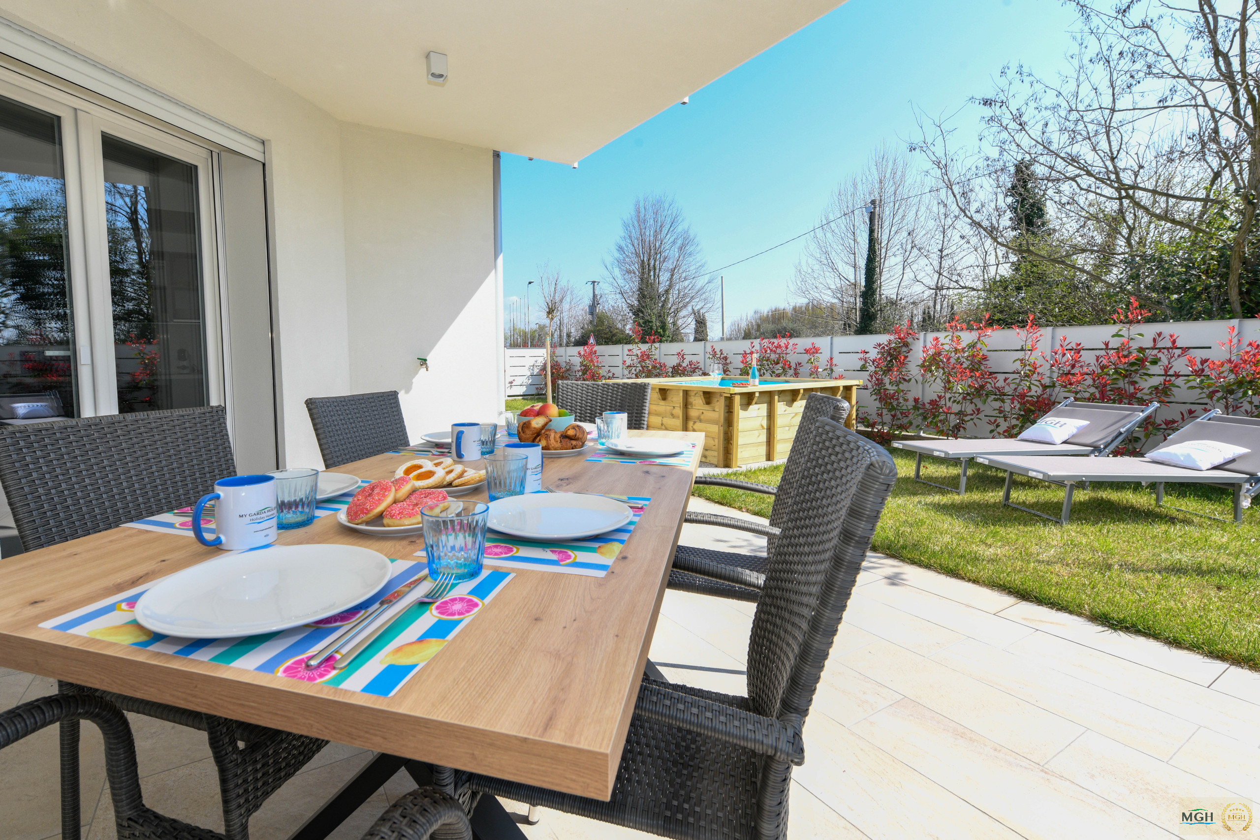 On the ground floor, a spacious and welcoming living area develops, where the living room with sofa bed and large flat-screen TV harmoniously integrates with the modern kitchen, equipped with all necessary appliances, including the dishwasher. From here, you can directly access the private garden, a well-maintained and pleasant space, furnished with a dining area and relaxation zone ideal for enjoying outdoor moments in total tranquillity, and there is also a PRIVATE swimming pool. Also on the ground floor, there is a first complete bathroom, equipped with shower, bidet, hairdryer and all comforts.